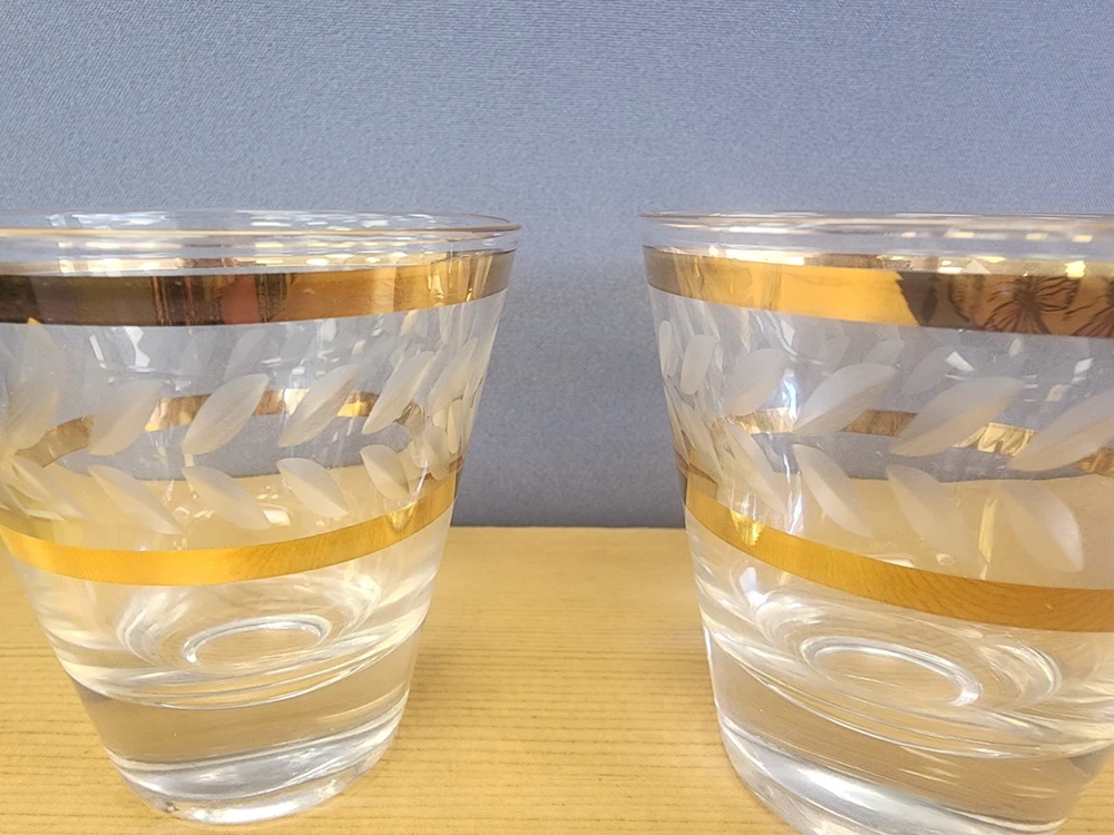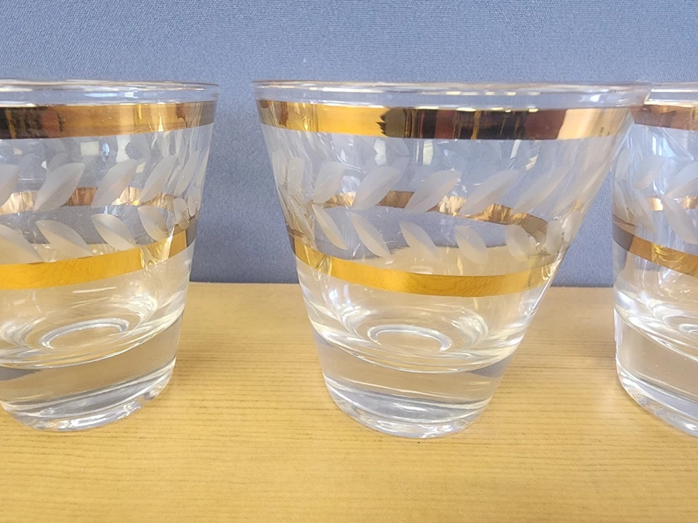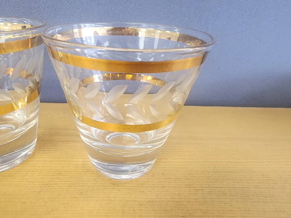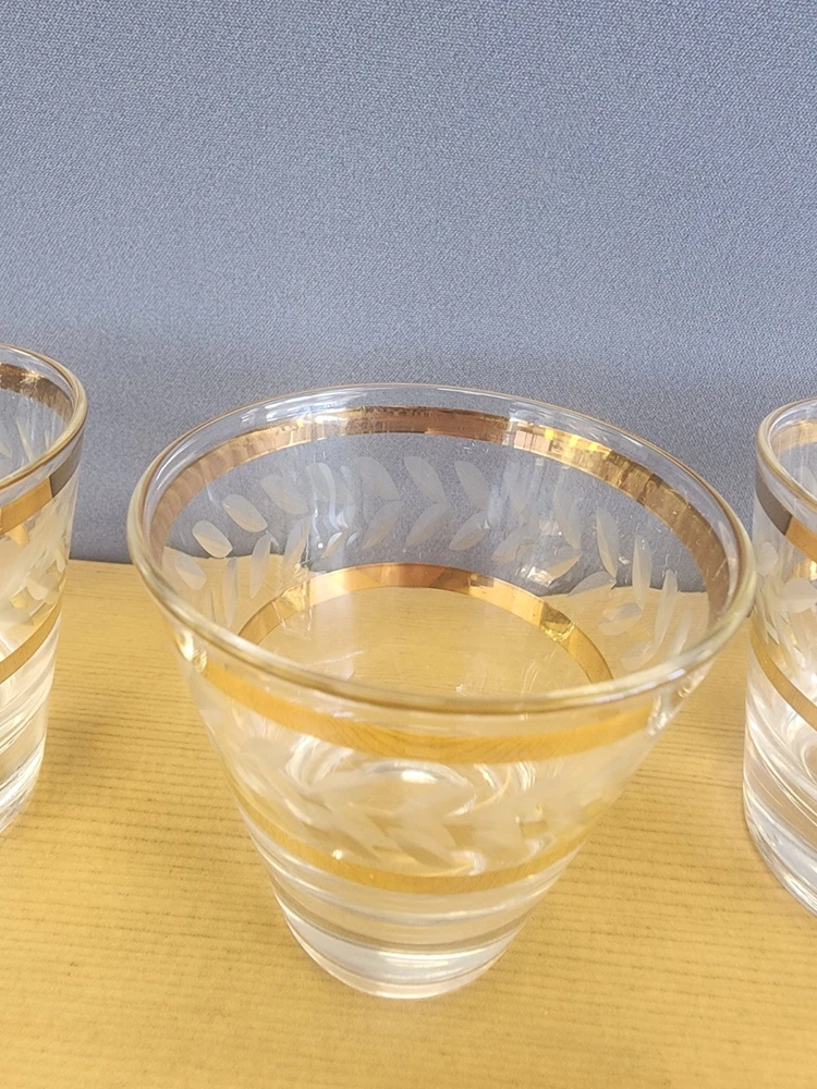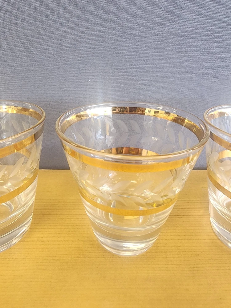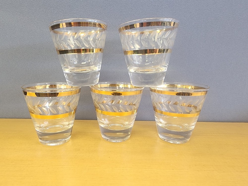 5 MCM Elegant Gold-Trimmed Etched Barware Glasses Lowball Water Glasses