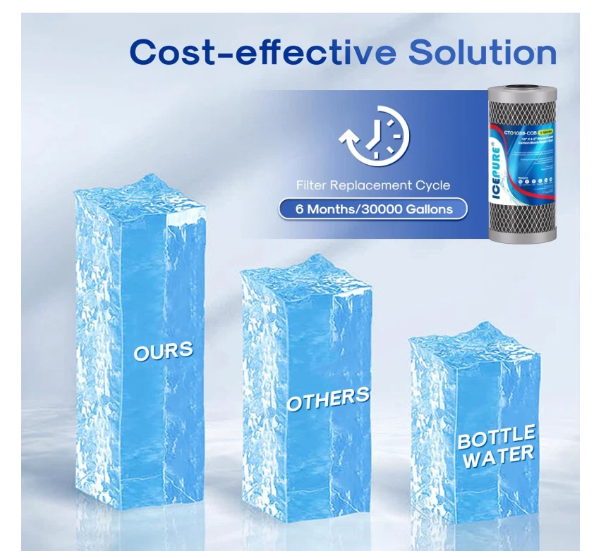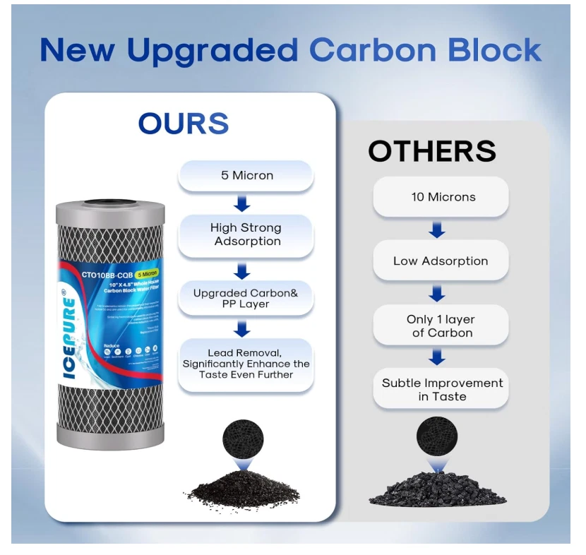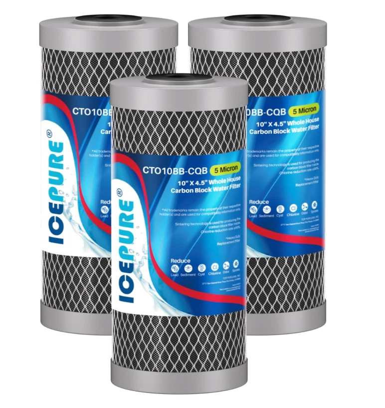Upgraded Premium Carbon Block – ICEPURE whole house carbon block has upgraded, and its special formula enhances adsorption and filtration performance,to remove many harmful substances you worry about lead, chlorine, odor, Cyst, Dust, Sand and impurities, Reducing your concerns about chlorine, Chloramine and heavy metals lead. Efficient Filtration - This filter is made with innovative Sintering Technology, which helps to remove Chlorine, Lead and other impurities. This filter can remove finer particles and sediment. Delivering cleaner water that tastes great provides a wonderful drinking experience for your whole family. This filter has a life span of up to 30000 gallons depending on your water quality. For optimum performance, we recommend you change the filter every 6 months based on water quality. Superior Material - Our 4.5'' X 10'' whole house enhanced carbon water filter has Durable materials, food-grade, lead-free, and BPA-free. This kind of filter is recommended for tap water filtration. If your water source is well water, this filter may not achieve the filtering effect that you expect, because well water contains large particles such as mud and sands which may clog the filter in shorter time. Easy to Install - Installing and replacing the filter cartridge is incredibly simple and effortless, requiring no tools. It conveniently fits into a variety of filtration systems and can also be used as a standalone cartridge. Regular replacement is recommended to maintain optimal filtration performance. The straightforward process allows you to replace the filter in minutes, ensuring consistent water quality without disruption to your daily routine. High Standards - ICEPURE water filters use US technology and teams. The ICEPURE brand has high requirements for products, and every product that is manufactured must go through 5 inspection and testing stages, ensuring that every product meets our high expectations.