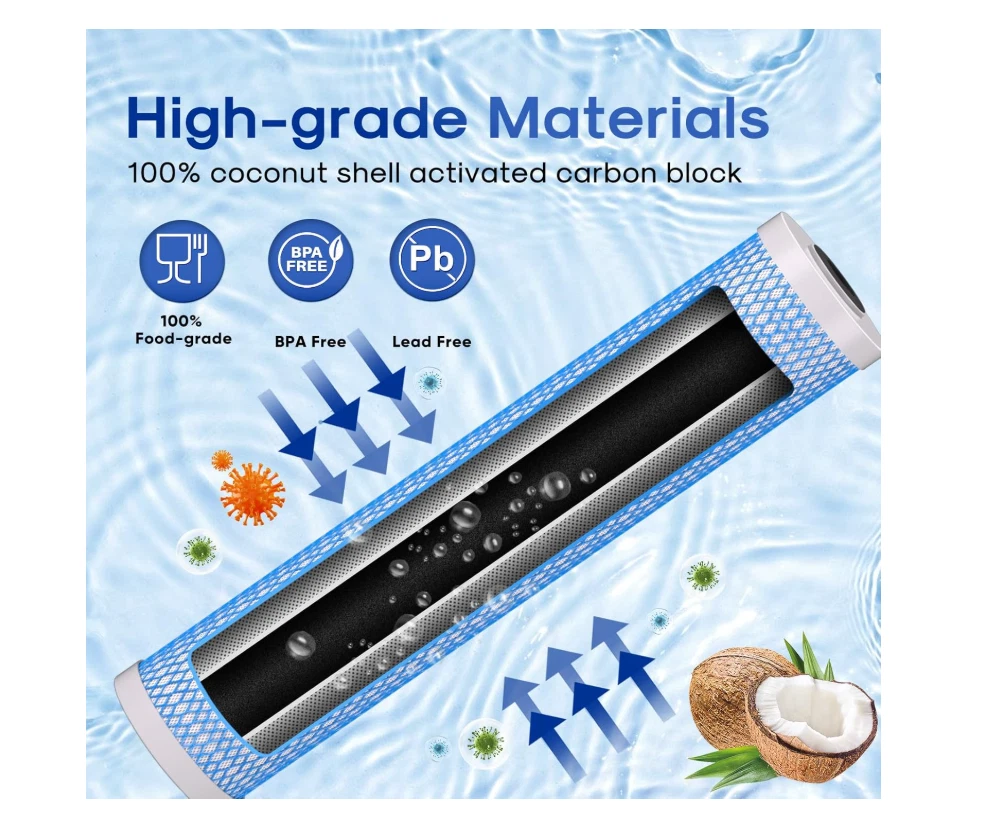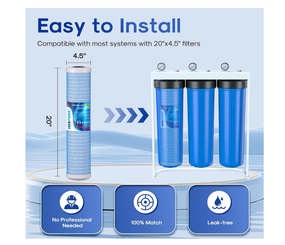 Upgraded Premium Carbon Block – ICEPURE whole house carbon block has upgraded, and its special formula enhances adsorption and filtration performance, to remove many harmful substances you worry about lead, chlorine, odor, Cyst, Dust, Sand and impurities, Reducing your concerns about chlorine, Chloramine and heavy metals lead. Efficient Filtration - This filter is made with innovative Sintering Technology, which helps to remove Chlorine, Lead and other impurities. This filter can remove finer particles and sediment. Delivering cleaner water that tastes great provides a wonderful drinking experience for your whole family. This filter has a life span of up to 100000 gallons depending on your water quality. For optimum performance, we recommend you change the filter every 6-12 months based on water quality. Superior Material - Our 4.5'' X 20'' whole house enhanced carbon water filter has Durable materials, food-grade, lead-free, and BPA-free. This kind of filter is recommended for tap water filtration. If your water source is well water, this filter may not achieve the filtering effect that you expect, because well water contains large particles such as mud and sands which may clog the filter in shorter time. Easy to Install - Installing and replacing the filter cartridge is incredibly simple and effortless, requiring no tools. It conveniently fits into a variety of filtration systems and can also be used as a standalone cartridge. Regular replacement is recommended to maintain optimal filtration performance. The straightforward process allows you to replace the filter in minutes, ensuring consistent water quality without disruption to your daily routine. High Standards - ICEPURE water filters use US technology and teams. The ICEPURE brand has high requirements for products, and every product that is manufactured must go through 5 inspection and testing stages ensuring that every product meets our high expectations.