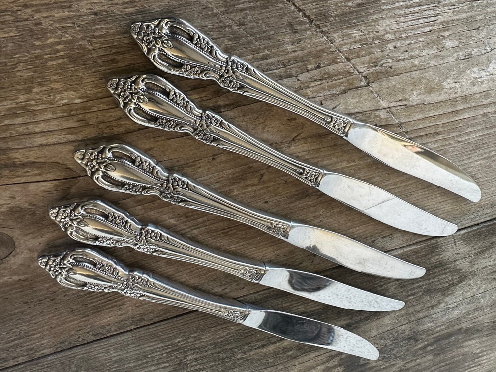 5 Modern Hollow Dinner Knives Raphael Oneida Deluxe Glossy Stainless Floral 9" Light estate wear. In very good condition. Item# 73226 Pattern Code: OHSRAPH Description: Stainless, Pierced Glossy Pattern Number: Pattern: Raphael (Stainless) by Oneida Silver Status: 1974-2004 We have more pieces up for sale in separate auctions. Shelf R