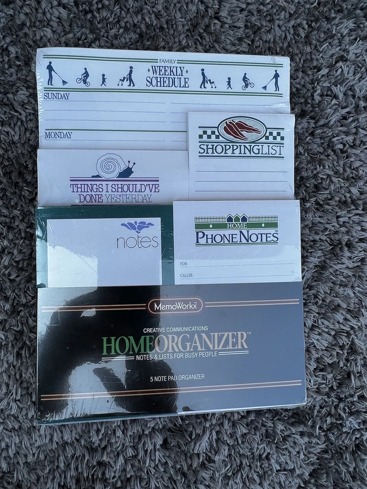 Get organized with this set of 5 MemoWorkx note pads! Perfect for your home or office, each pad is designed for a specific purpose. Keep track of your to-do list, shopping list, phone messages, and weekly schedule. With a traditional style and high-quality paper, these note pads will look great on any desk or countertop. Whether you're a busy parent or a professional, these MemoWorkx note pads are a must-have for staying on top of your daily tasks. Bin F14. 8-21-23