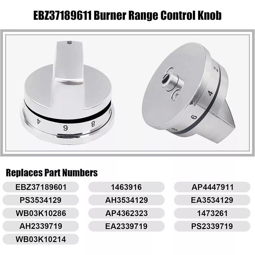Energy Star:CompliantCompatible Brand:LGFeatures:Smooth Top, Knob with "D" gasket, Upgraded & Heavy DutyCustom Bundle:NoBrand:ERPInstallation:CountertopCapacity:0.5 ft³ or lessColor:SilverUPC:Does not applySuitable For:Conventional Oven/Stove, Grill Oven, Gas Range/StoveType:KnobCompatible Model:LRG30355ST, LRG30357ST, LRG30855ST, LRG30857ST, LRG30858STMPN:EBZ37189609, EBZ37189611Number of Items in Set:5Set Includes:1 pcs EBZ37189609 and 4 pcs EBZ37189611 Range Burner KnobCountry of Origin:ChinaPower Source:Natural Gasgtin13:Does not applyManufacturer Warranty:1 yearModel:EBZ37189609, EBZ37189611Material:Stainless SteelFinish:Shiny