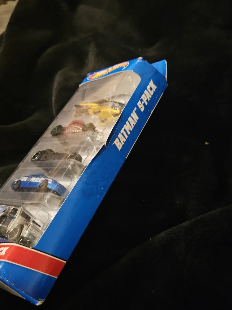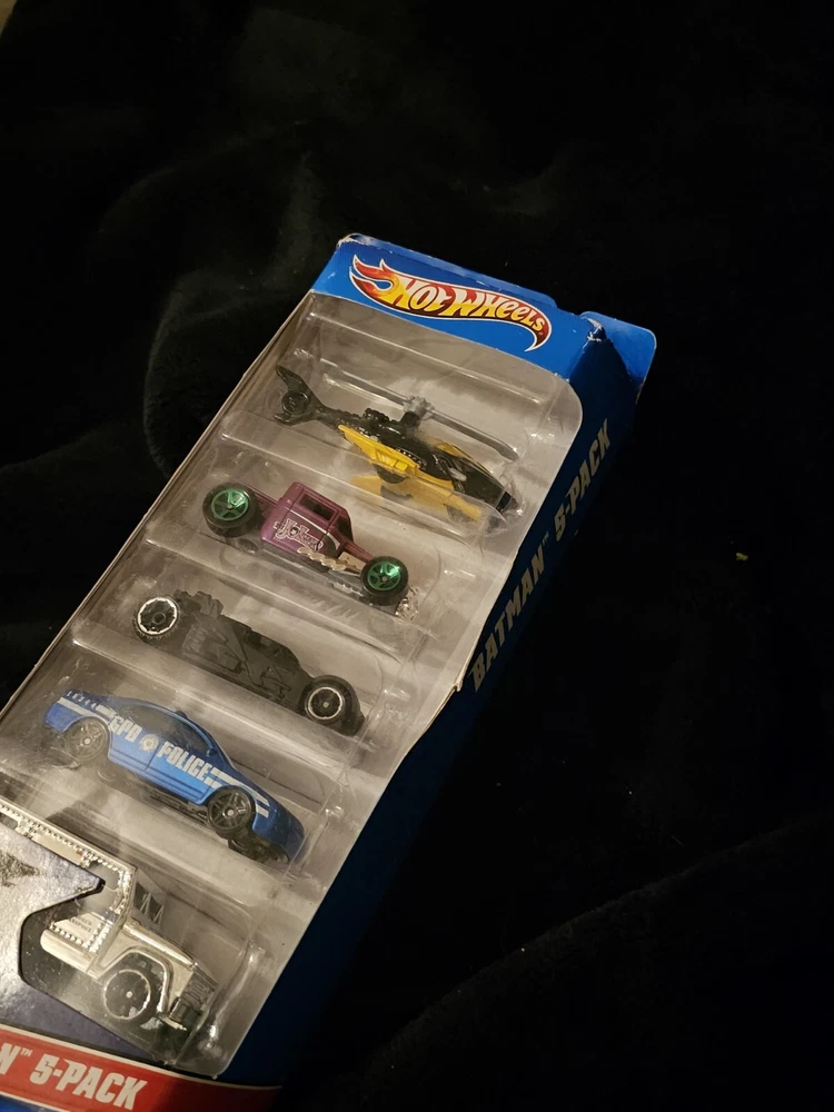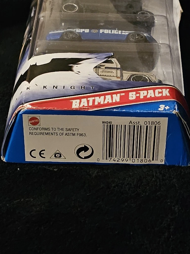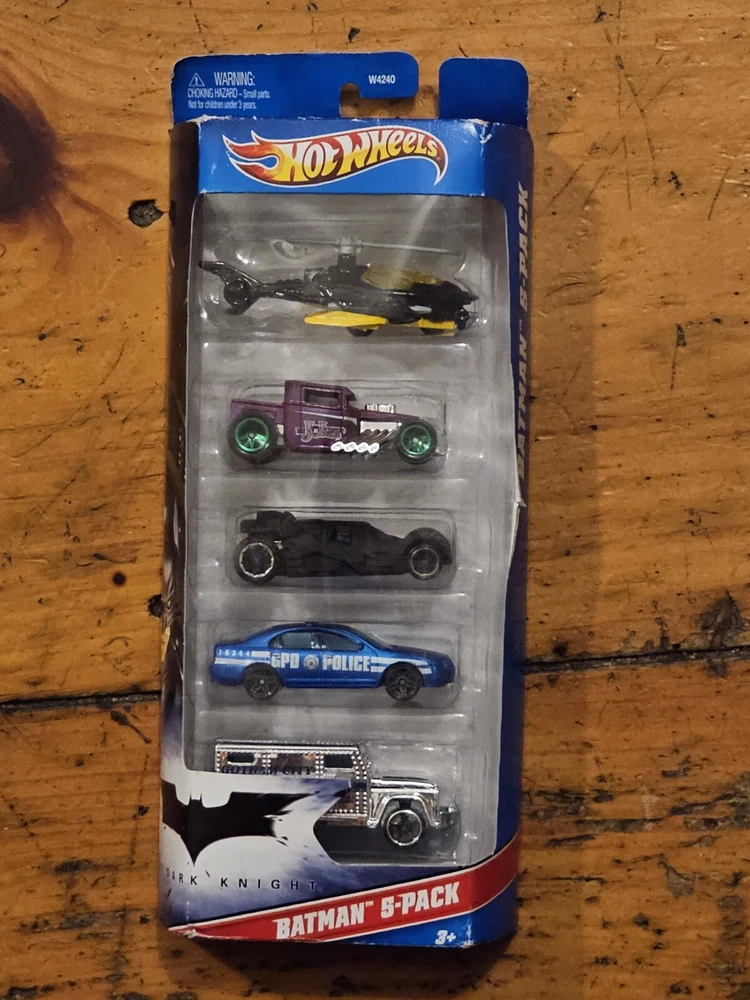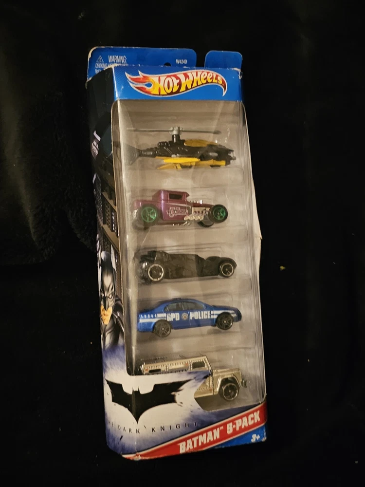 This is a set of 5 Batman Hot Wheels cars, featuring the iconic Batmobile from the 2011 Batman movie. These diecast cars are 1:64 scale and come in an unopened box. The Hot Wheels brand is known for its high-quality and collectible diecast cars, and this set is no exception. The cars are multi-colored and feature the Batman theme, with the model number 4240. They are recommended for children ages 3 and up, and are perfect for both boys and girls. These Hot Wheels cars are part of the Hot Wheels Batman series, and are a must-have for any Batman fan or collector.