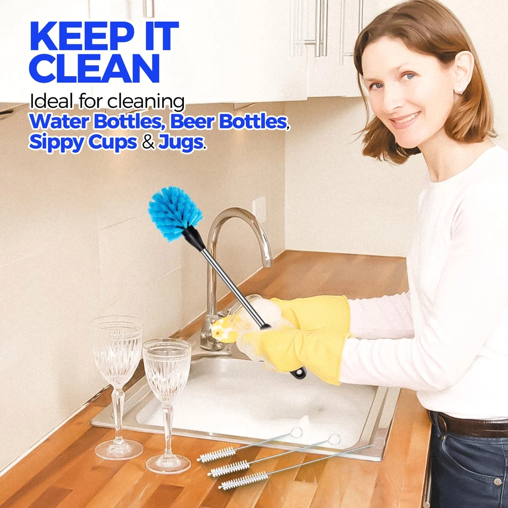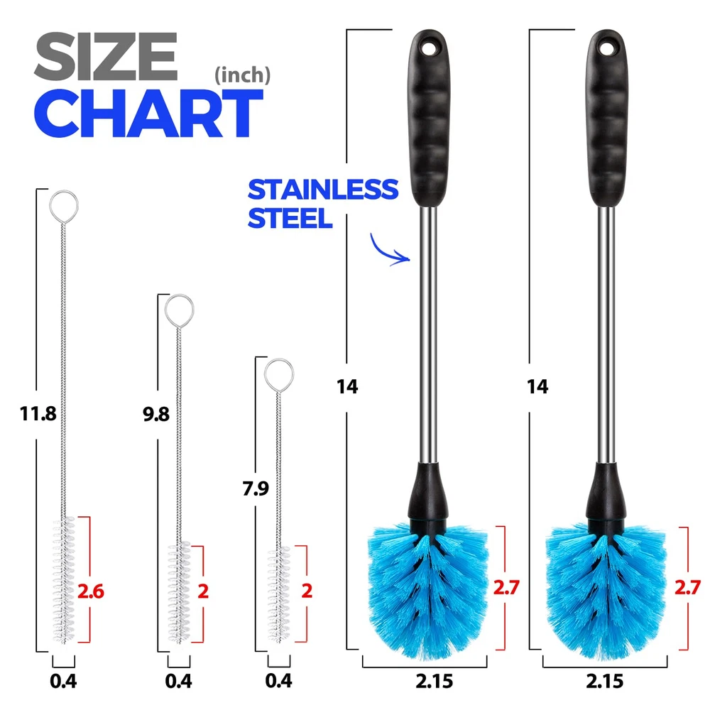 【5 PACK BOTTLE BRUSH SET】Includes 2×14" bottle brushes with stainless handle, 3×straw brushes. With this complete set of cleaning tools, you'll have everything you need to keep your drinkware sparkling clean and ready to use. 【2 BOTTLE BRUSHES WITH LONG STANINLESS】Measures 14" and non-scratch and odorless nylon bristle easily removes stubborn stains from your bottles, carafes, travel mugs, containers etc. Its sturdy construction make tough cleaning tasks a breeze. With the non-slip rubber grip of this bottle scrub brush, you can clean your bottles with ease and comfort. 【3 STRAW BRUSHES】Varying lengths 7.9", 9.8", 11.8" and a diameter of 0.4". Designed to cater to different straw types, such as metal, plastic, and straw lids. Keep your straws clean, hygienic and debris-free, whether reusable or disposable. 【Safe and Hygienic Usage】This bottle brush set is made from food-grade polypropylene, ensuring it doesn't produce any peculiar odors. It is considered safe for your children and is a fantastic addition to your kitchen or a great gift option. You can easily store it in a kitchen caddy or hang it by its handle from a hook. Plus, it is dishwasher safe for added convenience. 【Powerful Cleaning Performance】Experience unmatched cleaning power, as our bottle cleaning brush efficiently tackles residue and grime, ensuring a spotless finish every time.