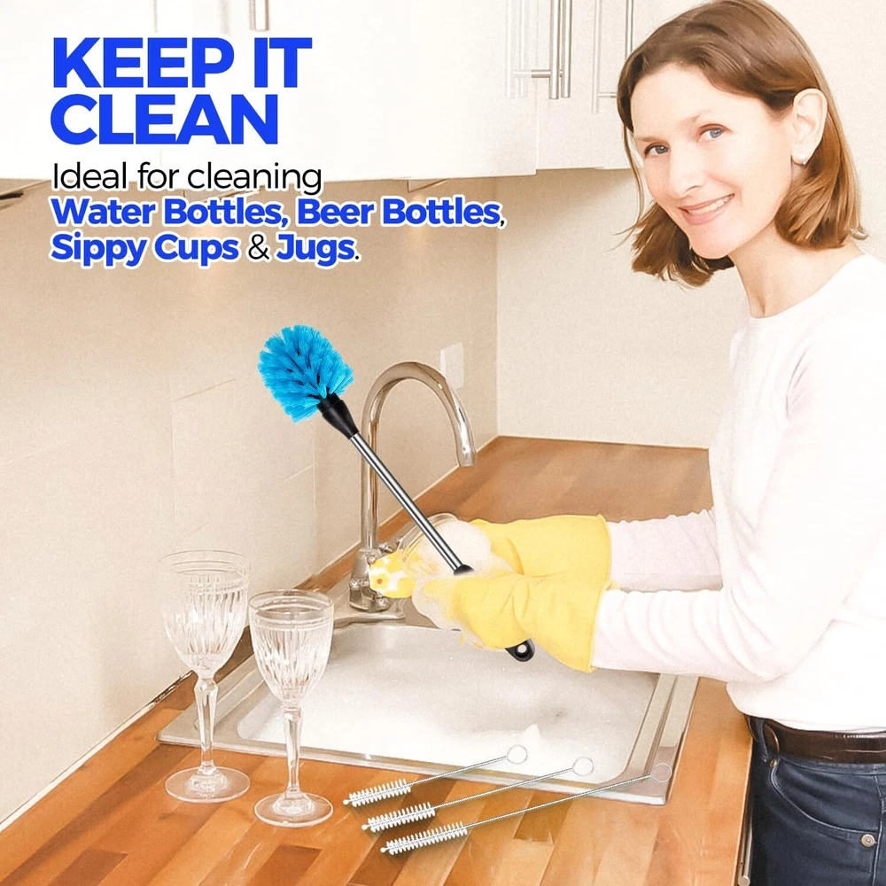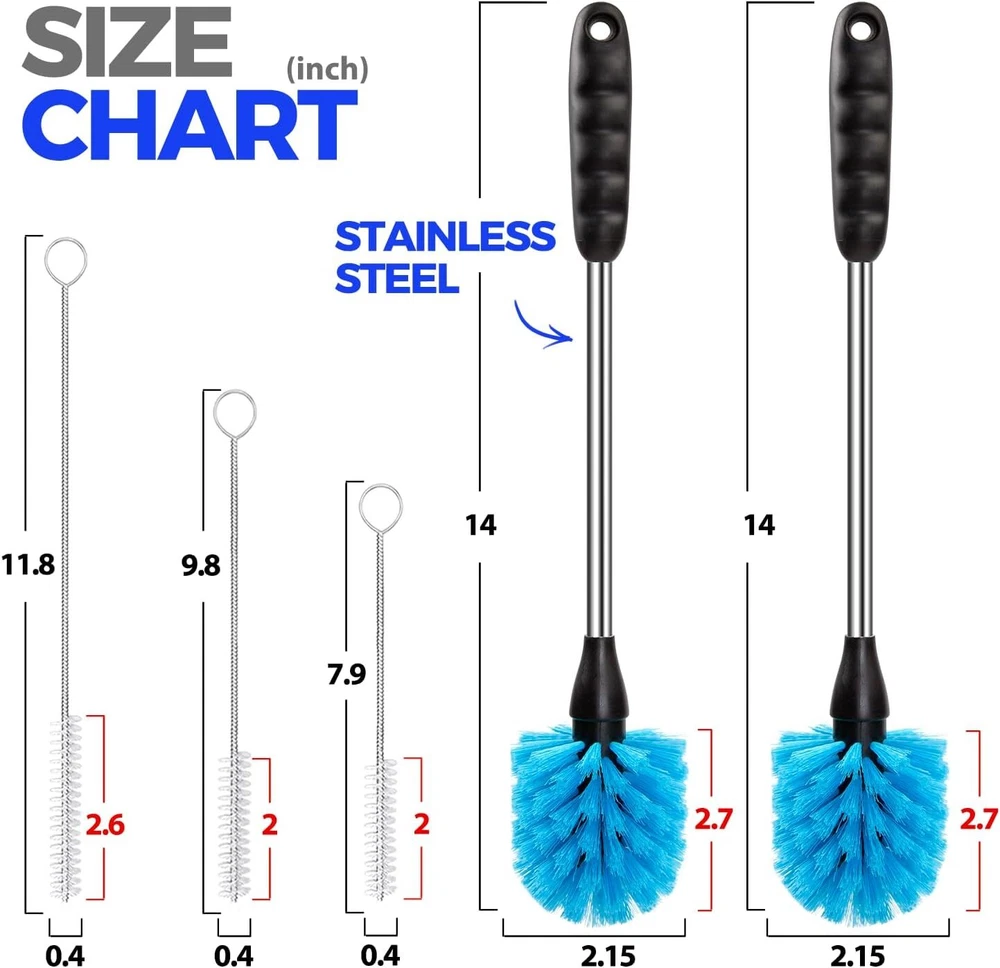 【5 PACK BOTTLE BRUSH SET】Includes 2×14" bottle brushes with stainless handle, 3×straw brushes. With this complete set of cleaning tools, you'll have everything you need to keep your drinkware sparkling clean and ready to use. 【2 BOTTLE BRUSHES WITH LONG STANINLESS】Measures 14" and non-scratch and odorless nylon bristle easily removes stubborn stains from your bottles, carafes, travel mugs, containers etc. Its sturdy construction make tough cleaning tasks a breeze. With the non-slip rubber grip of this bottle scrub brush, you can clean your bottles with ease and comfort. 【3 STRAW BRUSHES】Varying lengths 7.9", 9.8", 11.8" and a diameter of 0.4". Designed to cater to different straw types, such as metal, plastic, and straw lids. Keep your straws clean, hygienic and debris-free, whether reusable or disposable. 【Safe and Hygienic Usage】This bottle brush set is made from food-grade polypropylene, ensuring it doesn't produce any peculiar odors. It is considered safe for your children and is a fantastic addition to your kitchen or a great gift option. You can easily store it in a kitchen caddy or hang it by its handle from a hook. Plus, it is dishwasher safe for added convenience. 【Powerful Cleaning Performance】Experience unmatched cleaning power, as our bottle cleaning brush efficiently tackles residue and grime, ensuring a spotless finish every time. Product Description