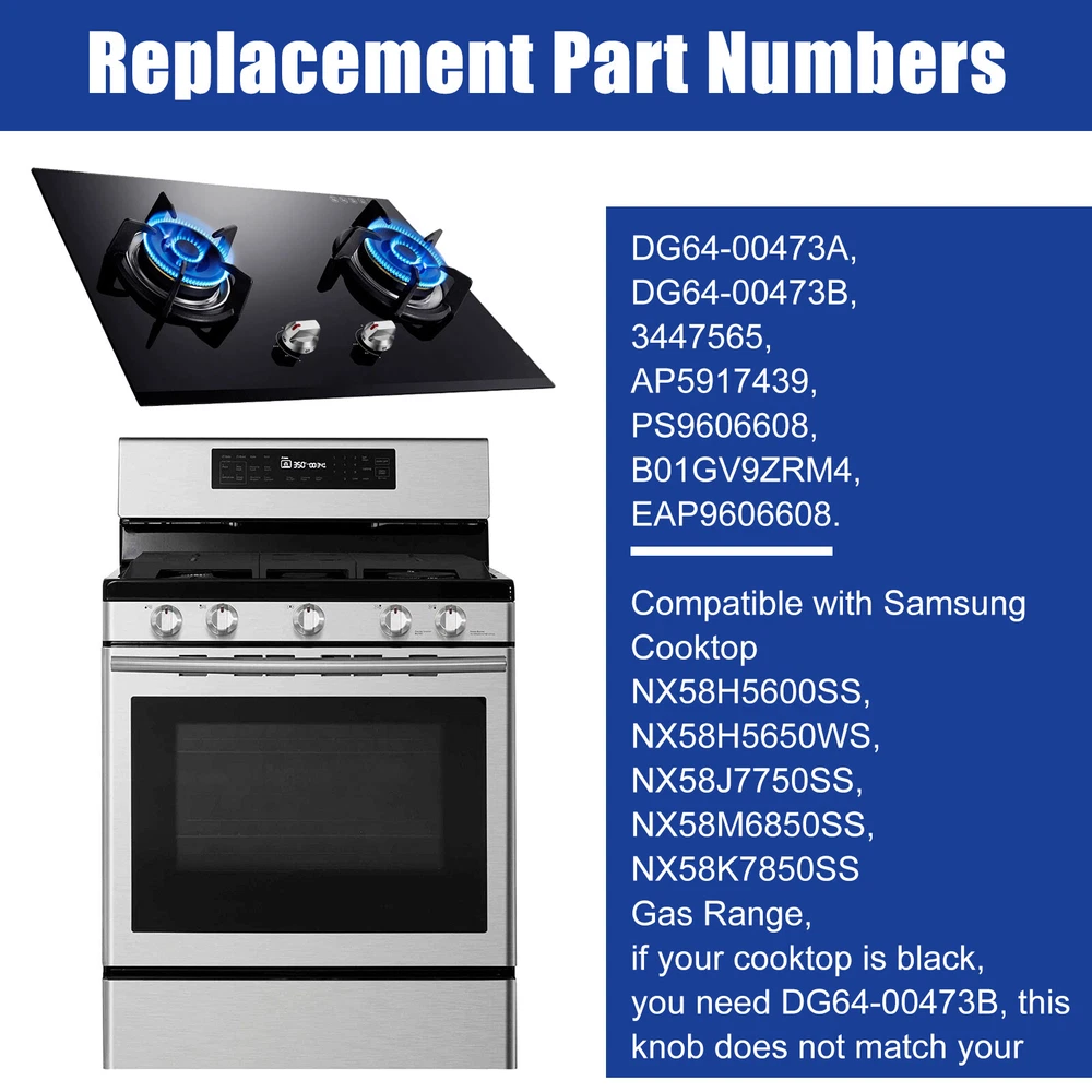 DG64-00473A Top Burner Control Dial Knob Range Oven Replacement Stainless Steel Compatible with Samsung Range Oven Gas Stove Knob NX58F5700WS NX58H5600SS NX58H5650WS NX58J7750SS NX58M6850SS (5pcs) Ideal Replacement:5 new DG64-00473A Stove Knobs that matches the original, for far less than going back to the dealership. This replacement Range Knob Dial was specifically designed to look and function the same as the original Burner Knob Dial on Samsung Range Oven. While this is NOT a genuine Samsung part, it is a direct replacement and it will appear, fit and work like the factory part. Upgraded:Strong rings to reinforce around the middle part of the knobs - kinda like a tight sleeve around them to ensure they can take heavy duty and won't be cracked easily. No tool required - Easily install the part YOURSELF and quickly get your range oven burner back to work within few minutes. Replaces Part Number And Appliance Model:Replaces Part Number: DG64-00473A, DG64-00473B, 3447565, AP5917439, PS9606608, B01GV9ZRM4, EAP9606608. Fit for Samsung Range Oven NX58H5600SS, NX58H5650WS, NX58J7750SS, NX58M6850SS, NX58K7850SS Gas Range - If your stove is black, you will need DG64-00473B instead and this knob won't match your color. Fits with various Samsung brand models including but not limited to Samsung NX58F5700WS/AA-03 Range · Samsung NX58H5600SS/AA-00 Gas Range Samsung NX58H5600SS/AA-01 Gas Range · Samsung NX58H5600SS/AA-02 5.8 Cu. Ft. Self-Cleanin Gas Convection Range Samsung NX58H5600SS/AA-03 5.8 Cu. Ft. Self-Cleanin Gas Convection Range Samsung NX58H5600SS/AC-01 5.8 Cu. Ft. Self-Cleaning Freestanding Gas Convection Range Samsung NX58H5600SS/AC-02 5.8 Cu. Ft. Self-Cleaning Freestanding Gas Convection Range Samsung NX58H5650WS/AA-00 Gas Range · Samsung NX58H5650WS/AA-01 Gas Range Samsung NX58H5650WS/AA-02 Gas Range · Samsung NX58J7750SS/AA-00 Gas Range Samsung NX58J7750SS/AA-01 Gas Range · Samsung NX58J7750SS/AC Gas Oven,5.8,Real Stainless Samsung NX58K7850SS/AA-00 Gas Range Samsung NX58K7850SS/AA-01 5.8 Cu. Ft. Flex Duo With Dual Door Freestanding Gas Range Samsung NX58K7850SS/AA-02 5.8 Cu. Ft. Flex Duo With Dual Door Freestanding Gas Range Samsung NX58M6850SS/AA-00 Gas Range Samsung NX58M6850SS/AA-01 5.8 Cu. Ft. Flex Duo Freestanding Gas Range Product Introduction Size: 2.4 inch/ 6.09 cm in diameter, 1.5 inch/ 3.81 cm in height Condition: 100% Brand New and never used Package Includes: 5 x DG64-00473A Gas Range Knob Function: Burner Control/Cooktop/Stove/Oven Knobs