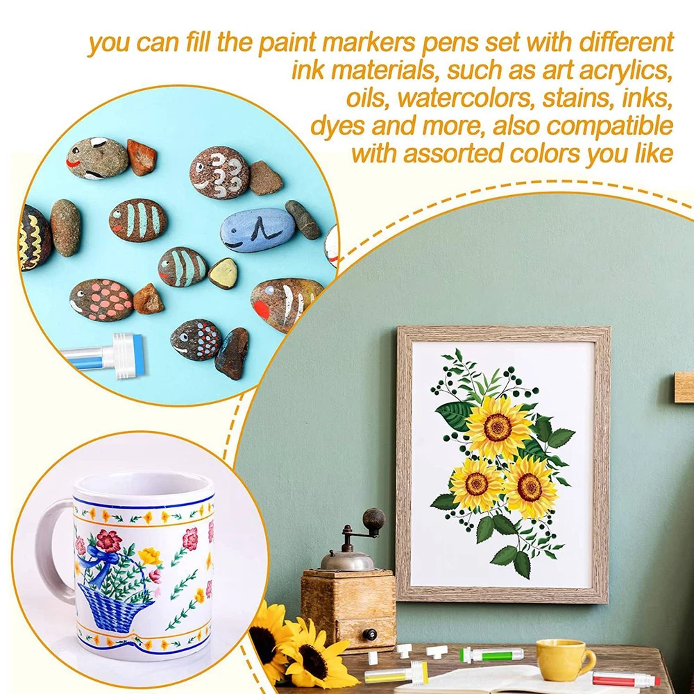 5 Pack Graffiti Markers Refillable Paint Markers Paint Pen for with 58380 Abundant Quantity: You will receive 5 empty paint pen markers, and 5 replacement nibs, enough for your daily use and replacement needs Versatile: These refillable acrylic paint pens have an empty center so you can fill in any color you want, or mix different colors to make your painting more colorful; be careful not to fill with very thick liquid materials , which may result in uneven or uneven flow from the tip. : The paint tube of the empty paint pen is made of high-quality plastic material, exquisite workmanship, firm and firm, not easy to break or deform EASY TO OPERATE: These refillable empty refill markers are easy to fill with color, just remove the nib area, put the steel ball in the bucket, fill with paint or ink, and screw the nib back to start writing; the process is simple and convenient, Does not take up too much time and energy Wide Applicability: Refillable pens have a wide range of applications, you can fill with colored inks or mix your favorite colors and start your project on canvas, clothes, shoes, glass, walls or paper, perfect for painting or DIY hobbies type: A Colour:As shown Material:plastic Package Contents: 5 x empty paint pen markers(50mm, 30mm and 15mm) 5 x replacement nibs