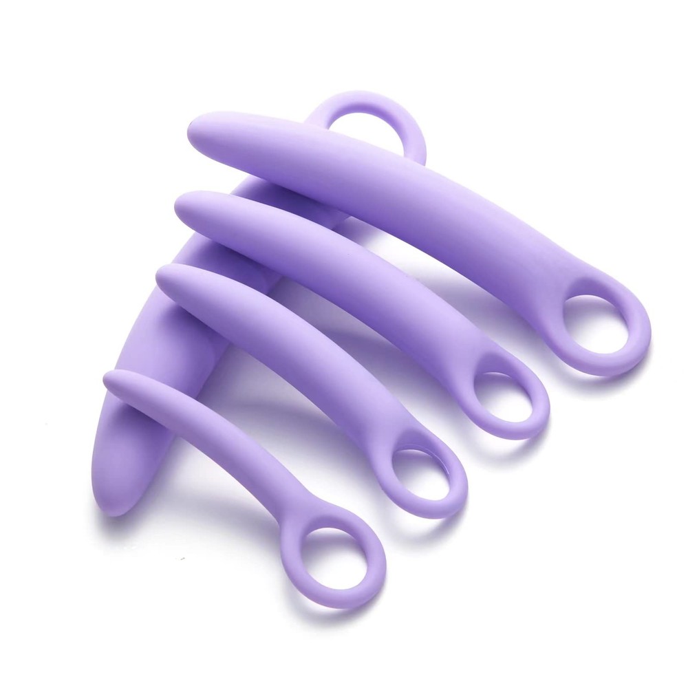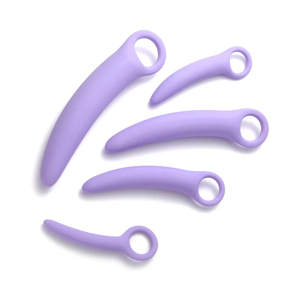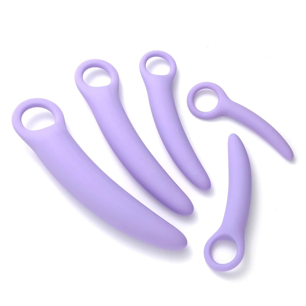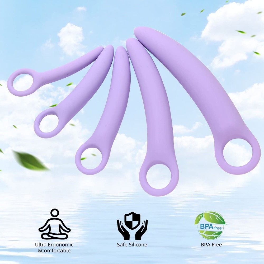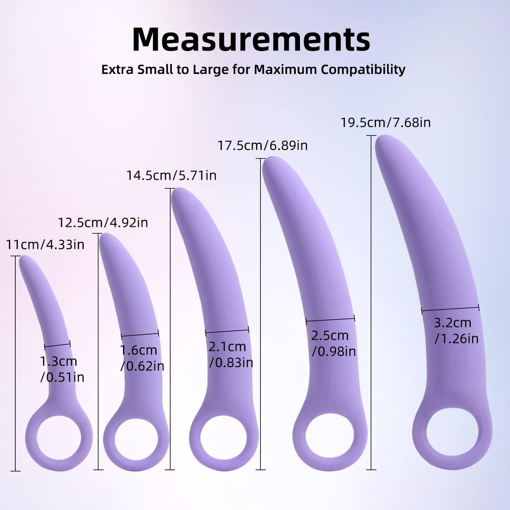 5 Pack Exerciser Set Sizes: 1:Diameter: 0.51 in Length: 4.33 in 2:Diameter: 0.62 in Length: 4.92 in 3:Diameter: 0.83in Length: 5.71 in 4:Diameter: 0.98 in Length: 6.89 in 5:Diameter: 1.26 in Length: 7.68 in Made for home use Silicone Material: Silicone, Soft Silicone Dilator for women Silicone Dilator