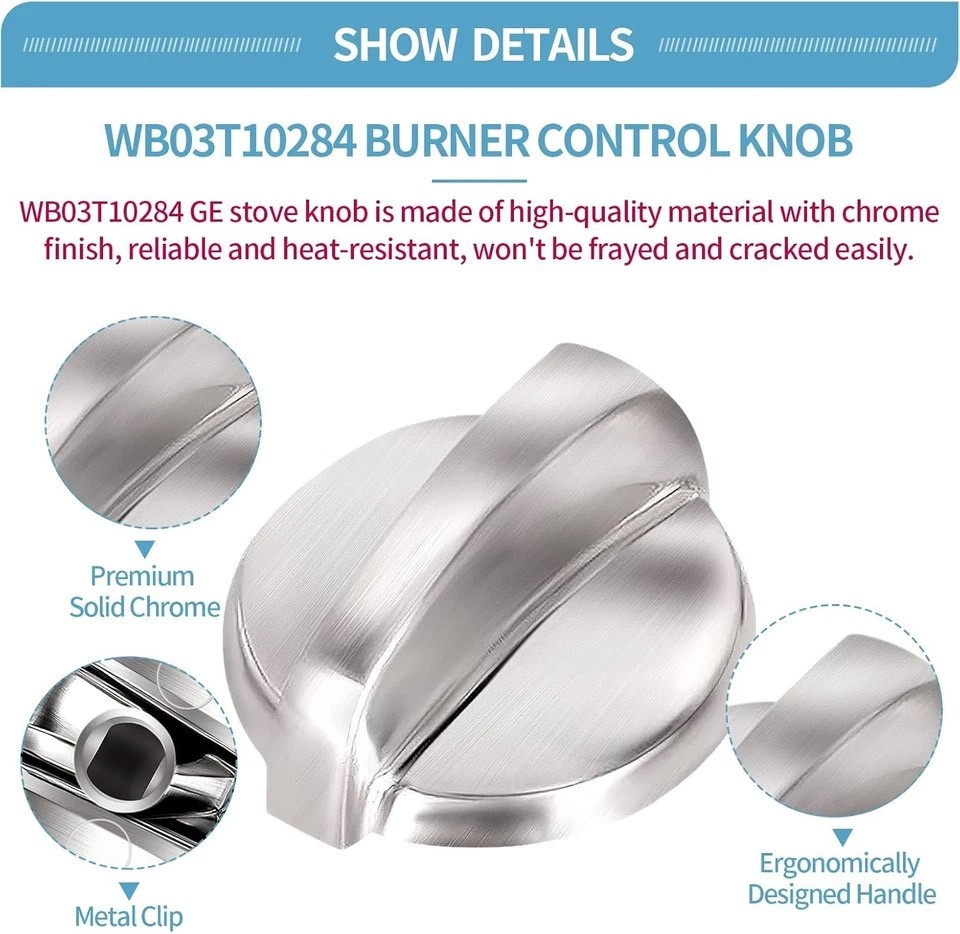 PREMIUM QUALITY: These knobs are made from durable high quality material and finished with stainless steel finish to ensure LONG-LASTING and effective performance. Ideal Replacement: Want new stove knobs that match the original? These replacement GE Electric range knobs was specifically designed to look and function the same as the original GE Range knobs on your cooktop. it is a direct replacement and it will appear, fit and work like the factory part. Replacement Compatible with General Electric Hotpoint RCA Plastic Top Burner Surface Knob (with Stainless Steel Finish) Replaces commonly broken or worn burner knob Replacement surface burner knob compatible with General Electric/Hotpoint/RCA/Kenmore replaces part numbers WB03T10284, AP4346312, 1373043, AH2321076, EA2321076 and PS2321076 On Jan 8, 2026 at 19:59:15 PST, seller added the following information: