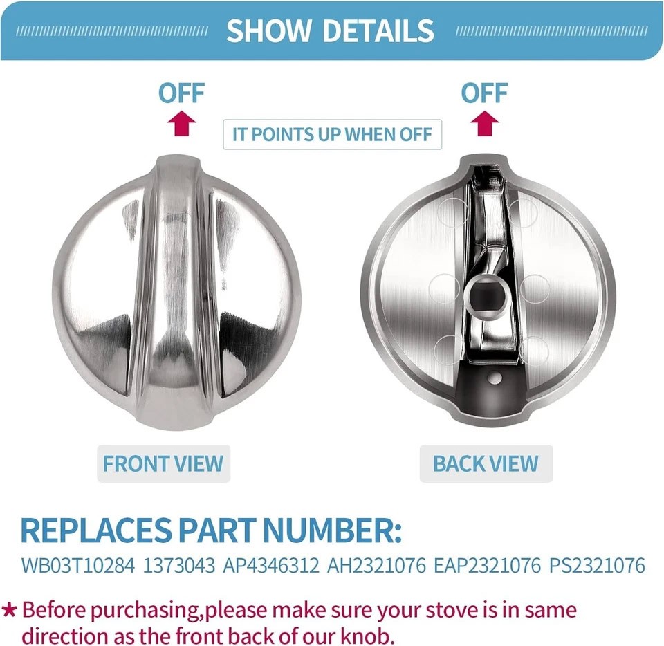 PREMIUM QUALITY: These knobs are made from durable high quality material and finished with stainless steel finish to ensure LONG-LASTING and effective performance. Ideal Replacement: Want new stove knobs that match the original? These replacement GE Electric range knobs was specifically designed to look and function the same as the original GE Range knobs on your cooktop. it is a direct replacement and it will appear, fit and work like the factory part. Replacement Compatible with General Electric Hotpoint RCA Plastic Top Burner Surface Knob (with Stainless Steel Finish) Replaces commonly broken or worn burner knob Replacement surface burner knob compatible with General Electric/Hotpoint/RCA/Kenmore replaces part numbers WB03T10284, AP4346312, 1373043, AH2321076, EA2321076 and PS2321076 On Jan 8, 2026 at 19:49:36 PST, seller added the following information: