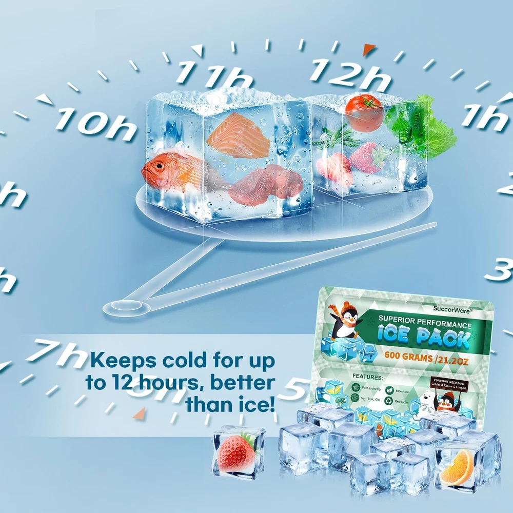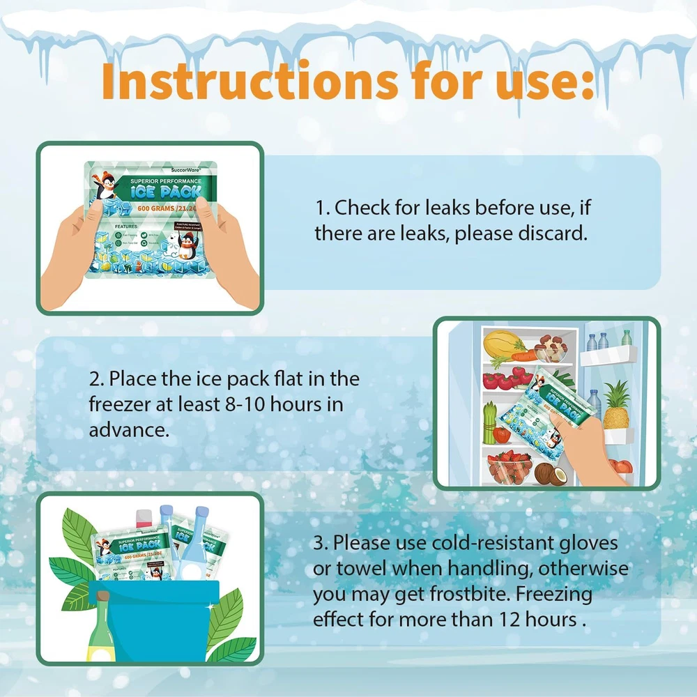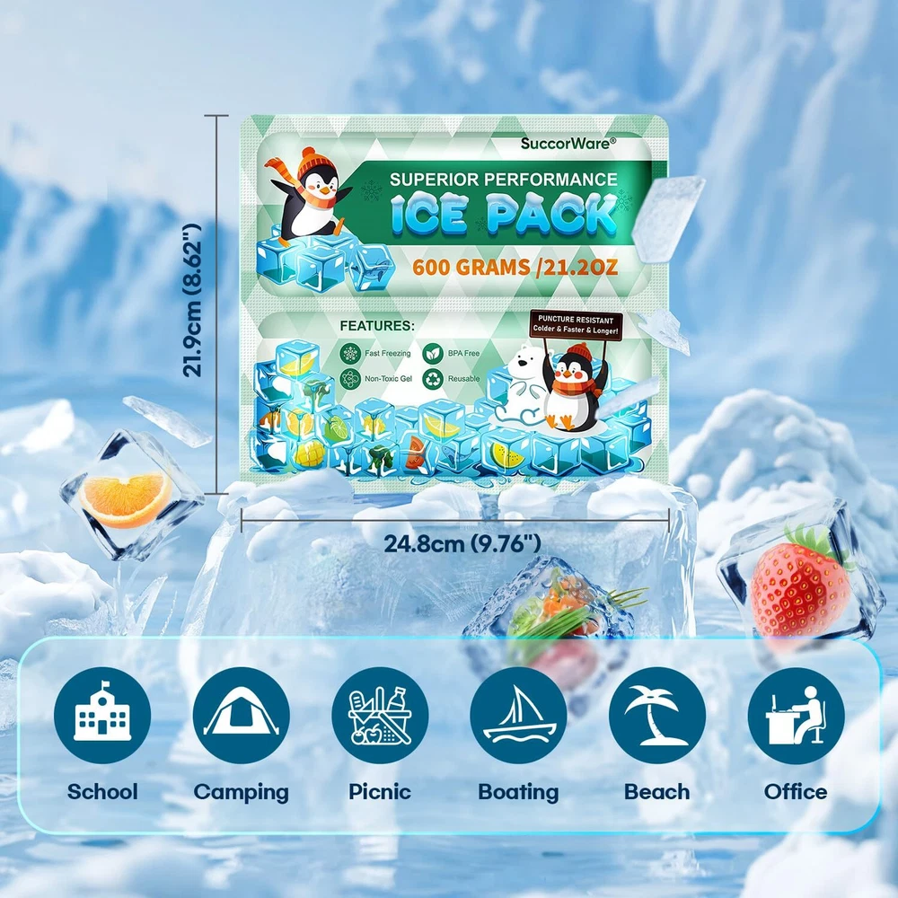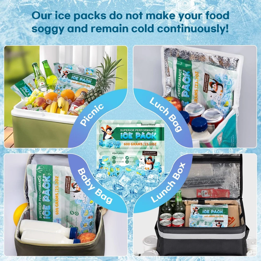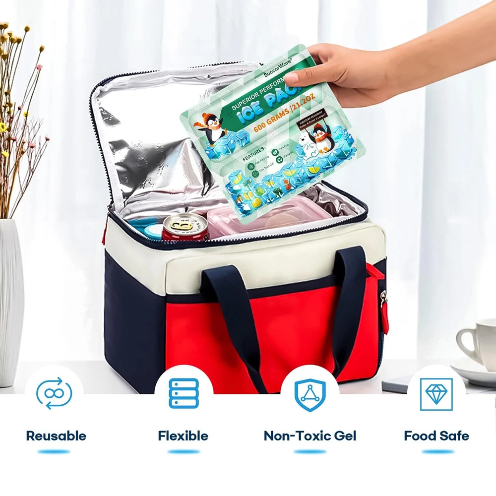 ULTIMATE ICE FEELING - ice packs utilize the latest cooling technology and are a great alternative to traditional ice cubes. It can provide cooler, faster and longer lasting cooling effect. REUSABLE HIGH PERFORMANCE ICE PACKS - Our high performance ice packs are reusable and feature a soft, puncture-resistant design. Simply place the ice packs flat in the freezer 8-10 hours in advance to ensure your meals/drinks stay fresh and cool. SAFE & NATURAL - Our lunch box ice packs are made of BPA-free premium gel, rich in natural ingredients. They stay cool and fresh for up to 12 hours. They are safe and non-toxic, please feel free to use them. Right Size - Ice packs for lunch boxes come in two sizes for you to choose from, 7" x 6.77" x 1" (250 grams) and 9.76" x 8.62" x 1" (600 grams). Its slim, flat design is great for lunch bags, refrigerated backpacks, breastmilk bags, work and delivery scenarios, and more. It is the right size and easy to carry. VERSATILE - Freezer packs are great for camping, picnics, boating, the beach, the office, or any situation where you need to keep things fresh and cool. They are the preferred solution for keeping meals and beverages cold and are the best choice when long-lasting cooling is required.