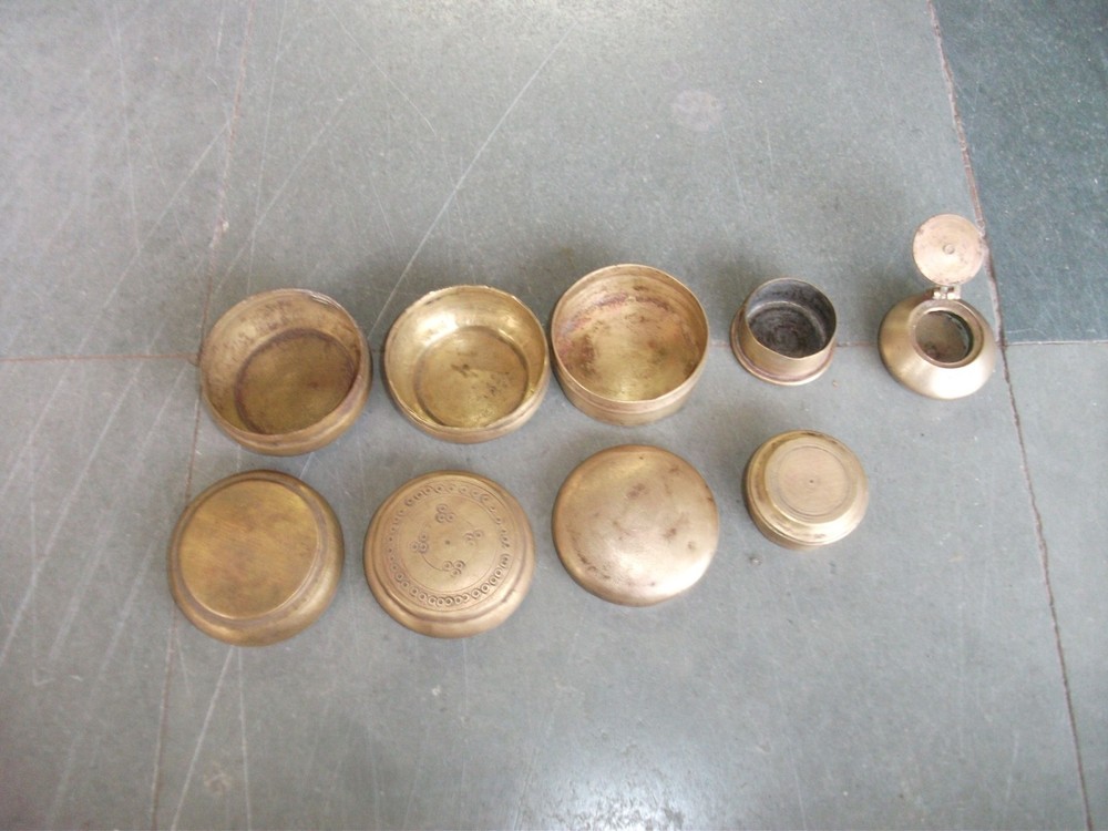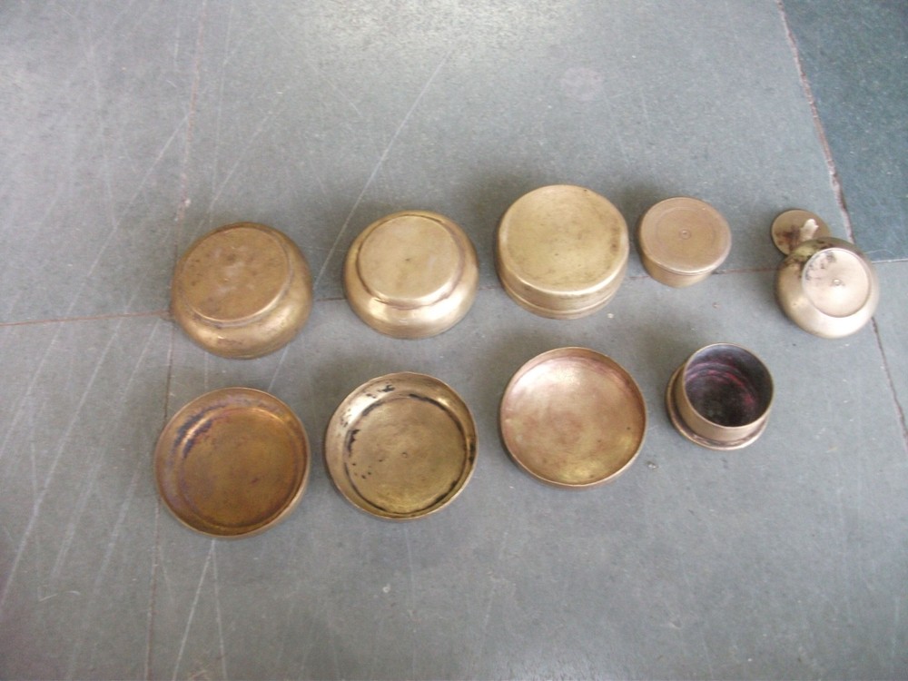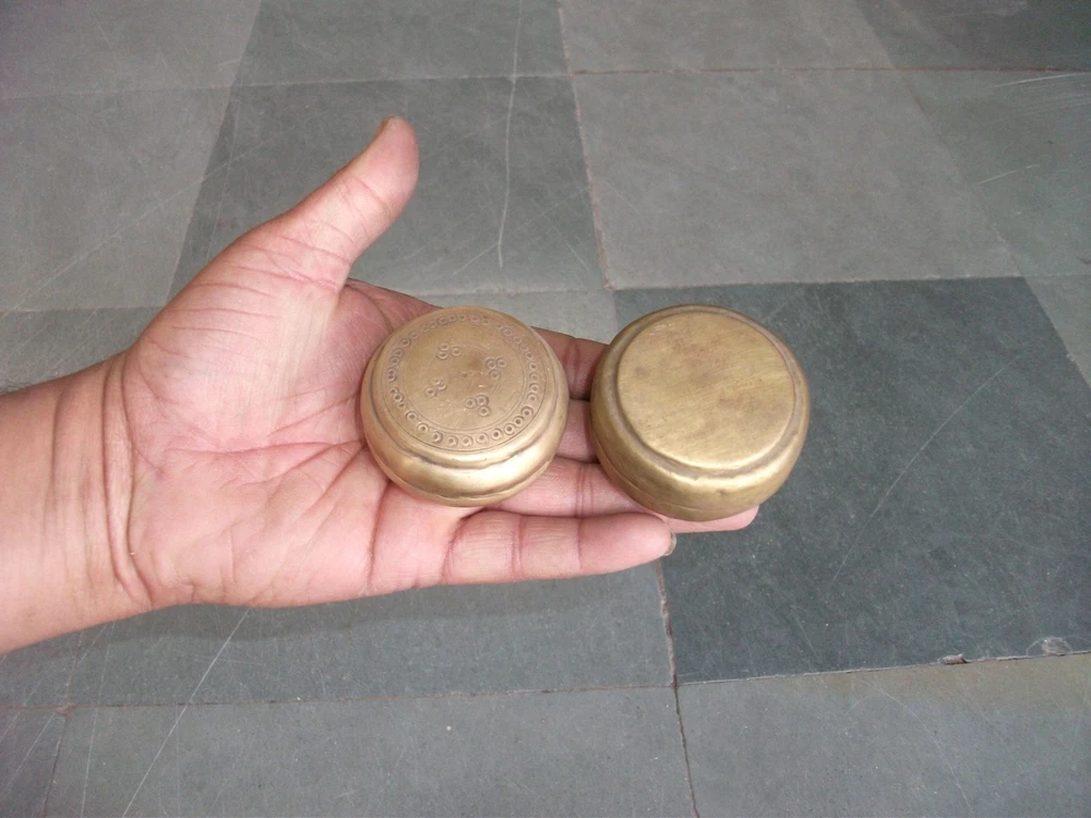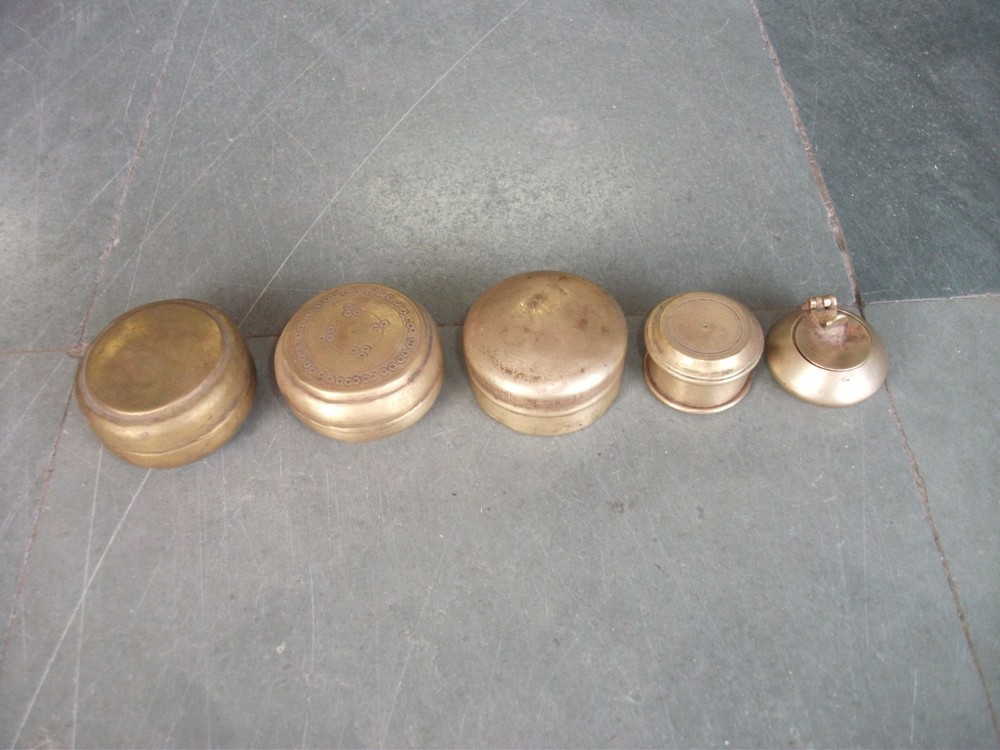 Traders of Lost Art Store Payments Shipping Returns 5 Pc Vintage Different Brass Handcrafted Fine Quality Pill/Powder Boxes - 63229 Item Description 5 Pc Vintage Different Brass Handcrafted Fine Quality Pill/Powder Boxes 70 - 80 Years Old , Rich Patina Different Shape & Size Fine Quality Boxes Use To Keep Pills/Powder Etc. Good For Collection See Photos for more details & actual condition. Size : 6 x 3 Cm ( 2.25 x 1.25 I nch ) A pprox Weight :- 204 Grams Payment Policy PayPal is Accepted Item will be shipped next business day of receiving full payment Any other mode of payment will be accepted (only for Indian Buyers) Shipping Policy International Orders will be shipped by Indian Post, next business day of receiving full payment International Orders will take 15-20 business days to deliver goods worldwide. Shipping also offered via DHL on request by the buyer. (Premium Charges) We also offer combined shipping Returns Policy Actual Images of item are shown above RETURNS are Accepted within 14 days Buyer will bear return courier charges supremewidgets supremewidgets