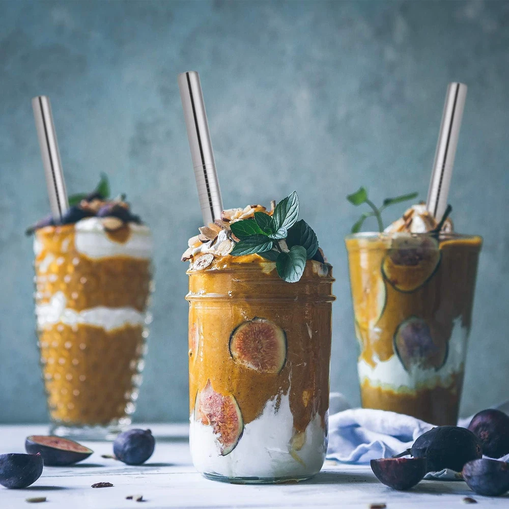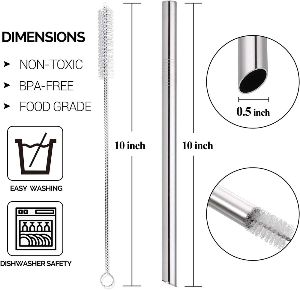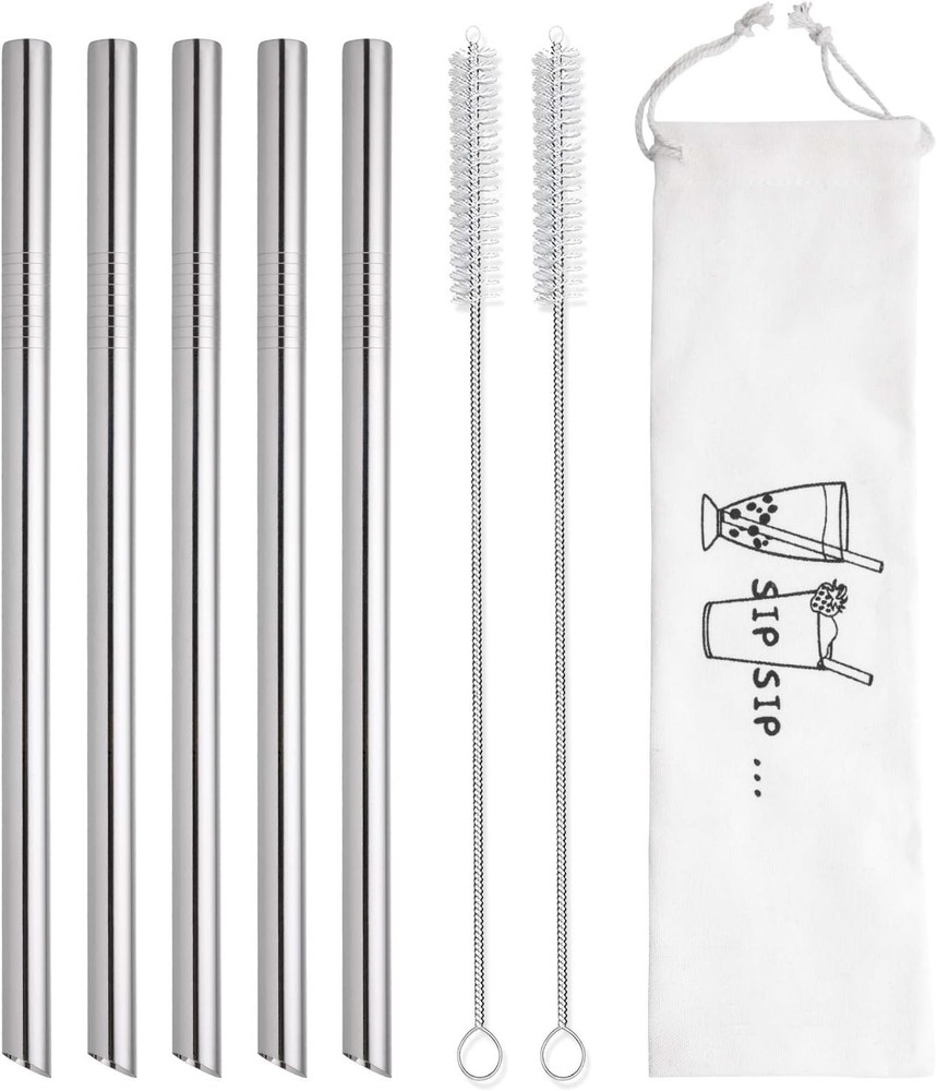 [Angled Tips] 5 Pcs 10" Reusable Bubble Tea Straws & 8 Piece Set, Silver Product Details Package Dimensions : 12.6 x 3.19 x 0.67 inches; 6.35 ounces Manufacturer : HIWARE Material: Stainless Steel Color: Silver Size: 8 Piece Set Special Feature: Disposable,Extra Wide,Reusable Brand: HIWARE Unit Count: 1.0 Count Number of Items: 5 Manufacturer: HIWARE ★IDEAL SIZE FOR Bubble Tea & SMOOTHIES - 5 pcs metal straws + 2 cleaning brushes + 1 straws storage case. 10" long and 12mm/0.5" extra wide stainless steel straws are the best ideal size for fat bubble tea (tapioca pearls), frozen smoothies, thick milkshakes, jelly, jumbo drinks and more homemade thick drinks ★ECO-FRIENDLY & ALTERNATIVE TO PLASTIC - Stainless steel straws offer you a sustainable and cost-effective way to drastically reduce plastic consumption and seagull’s or turtle’s death. With a straw carrying case you can carry your drinking straws where you go. Refusing disposable straws and devoting little efforts with your families make world better ★SMOOTH TIPS FOR SAFE DRINKING - These reusable straws are hand polished carefully to ensure smooth tips. Besides, these smooth angled tips will poke through sealed Bubble Tea tops with ease. Stainless steel straws can keep the taste cool when you are drinking cold beverage ★FOOD-GRADE STAINLESS & DISHWASHER SAFE - These smoothie straws are made of food-grade stainless steel material. No metal aftertaste, BPA FREE, Lead Free and Eco-friendly. DISHWASHER SAFE and will not fade, rust, bend or scratch, also hand washing efficiently with 2 cleaning brushes ★100% SATISFACTION SERVICE- We believe that our high quality reusable straws will exceed your expectations. We will present you with a delicate package. If you're not completely satisfied simply, don't hesitate to contact us and we will offer a refund or replacement as soon as possible 5 Pcs Angled Tips Stainless Steel Bubble Tea Straws and Smoothie Straws Best size and length for bubble tea(Tapioca Pearl), smoothies, milkshakes, jumbo drinks and more homemade beverages Refuse plastic straws and save the earth PACKAGE INCLUDED: 5 pcs stainless steel straws with angled tips 2 pcs straw brushes 1 pcs straws travel bag SIZE: Straws: 10" long and 0.5" wide Brushes: 10" long Bag: 10.5" long MATERIAL: Premium 100% food-grade 304 stainless steel. DISHWASHER SAFE and will not rust NOTE: 1 - Washing these reusable straws in hot water before first use 2 - Adult supervision is required when used by children under 12 years old 3 - Don't use it in moving car