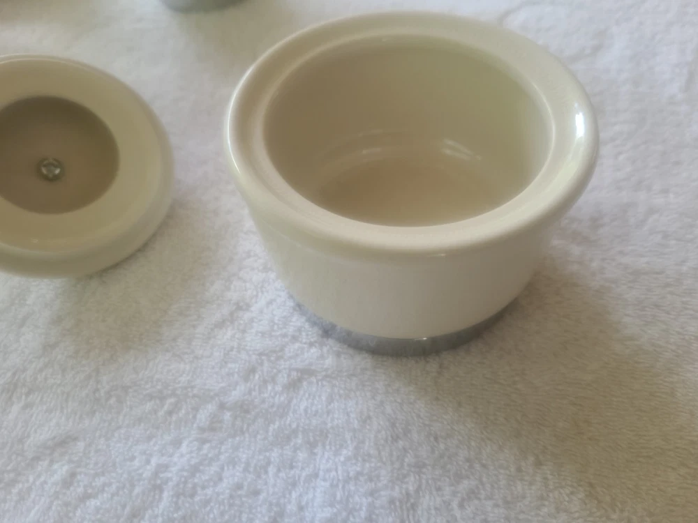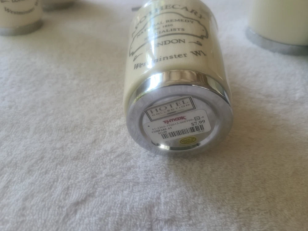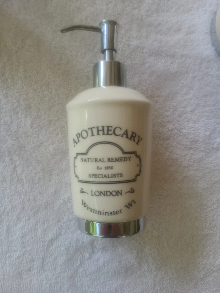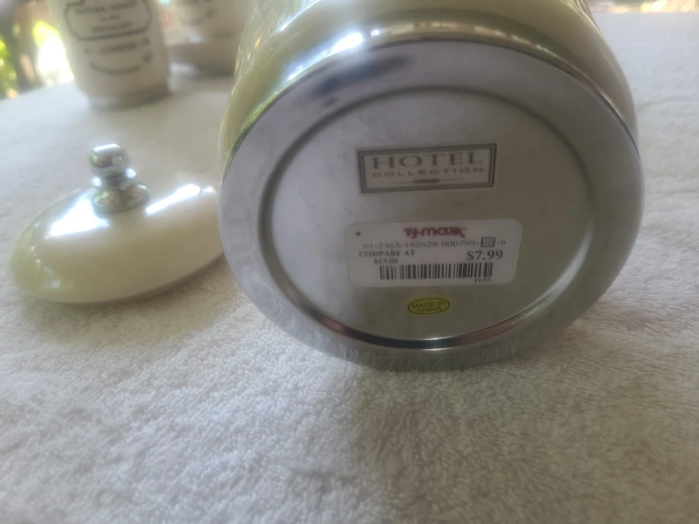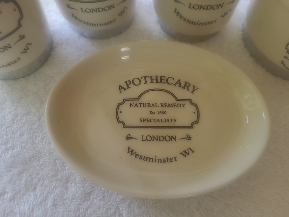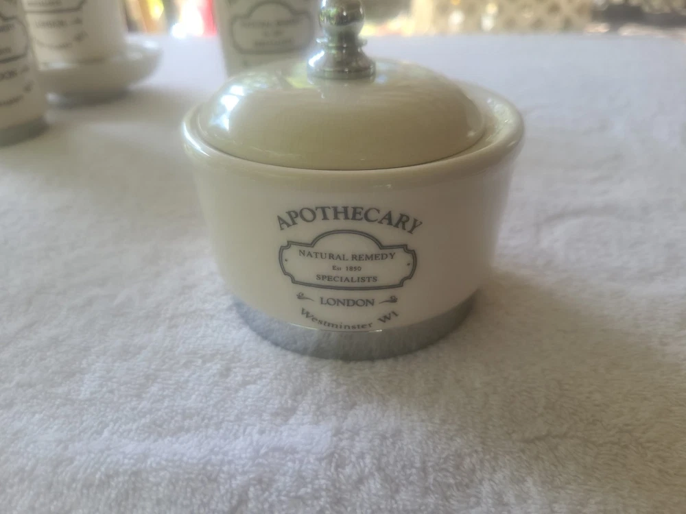 4 are new...only item that was used was the soap dispenser for a short time. The 5 Piece Apothecary Bathroom Accessories Set by Hotel Collection is a stylish and vintage-inspired collection made of porcelain. This set includes a toothbrush holder, cotton ball container, soap dispenser, brush/comb cup holder, and soap dish, all in a brushed white finish. Perfect for adding a touch of elegance to any bathroom, this accessory set is both functional and aesthetically pleasing, making it a practical and attractive addition to your home decor.