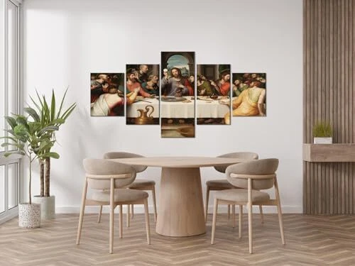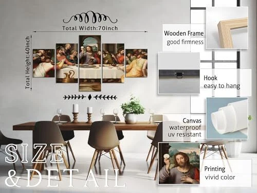 Return Policy Fast Delivery Trusted seller 5 Piece Jesus Canvas Prints Wall Art Modern Classic The Last Supper Famous Oil Painting by Da Vinci Reproduction Posters and Prints Ready to Hang for Home Office Decor (70''W x 40''H) Product Description SIZE Of JESUS PAINTING: 14x20inchx2pcs+14x28inchx2pcs+14x40inch x1pc. MATERIAL OF CHRISTIAN WALL ART DECOR: 1. high-quality canvas: moisture-proof, UV-resistant, thick and friendly-environment coating; 2. sturdy wooden frame: thick, not easy to deform, light. PACKING WAY OF JESUS PICTURE: Your products will be packed with FILM PLASTIC and CARTON. Each panel of canvas has been already stretched to solid wooden frame of hook ready to hang. THE LAST SUPPER WALL DECOR: A perfect wall decorations paintings for living room, bedroom, office, hotel, etc. A great gift idea for your relatives, friends, classmates, workmates, etc. 100% WORRY-FREE SERVICE: Supply with 24 hours pre-sale and after-sale online service to ensure you buy it without any worry! If you have any questions of christian poster, we will make you satisfied. Shipping Returns Payment Shipping Shipping is FREE to all addresses other than APO/PO boxes in the lower 48 states. All our stock ships from US-based warehouses. Shipped via USPS or UPS (depending on location and package weight) Unless stated otherwise, all orders will ship within 24-72 hours of your payment being processed. Check our feedback to see the great reviews of FAST shipping we offer. Returns Seller does not accept returns Payment We currently accept payment via eBay managed payments only. Once payment is cleared, we will dispatch your shipment within 1-3 business days. Please refer to the "Shipping" tab for more information regarding shipping speed to your destination.