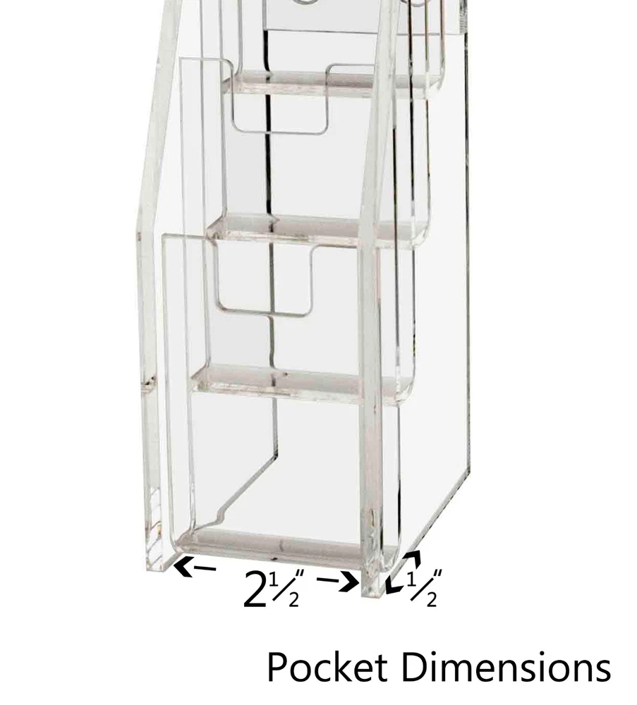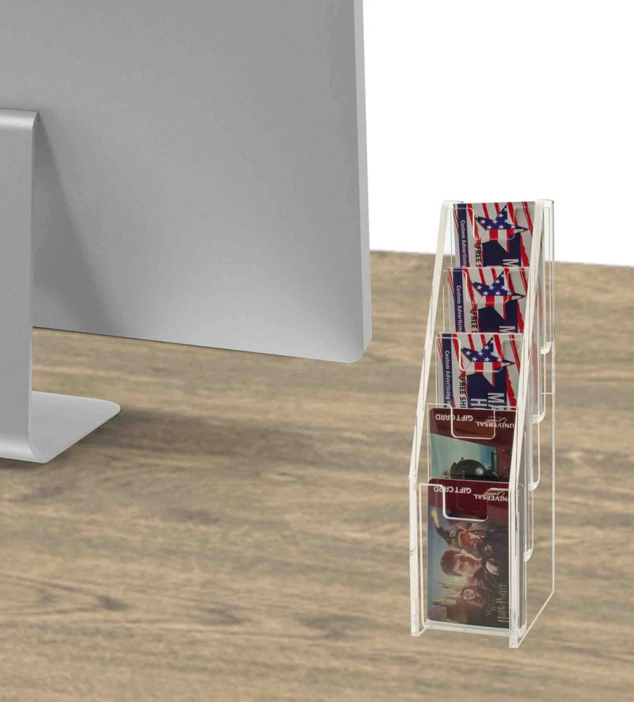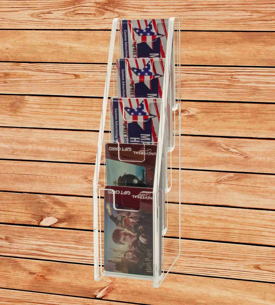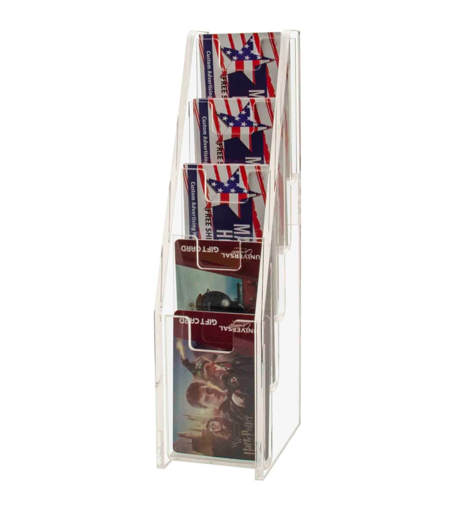Tiered 5 Pocket Business Card Gift Card Holder Wall Mount or Countertop Product Features: Holds 2”W x 3.5”H standard sized vertically designed business cards, appointment, membership, gift or rewards cards Pocket Dimensions: 2.5”W x .5”D Overall Dimensions: 2.5”W x 10”H x 3.75”D Space-saving design displays five different cards in one convenient holder Freestanding and portable; display on top of a table or on counters and desks. Can also be mounted on walls Proudly made in the USA with premium high quality plastic This cascading business card holder is designed to hold and display multiple sets of business cards, gift cards, appointment cards or any other 2”W printed material. Made of durable plastic acrylic, the tiered card holder can be conveniently placed on desks, tables, retail counters, walls or anywhere you want to leave your cards for customers to take one. This plastic acrylic display stand is perfect for anyone who needs to promote their business and perhaps client cards on tables or counters in any office tradeshow expo or any other event. The display racks are mostly used where there are several different cards to display such as doctor’s office lawyers office or any salon. The holder allows you to showcase your information in a clear and easily accessible manner in one convenient place. The slim design space saver card organizers are great for placement in any service business, salons, reception areas, professional office, government office and other various venues such as trade shows, flea markets or expos. In addition to business information, the acrylic holders can also be used to display other small media like Security Gate Code Cards, Membership Cards, Appointment Cards, VIP Cards, ID Badges, Security Cards or Gift Cards. Retail stores can use these versatile holders to display stickers for resale. Store credit cards are often placed in the cases near the register or checkout stand to increase clientele and expand the customer base. Other times, simple gift cards or doctor’s appointment cards are placed in the pockets. *All sizes are approximate *Color and clarity may vary *Hanging hardware not included