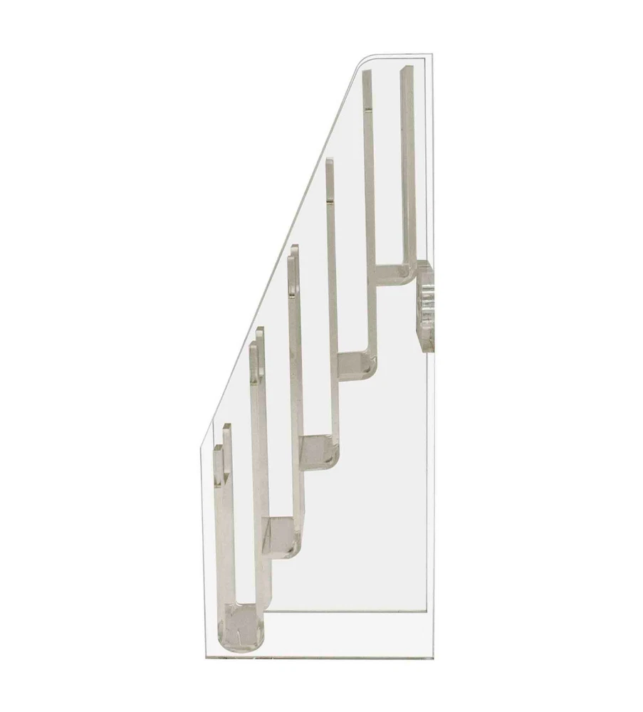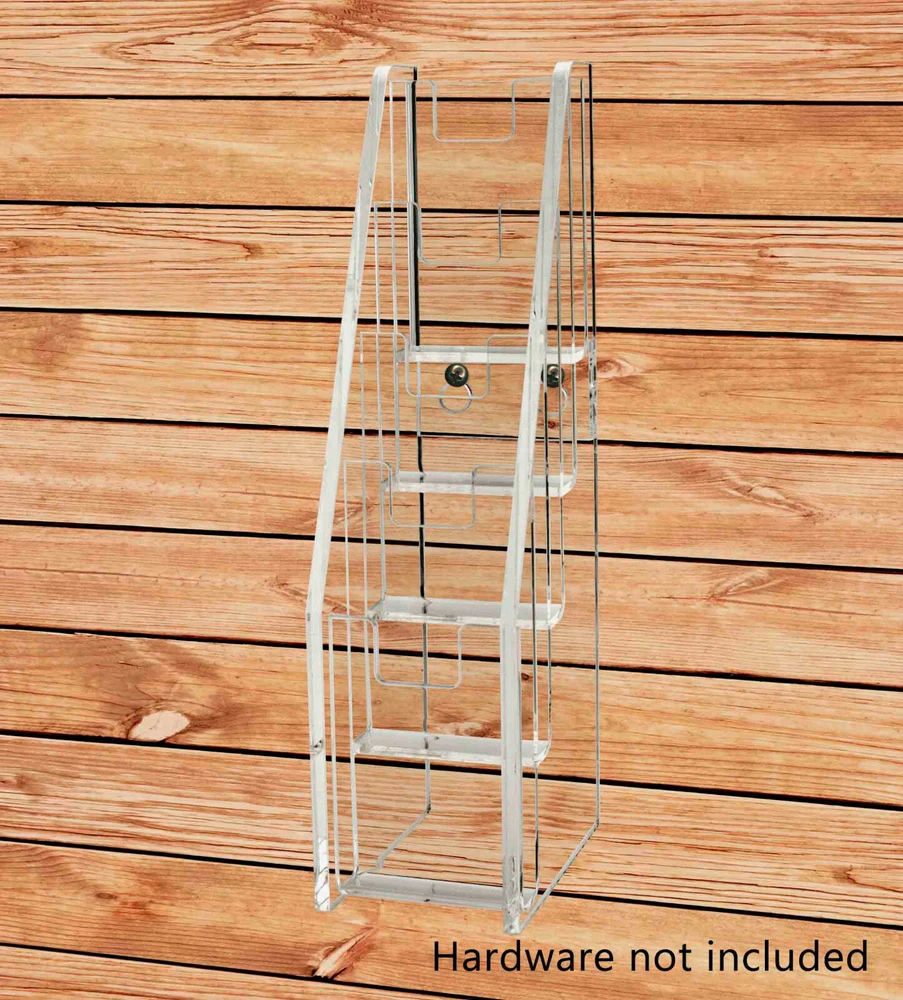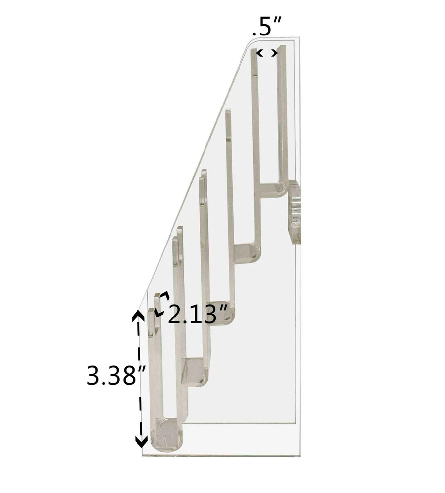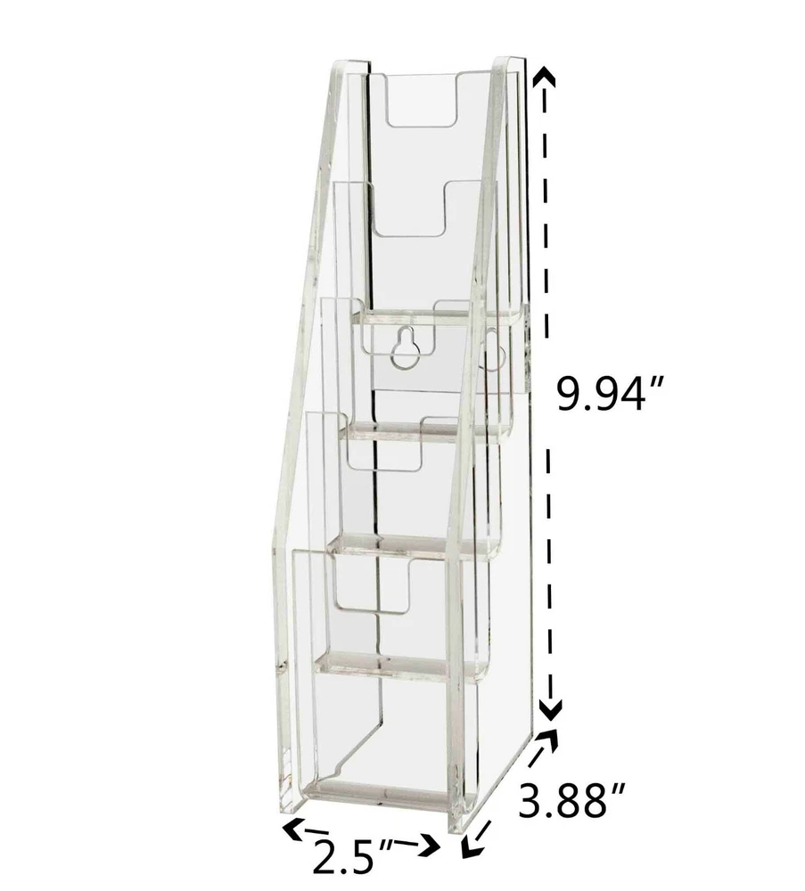 Tiered 5 Pocket Business Card Gift Card Holder Wall Mount or Countertop Product Features: Holds 2”W x 3.5”H standard sized vertically designed business cards, appointment, membership, gift or rewards cards Pocket Dimensions: 2.5”W x .5”D Overall Dimensions: 2.5”W x 10”H x 3.75”D Space-saving design displays five different cards in one convenient holder Freestanding and portable; display on top of a table or on counters and desks. Can also be mounted on walls Proudly made in the USA with premium high quality plastic This cascading business card holder is designed to hold and display multiple sets of business cards, gift cards, appointment cards or any other 2”W printed material. Made of durable plastic acrylic, the tiered card holder can be conveniently placed on desks, tables, retail counters, walls or anywhere you want to leave your cards for customers to take one. This plastic acrylic display stand is perfect for anyone who needs to promote their business and perhaps client cards on tables or counters in any office tradeshow expo or any other event. The display racks are mostly used where there are several different cards to display such as doctor’s office lawyers office or any salon. The holder allows you to showcase your information in a clear and easily accessible manner in one convenient place. The slim design space saver card organizers are great for placement in any service business, salons, reception areas, professional office, government office and other various venues such as trade shows, flea markets or expos. In addition to business information, the acrylic holders can also be used to display other small media like Security Gate Code Cards, Membership Cards, Appointment Cards, VIP Cards, ID Badges, Security Cards or Gift Cards. Retail stores can use these versatile holders to display stickers for resale. Store credit cards are often placed in the cases near the register or checkout stand to increase clientele and expand the customer base. Other times, simple gift cards or doctor’s appointment cards are placed in the pockets. *All sizes are approximate *Color and clarity may vary *Hanging hardware not included