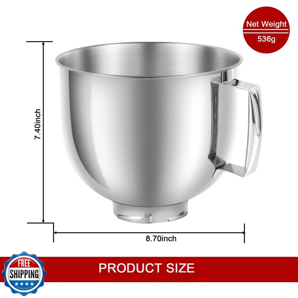 5 QT Stainless Steel Mixer Bowl Compatible with KitchenAid ArtisanandClassic Series 4.5-5QT Tilt-Head Mixers K45 KSM70 KSM150 etc. Replacment for KitchenAid Mixer Bowl(Light Weight) Features 5qt Stainless Steel Bowl: With ergonomic handle, it is easier to grip and more comfortable. Light-Weight Design, more choice for you. Perfect Fit: Our mixing bowl is designed for KitchenAid Cassic 4.5QT and Artisan 5QT series tilt-head stand mixers. Fit for K45SS, KSM75, KSM90, KSM100, KSM150, Good replacement for Kitchen aid bowl K5THSBP Food Grade 304 Stainless Steel: Our mixing bowl is made of high quality food grade 304 stainless steel, scratch resistant, rust resistant, durable and safe Easy to clean: You can simply clean them with soapy or warm water, also put them in the dishwasher. The sturdy stainless steel mixing bowls can complete a full cycle of washing. This makes cleaning almost effortless and saves you a lot of valuable time! Buy with Confidence: We promise to provide the best service to all customers, if you are not satisfied with stuff you get, contact us to return the product for replacement. Shipping Free & Fast Shipping: We offer free shipping to most of the USA with a normal delivery time of 3-7 days. However, due to the current situation, additional delivery time (up to 3 weeks) may be required for some items. Alternative Carriers: We may use alternative carriers (e.g., USPS, FedEx, UPS) to ensure your package arrives safely and on time. Due to the use of multiple carriers, we are unable to provide a tracking number automatically. Handling Time: Orders are processed and shipped within 1-2 business days of receiving cleared payment. Shipping Restrictions: Shipping to Alaska, Hawaii, Puerto Rico, Guam, and other US territories may incur shipping charges or delivery restrictions. Please contact us before ordering, or your order can be refunded/cancelled. State Restrictions: Certain items may not be shipped to California due to state regulations. Contact for Tracking Updates: If you require tracking updates or have any concerns about the delivery of your order, please feel free to contact us, and we will be happy to assist you. Return Policy 30-Day Hassle-Free Returns: If you are not completely satisfied with your purchase, you can return the item for free within 30 days of receiving it for a full refund or exchange. Easy Return Process: Contact us, and we will provide you with a prepaid return shipping label and detailed instructions. No Restocking Fee: There are no restocking fees for returns. However, the buyer is responsible for return shipping costs if the return is not due to a seller"s error. Refund Processing: Refunds will be processed within 1 business day of receiving the returned item in its original condition. Feedback Your feedback is extremely important to us. We strive to provide the best products and customer service possible. If you are satisfied with your purchase, please take a moment to leave us a positive review. If you have any concerns or issues with your order, please contact us before leaving negative feedback. We are committed to resolving any problems and ensuring your satisfaction. Contact Us If you have any questions or concerns, please feel free to reach out to our customer support team. You can contact us through the eBay messaging system. We are available Monday to Friday, 9:00 am to 5:00 pm EST, and we will do our best to respond to your inquiry within 24 hours. Thank you for supporting our small family business!