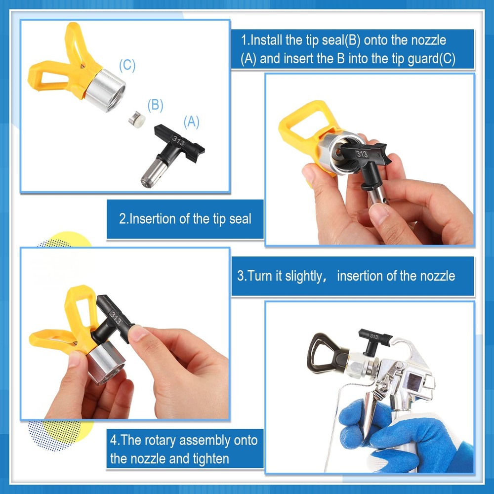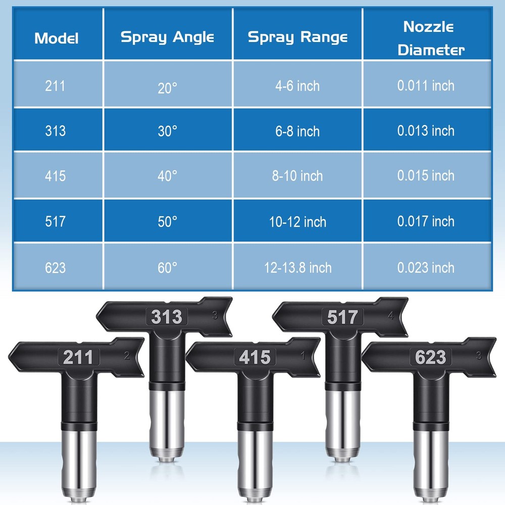 Features: Long service life: Adopting quality stainless steel material, our reversible airless spray tip is quality and not easy to break and wear, not easy to deform and thus offers you a better using experience. Nice gift: You can send this practical reversible spray tip as a gift to your father, boyfriend, painter, worker and so on, offering people nice working efficiency. Specifications: Size: 211, 313, 415, 517, 623 Color: black, silver Material: 304 stainless steel, tungsten carbide, nylon Package includes: 5 x Black reversible switch tips Warm notes: Please allow a little error on the size due to manual measurement. The color might exist slight difference due to different displays. Please read the size instruction carefully before purchasing. Nice Compatibility: these paint sprayer tips are compatible with most airless paint sprayers, and 211, 313, 415, 517, 623 correspond to the nozzle diameters of 0.011 inches, 0.013 inches, 0.015 inches, 0.017 inches, 0.023 inches, and the spray range is 4 to 14 inches Considerate Combination: you will get 5 airless sprayer spraying machine parts of different sizes, namely 211, 313, 415, 517, 623; Each is equipped with an airless nozzle and a nozzle seal; Different model combinations can better meet your different needs Broad Utilization: spray tips with a variety of models to choose from to meet your different use needs, such as paint, furniture, fences, home decoration, industrial fine paint and decoration and so on; Also they are applicable for various surfaces and materials, such as industrial enamel, varnish, water based paint, internal and external wall latex paint, fireproof coating Easy Installation: no tools are required to install, and airless spray nozzle can be easily installed on the spray gun in a few simple steps; First, use the nozzle to seal the nozzle into the protective seat, then insert the nozzle into the protective seat and rotate to complete the installation, time saving and labor saving for your project Quality to Use: reversible airless paint sprayer nozzle tip is composed of a 304 stainless steel handle and a tungsten carbide nozzle; The blade tip seal is made of stainless steel tip gasket and nylon, which is odorless, sturdy, simple to clean, and can be cleaned by rotating the nozzle, which can provide you with a long term service life