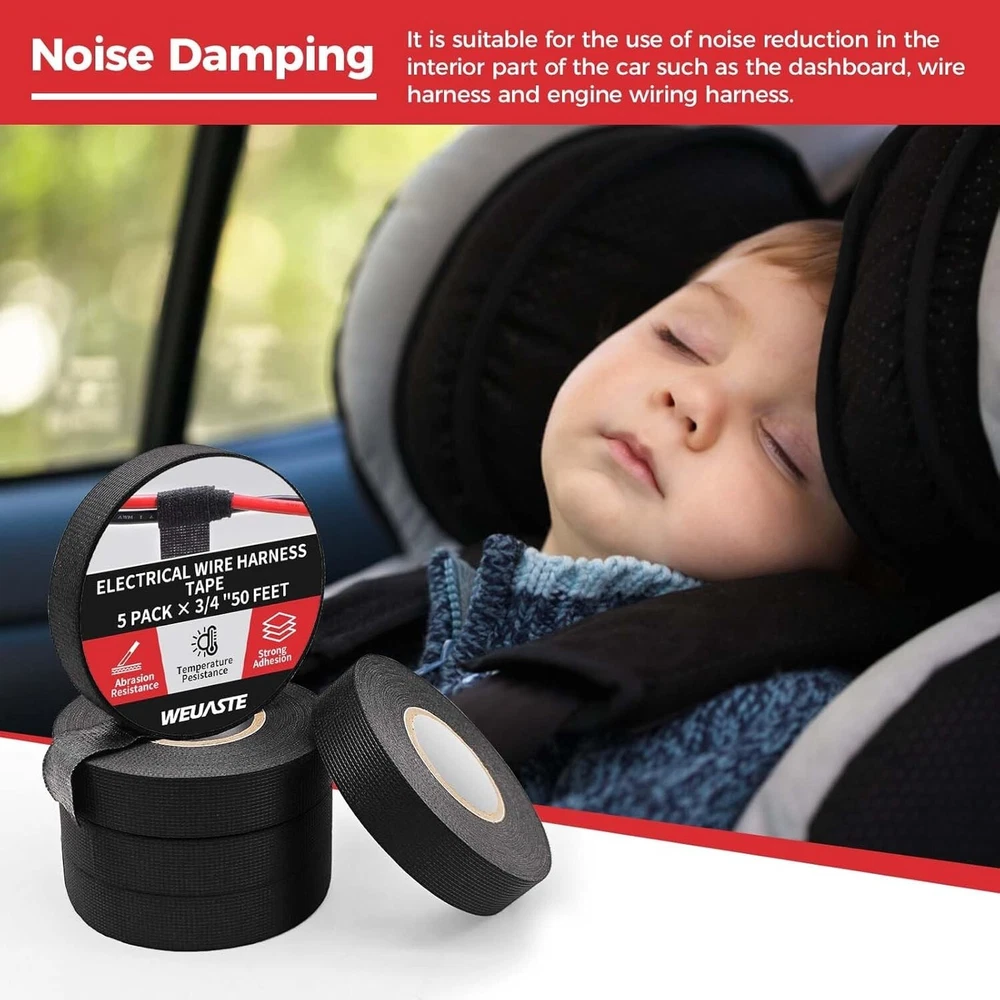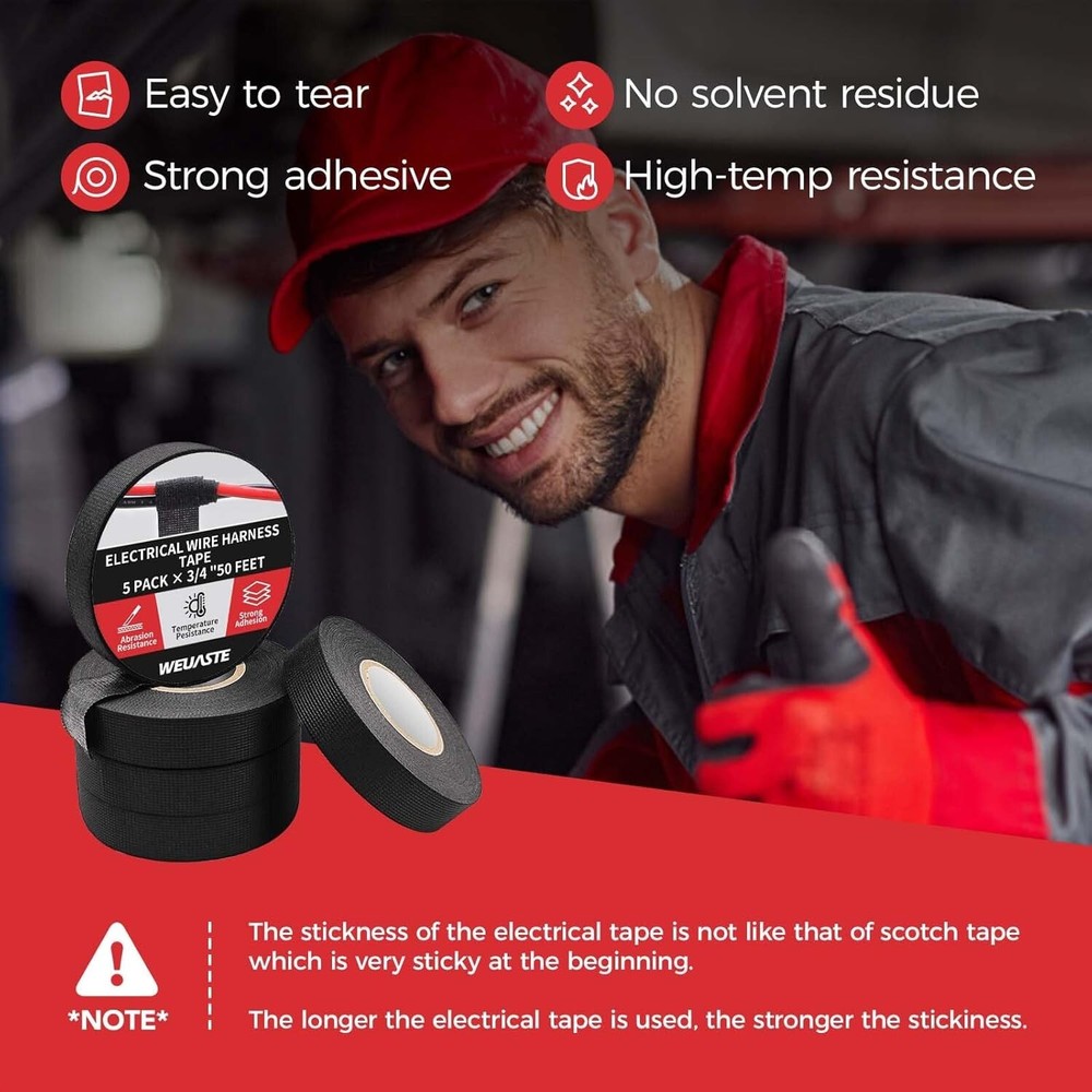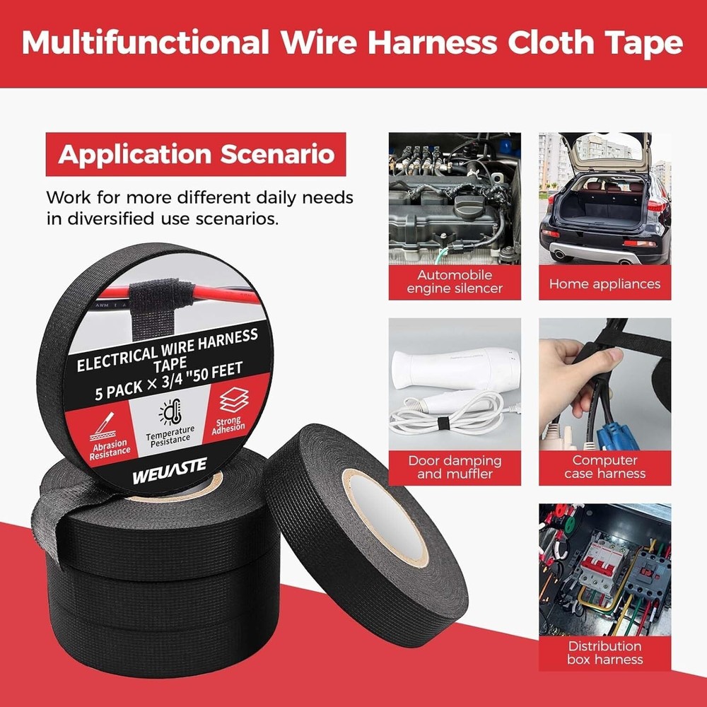 5 Rolls 3/4 Inch X 50 FT Premium Wiring Harness Tape High Temp Wire Cable Loom Color: Black Number of Items:; 1 Recommended Uses For Product:; Car, Indoor Product Dimensions: 600"L x 3.35"W x 0.75"Th The wire harness cloth tape is made of soft and corrosion-resistant material. It's suitable for use in the automobile interior for noise reduction, like for dashboard wire harnesses, main harnesses, wire joints, and wire fixing. It can also be used to organize appliance wiring and more. The wiring harness tape has high adhesive strength, good noise reduction, is hand-tearable, has heat insulation, and is wear-resistant. It's suitable for electrical automotive engine and circuit maintenance, helping achieve insulation protection. Flame retardation: extinguished naturally within 30s. Easy to Tear Just stick one end of the tape to the cable, then start pulling and wrapping the tape around the cable. You can gently tear it without needing scissors or other tools. You can decide the length of the wire cloth tape according to your needs. Professional Cloth Tape Material It's made of polyester non-woven fabric and strong acrylic pressure-sensitive adhesive. It has high viscosity, high temperature resistance (from -40°F to 221°F), good sealing, and excellent flexibility. This is a set of 5 rolls of wire harness cloth tape. Each roll of black electrical harness tape is 50 FT long and 3/4 inch wide, which can meet your different daily needs in various use scenarios. Return Policy: We offer a 30 day return policy from the receiving date. Please contact us for a Free Return Label. Please use our return label so it will go back to our supplier and we can do a refund or replacement afterwards. Feedback: Your satisfaction is very important to us! If you have any problem with your order, please contact us and we will do our very best to make you satisfied. As long as you are happy with your purchase, please leave a positive feedback for us. We will always leave you a positive feedback in return. If you have any problem with your purchase, please do not leave a negative feedback. Please Contact us ... and your issue will be solved quickly and positively We are a small family-owned business trying to make a living, not a huge company that does not care ... We will ALWAYS do our best for you!