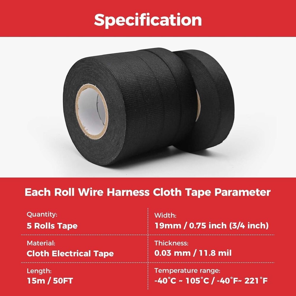 5 Rolls 3/4 Inch X 50 FT Premium Wiring Harness Tape High Temp Wire Cable Loom