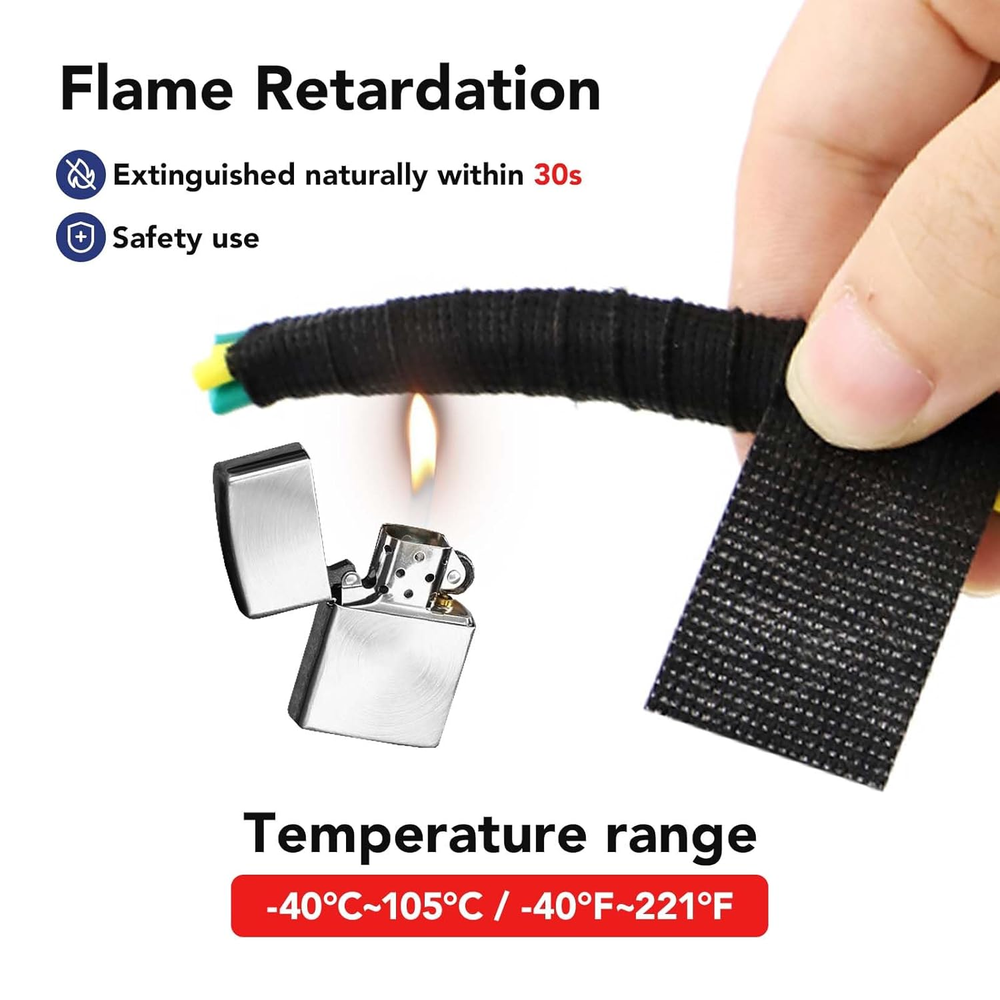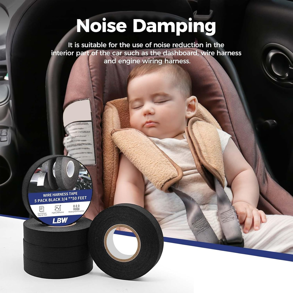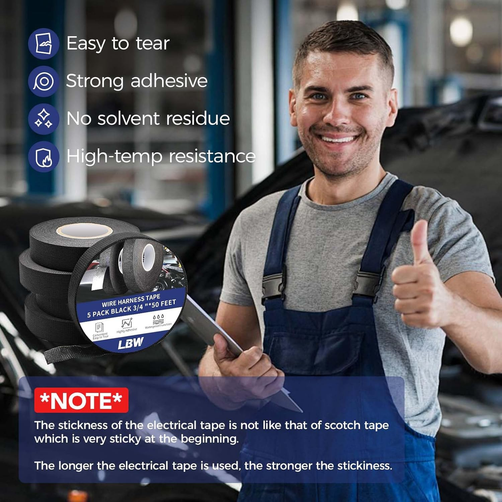 1. This wire harness tape is a game-changer for organizing and protecting cables! The strong adhesive keeps everything securely wrapped, and the heat-resistant fabric holds up perfectly under tough conditions. It’s super easy to work with—no fraying or slipping—and the 5-pack lasts forever. Whether you're tidying up car wiring or securing home electronics, this tape does the job flawlessly. Great value for the quality!