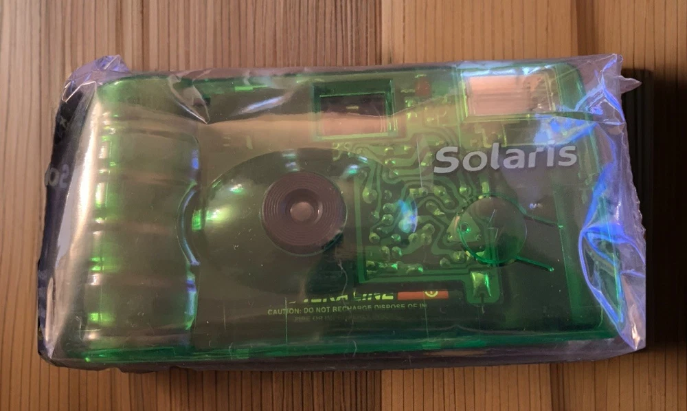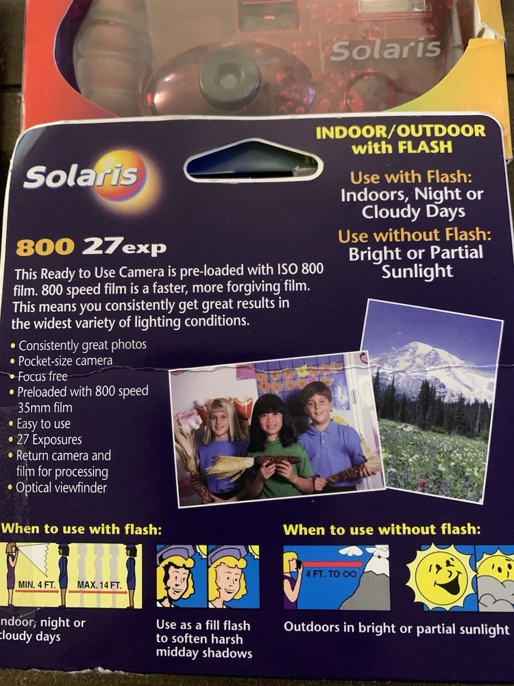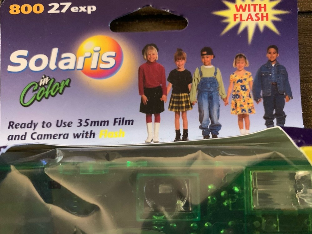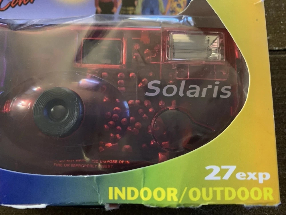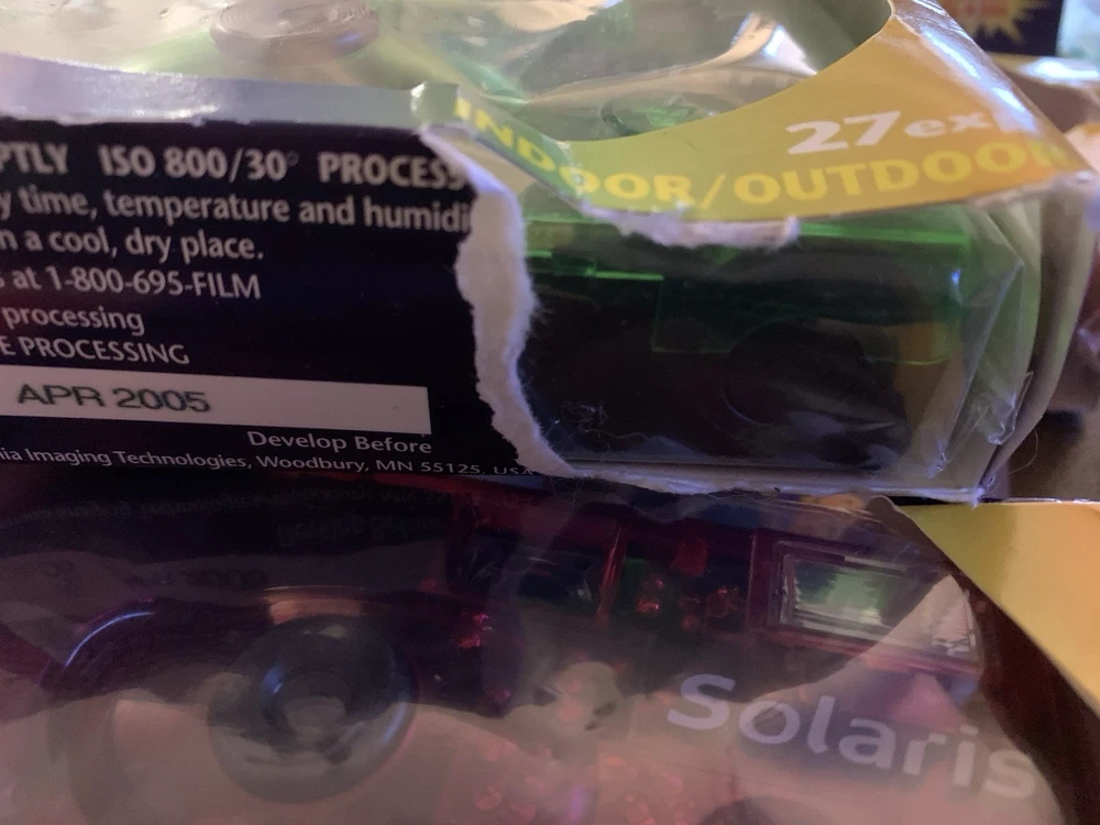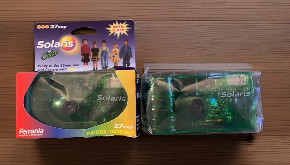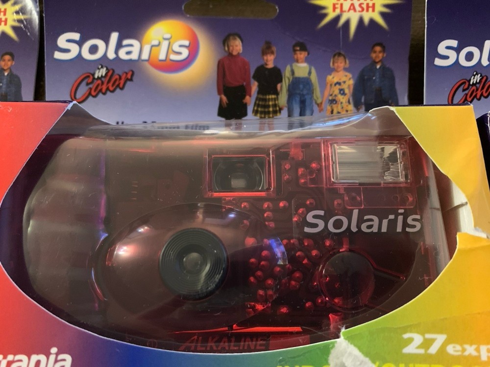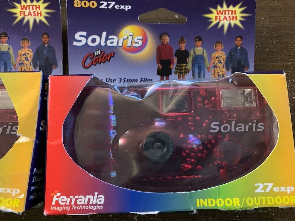 The product is a lot of five Solaris Ferrania disposable 35mm cameras, with three cameras in red and two in green. These cameras are part of the Solaris brand and are designed for photography enthusiasts looking for a unique and retro experience. Each camera comes with a flash and in color, adding a fun and creative element to capturing memories. Perfect for those who enjoy experimenting with different color schemes and styles in their photographs. 27 exposures. Indoor and outdoor use. SEE PHOTOS-All cameras in unsealed packages. Boxes are torn. UPC label removed from each box. Expired in 2005.