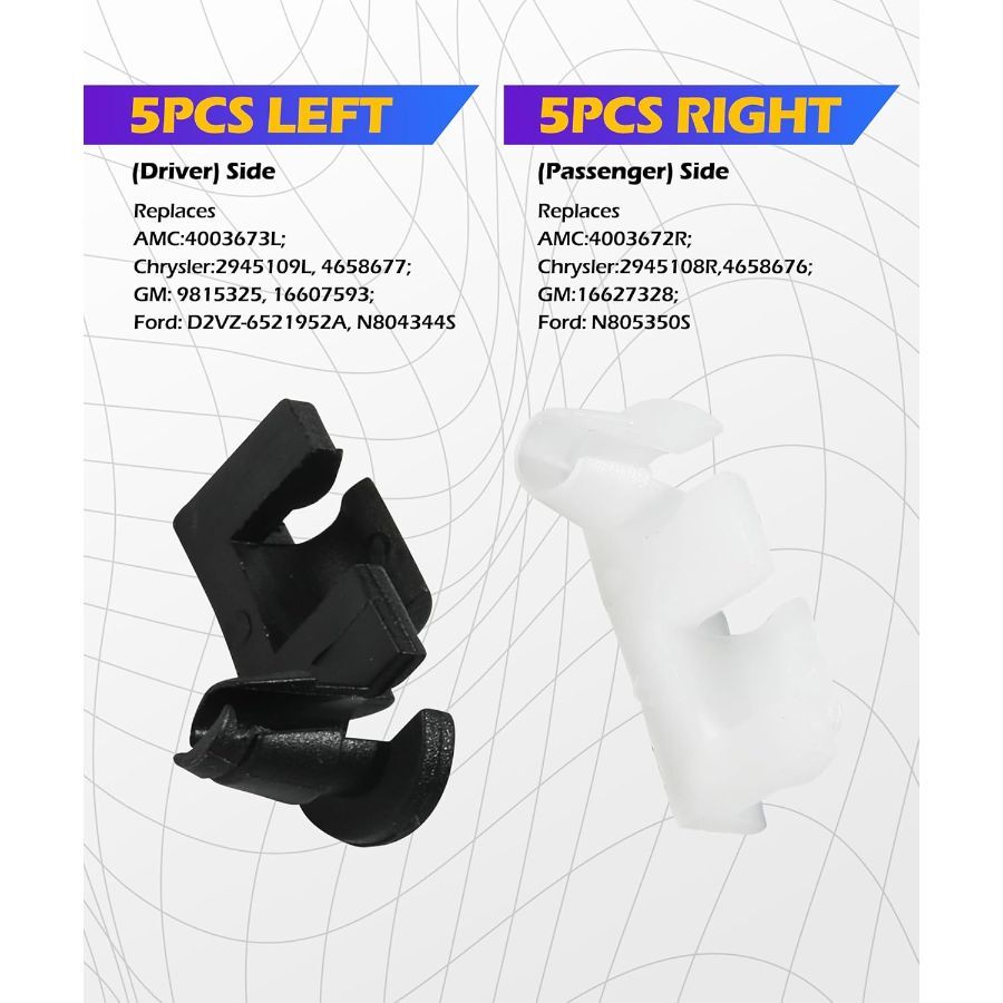 About this item [High Quality]: Door lock rod clip made of high-quality nylon material, it is very lightweight, strong, rust-proof, and resistant to wear, abrasion, and corrosion. It is not easy to break or crack during use and can be used for a long time. [Size Specifications]: Door lock bar clamp bar size: 1 x 1 x 1 inches; fits 1/4" hole (6.35mm). Accurate replacement for old, broken or missing clips. Meets or exceeds OEM specifications. [10 Pieces on Right Side (Passenger Side)]: White nylon, replaces #4003672R, 2945108R, 4658676, 16627328, N805350S. [10 Pieces on Left Side (Driver Side)]: Black nylon, replaces #4003673L, 2945109L, 4658677, 9815325, 16607593, D2VZ-6521952A, N804344S. [Widely Applicable]: Door handle lock lever hood latch lock push clip kit suitable for most cars, trucks, SUVs, etc. Note: Although the product description states that they fit your vehicle, please confirm whether the size is suitable for your vehicle before placing an order. Dimensions: 1 x 1 x 1 inches.