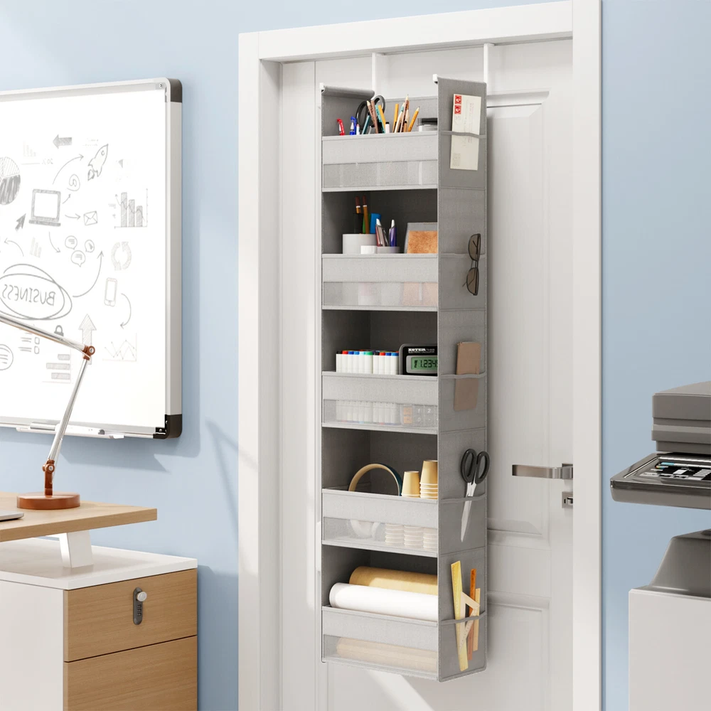 Large Capacity: This over the door organizer 5-shelf plus 10 mesh pockets would be great for cleaning your cumbersome things to free up more comfortable space for your family. high-grade & sturdy makings: Heavy Duty Fabric and thicker metal hooks, it's sturdy enough to completely fill up. The size of the product is 5"L x 13"W x 45"H. Multi-Purpose: It is a good storage for toys, purses, snacks, socks, scarves, gloves, yarn, accessories, bottles, cleaning supplies, clothes, and any other household items as you wish. Easy to Hang: We affirm that the size and the shape of this back door hanging storage are exactly what your family needs, 2 large exclusive steel hooks are adjustable better for your standard home-size doors, It supports the front bins decent not to sag or tilt forward. No More Tilting: Our over the door organizer is made of breathable non-woven fabric, which is safe for kids and family.