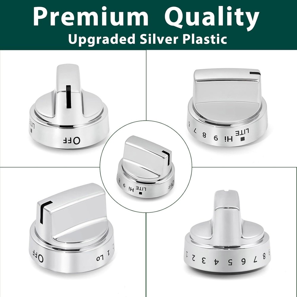 Description: Wide Application: Surface burner knob WB03X24818 lets you control the heat of the surface burner on the range. WB03X24818 Knob Replaces AP5989029, PS11729081 Compatible with ge gas stove. Applicable to the following models, not all: JGBS62REK1SS, JGBS66REK3SS, JGB860EEJ2ES, JGB860SEJ2SS, JGB860SEJ1SS, JGB720SEJ4SS, JGB720SEJ5SS, JGB645EEK2ES, JGB720EEJ4ES, JGB720EEJ2ES, etc. Check your furnace model and find out the part number of the knob that is campatible with it. Upgrade Quality: Our wb03x24818 gas stove knobs are made of highly durable materials, and the threaded mounting holes are reinforced with additional iron pieces, rigorously tested, compact & sturdy, heat resistance and wear resistance. After treatment, the surface of stainless steel has more texture and luster. Product Specification: Finish Type: Stainless Steel. Item Dimensions LxWxH: 2.25 x 2.25 x 1.9 inches. Shape: Round. This knob features bold markings for OFF, Lo, 1, 2, 3, 4, 5, 6, 7, 8, 9, Hi, and LITE. Our gas stove knobs which can help your stove look more uniform and beautiful. Easy Installation: Pull the knob directly from the column, remove it, and replace it with our knob. It is pretty easy to replace new parts on your model. Do not bend the knob up or down. If a handle is particularly stubborn, use pliers to remove it. Align the new knob holes and push them directly onto the shaft until they stop rotating. Repairing appliances by yourselves will save time and money. Please see Model Number fitment information at the bottom of this page before placing your order for this part. Package Included: 5 x Range Control Knob WB03X24818 Part Number WB03X24818 (AP5989029) replaces 4363588, PS11729081. Color: Silver On Jan 8, 2026 at 19:43:53 PST, seller added the following information:
