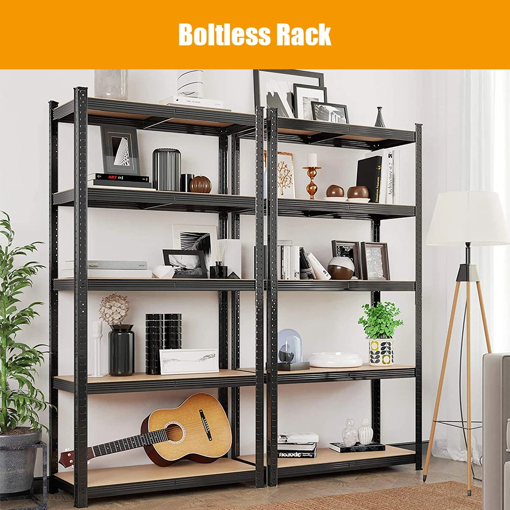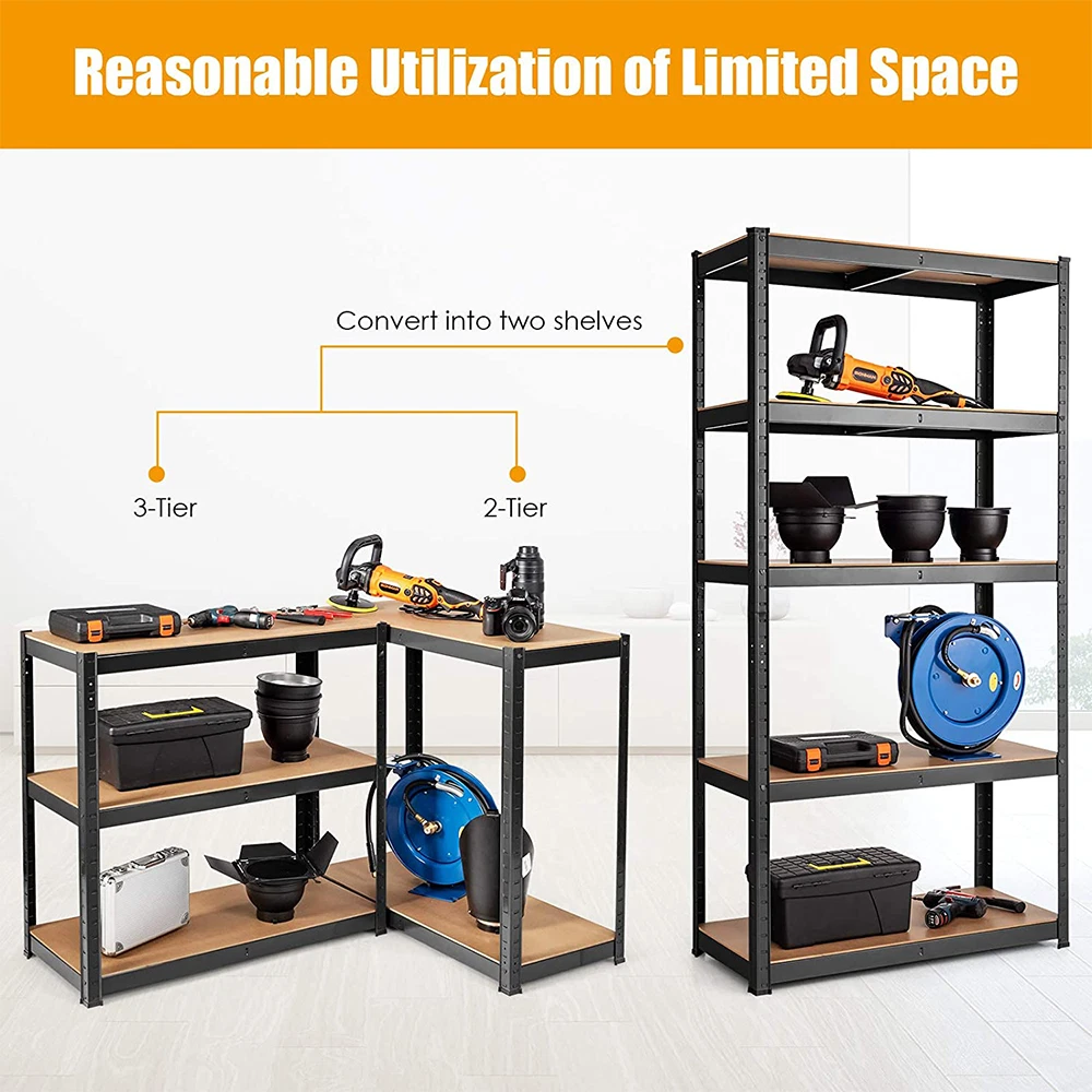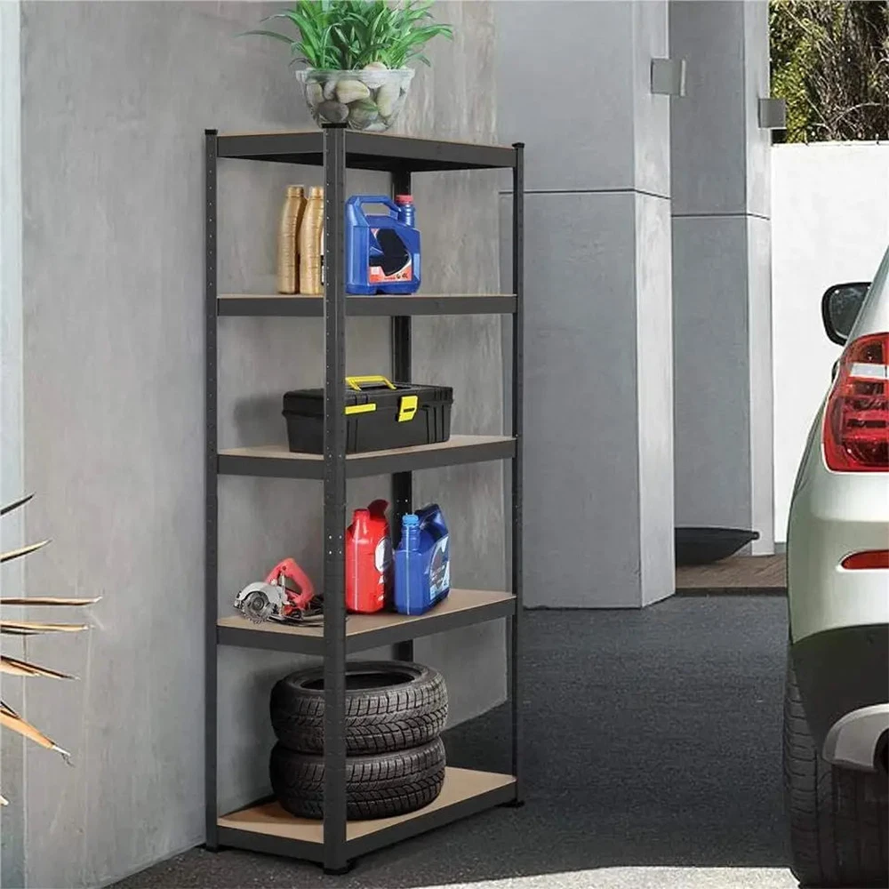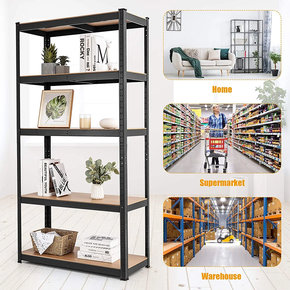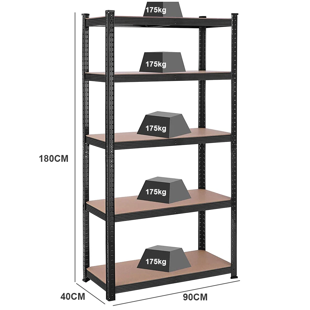 Features: 1.Adjustable height -- The height of the storage shelf is adjustable.You even can assemble them into two small shelves or workbench according to the needs of the use. 2.Heavy duty frames -- This storage shelf is constructed of premium metal plates and MDF boards, offering you a sturdy bearing with high capacity up to 175kg/386 lb per tier. 3.Durable -- The garage shelves feature antirust coating to ensure a long use life. 4.Moulded feet -- It features with moulded feet for added stability and also can avoid causing damage to the ground and floor. 5.Easy to clean -- Wipe With A Dry Cloth. 6.Easy to install -- This storage shelf arrives with flat packed but is easy to assemble as no screws or bolts are used. 7.Perfect for storage and organization. Multiple uses: The goods rack is versatile for basement, storage, workshop, shop, home, bedroom, living room, kitchen, etc. Specification: Colour : Black Material : Steel & MDF Size : 5 Tier Shelf, H 180 x W 90 x D 40 Cm Package included: 1x Storage Shelving Unit- Black