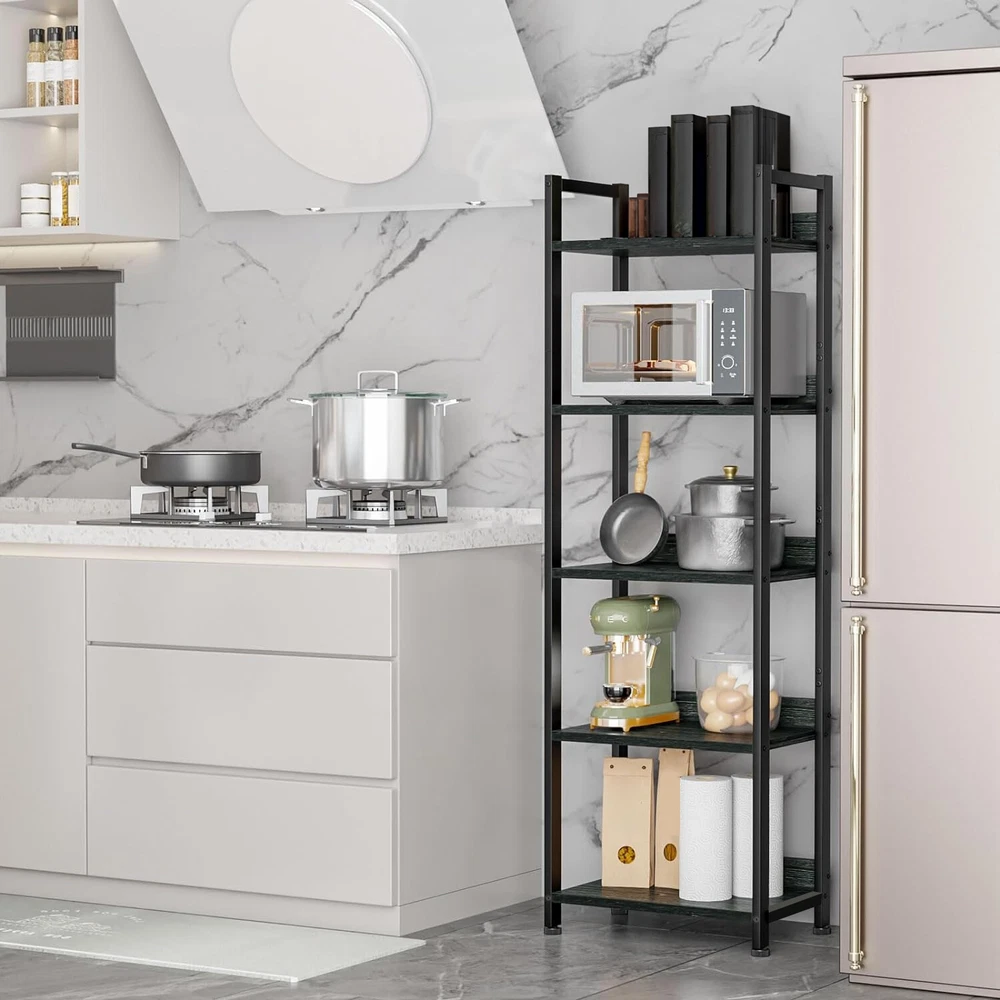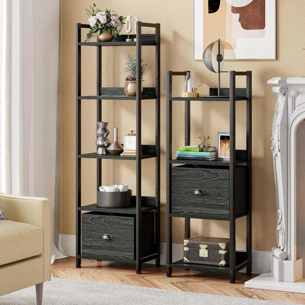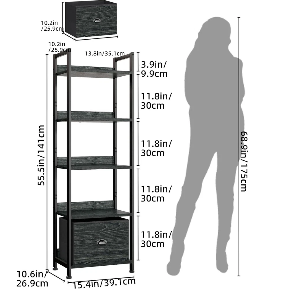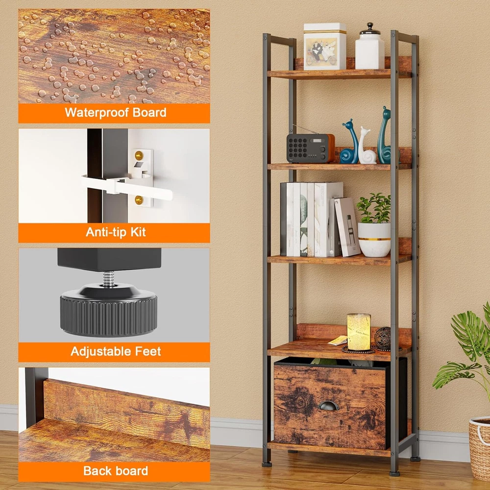 Shelf with Removable Fabric Drawer: This slender bookcase features a drawer with a fabric-covered surface, offering a light and soft touch. It can be paired with 2 to 4 tier shelves to customize your storage solution as needed. Space Efficient: This 5-shelf bookcase boasts a compact and lightweight design, taking up minimal floor space. Perfect for placing your favorite books, crafts, photo albums, and potted plants, it's a versatile storage and display option for your essentials and decorations. Multi-Purpose: The bookcase can serve multiple functions, such as a desk organizer, kitchen countertop organizer, display shelf, office bookshelf, plant stand, storage shelf, kitchen stand, and more. It's an excellent choice for decorating and organizing your living room, bedroom, home office, bathroom, kitchen, or entryway. Stable and Durable: Constructed from high-quality particleboard and a sturdy metal frame, this shelving unit includes a safety backboard, four adjustable feet, and anti-tip kits to ensure enhanced stability and durability. Each shelf can support up to 30 lbs, meeting your everyday storage needs. On Oct 26, 2024 at 01:47:10 PDT, seller added the following information: