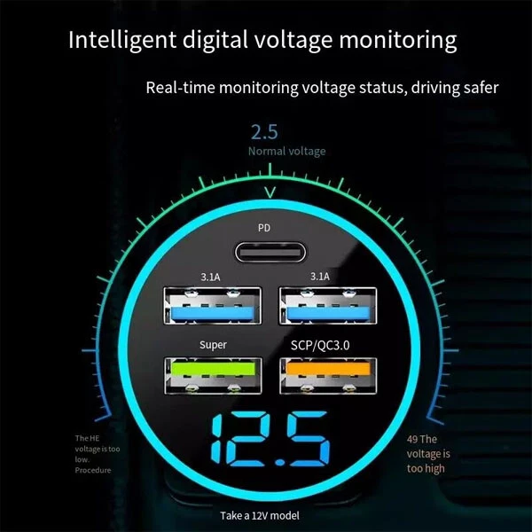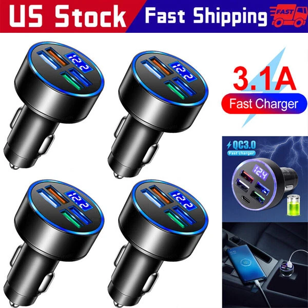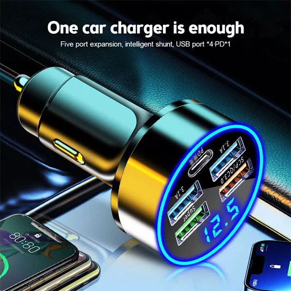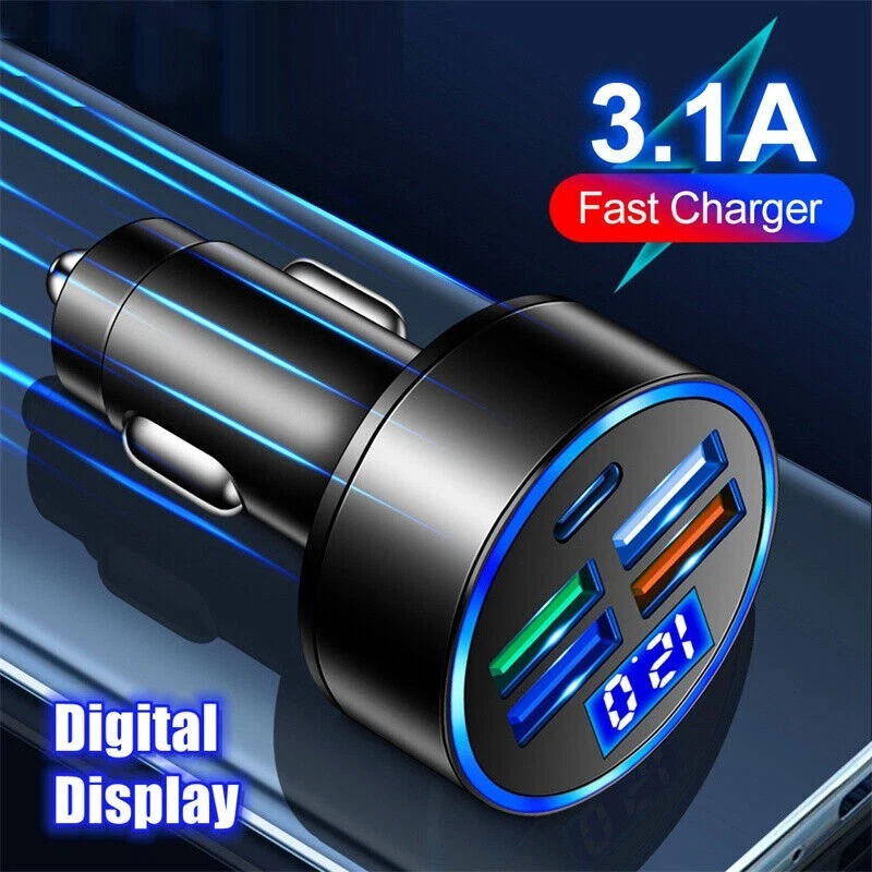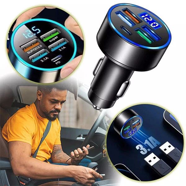 【Wide Compatibility】 Compatible with 12-24V cars, trucks, RVs, etc. Compatible with iPhone 15/14 Pro Max/15/14 Pro/15/14 Plus/15/14 iPhone 13 Pro Max/iPhone 12/11/10/XR/XS, Samsung Galaxy S22 Ultra/Samsung S21 Ultra/S20 Note 20/10 A52 A71 A51 A10E S9 S9 Google Pixel 6 pro/6/5, sports watch, car recorder, car camera, etc. 【Fast Car Charger】 150W multi-port charger adapter is made of ABS + PC material and comes with 2 USB 3.1A ports and 1 USB C port, 1 Super Fast USB A Port. The kids in the back seat of the car will love it when traveling. Because they don't have to fight over who gets to use the phone car charger first. The 5-port car charger is the perfect gift when you travel. 【Product Size】 78.0mm*32mm*32mm; net weight is 32g; input parameters are 12V-24V, suitable for cars and Suv. 【Stable Charging】 Built-in heavy protection functions such as overcurrent/overheating/short circuit/overvoltage/high temperature to ensure stable current output. 【Product Features】 Smart IC solution, smart shunt, overcharge, automatic power-off protection; Quick Charge 3.0 fast charging technology, backward compatible with QC2.0; for devices to be charged that do not support fast charging, adaptively allocate a larger current to achieve fast charging. Specifications: Item Type: Fast Charger USB 3.0 Car Charger Plug Material: ABS+PC USB Port Quantity: 5 Ports Buyer Note: If you are satisfied with our service, we appreciate you leaving us a positive feedback and 5 star rating review! Your opinion is important to the success of our business. If you are not satisfied with the product or have not received the product for more than 35 days, please contact us to resolve, we will do our best to solve. We are sure to come up with a satisfactory solution. Please contact us first before leaving cold feedback or good feedback of 1-3 stars and opening the case. We'll do our best to solve your problem. Because we believe that everything can be solved through communication. Thank you very much!