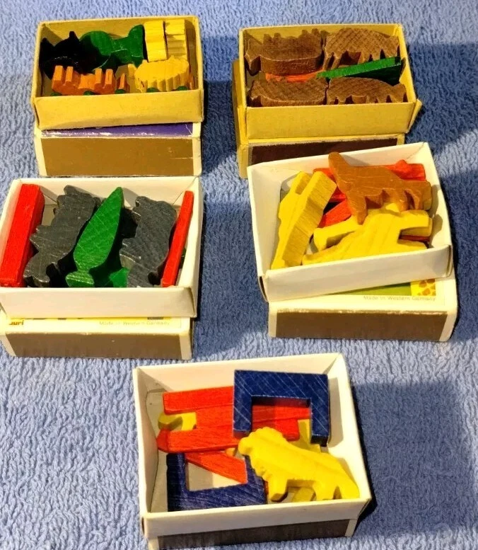 The vintage JURI Matchbox Miniatures Cow Bison Ranch Farm Wooden Toy from West Germany is a collectible toy set featuring miniature wooden figures of cows and bison. These toy animals are part of a farm or ranch playset, allowing children to create imaginative farm scenarios. Made in Germany, these vintage toys are likely to have a high level of craftsmanship and quality, making them desirable for collectors and vintage toy enthusiasts. The Matchbox brand is known for producing detailed and realistic miniature toys, making this set a charming addition to any vintage toy collection.