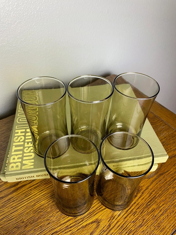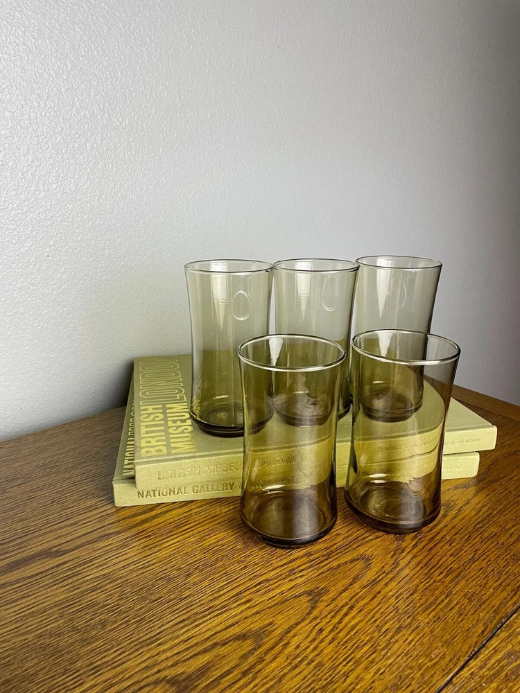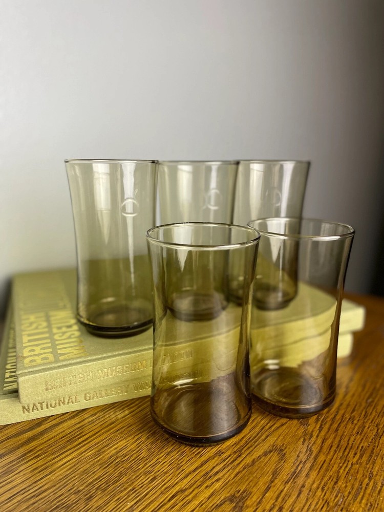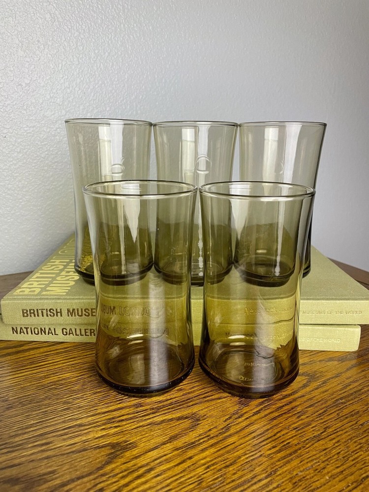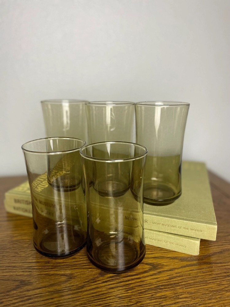 These 5 brown tumblers are from Libbey from the mid to late 70s. They are in perfect mint condition and would be excellent either on their own or to complete a larger set you already have! DIMENSIONS 2.75ʺW × 2.75ʺD × 5.25ʺH