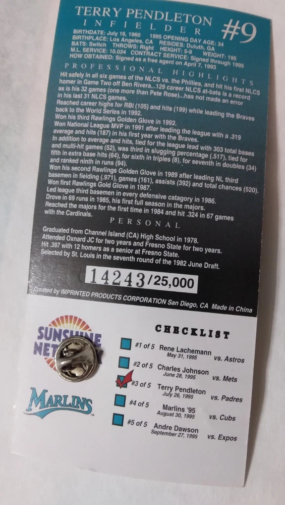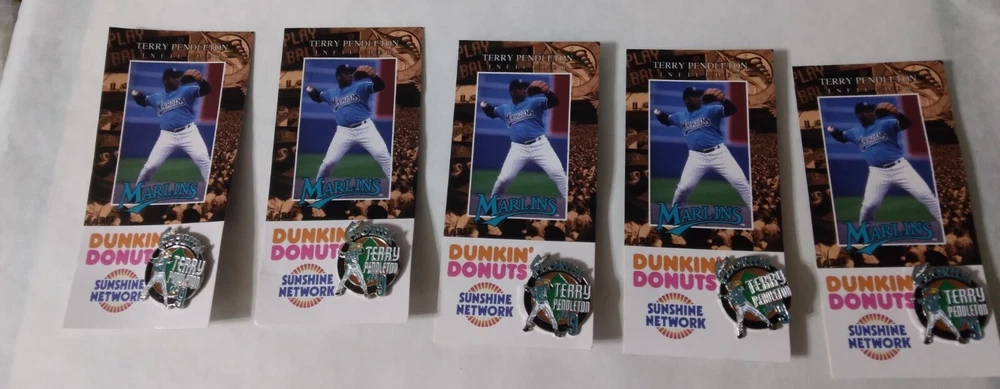 Lot of 5 Vtg 1995 TERRY PENDLETON #9 FLORIDA MARLINS MLB Baseball SGA PIN Mint on Cards