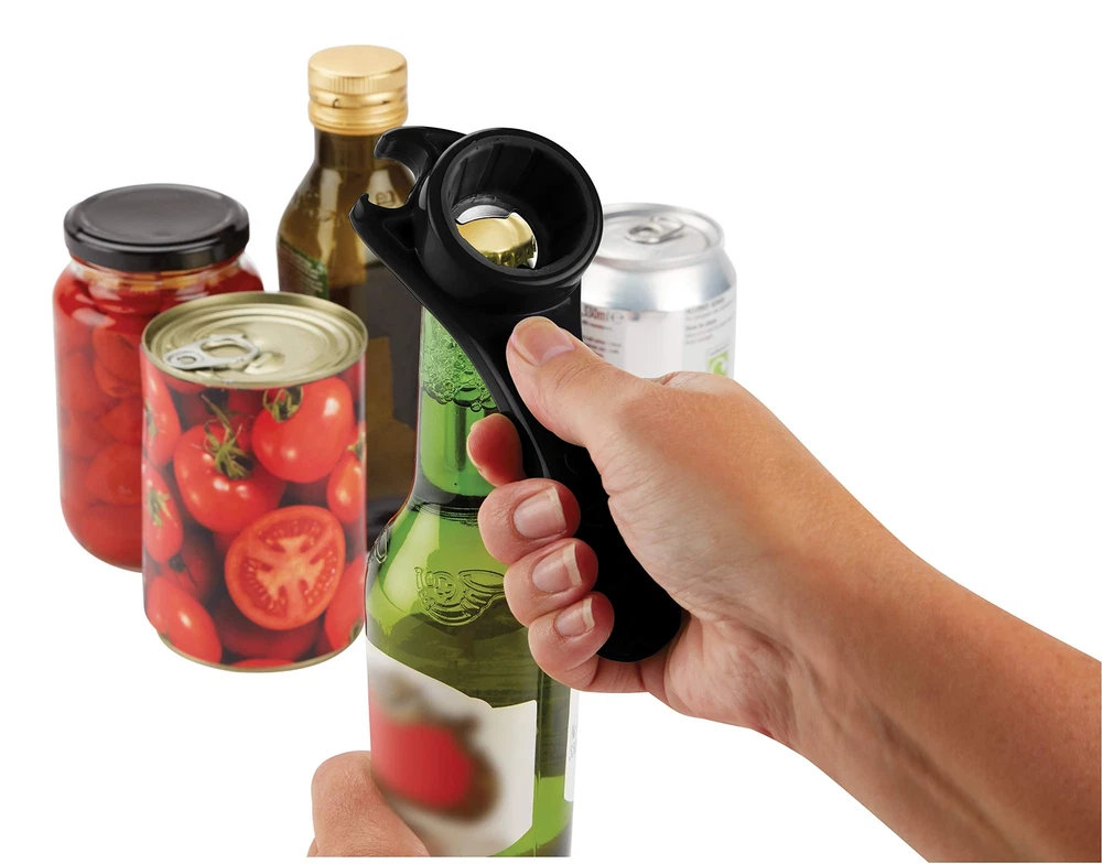 The 5 way opener is a simple and convenient solution for opening a variety of cans and jars. This multi-application opener can be used on metal bottle caps, soda pop tops, machine sealed plastic bottles, tuna can pull tabs and much more. Designed to break the vacuum seal on hard to open jars, The 5-way opener features an ergonomic grip. This enhances comfort while offering a secure grip every time. Multi-application opener for use on pull tab cans, plastic and metal twist-off caps, metal bottle caps, pop-tops and jar lids Comfortable soft touch grip Cut clutter with a device that opens a variety of jars and cans Dishwasher-safe 5-Year