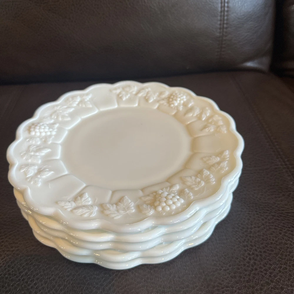 This beautiful Westmoreland milk glass plate is a vintage piece from the mid-20th century. The 6 1/4 inch round plate features an embossed and scalloped edge design with a decorative paneled grape pattern. The white plate is perfect for any occasion, whether it's a love and romance dinner, a bridal shower, or a holiday gathering. The plate is an original and authentic piece, made in the United States with a pressed glass production style. It's recommended to hand wash only for care instructions. The plate is a great addition to any eclectic style decor and is perfect for serving bread, butter, dessert, or any other dish. Get this unique piece now and add a touch of old-world charm to your home.