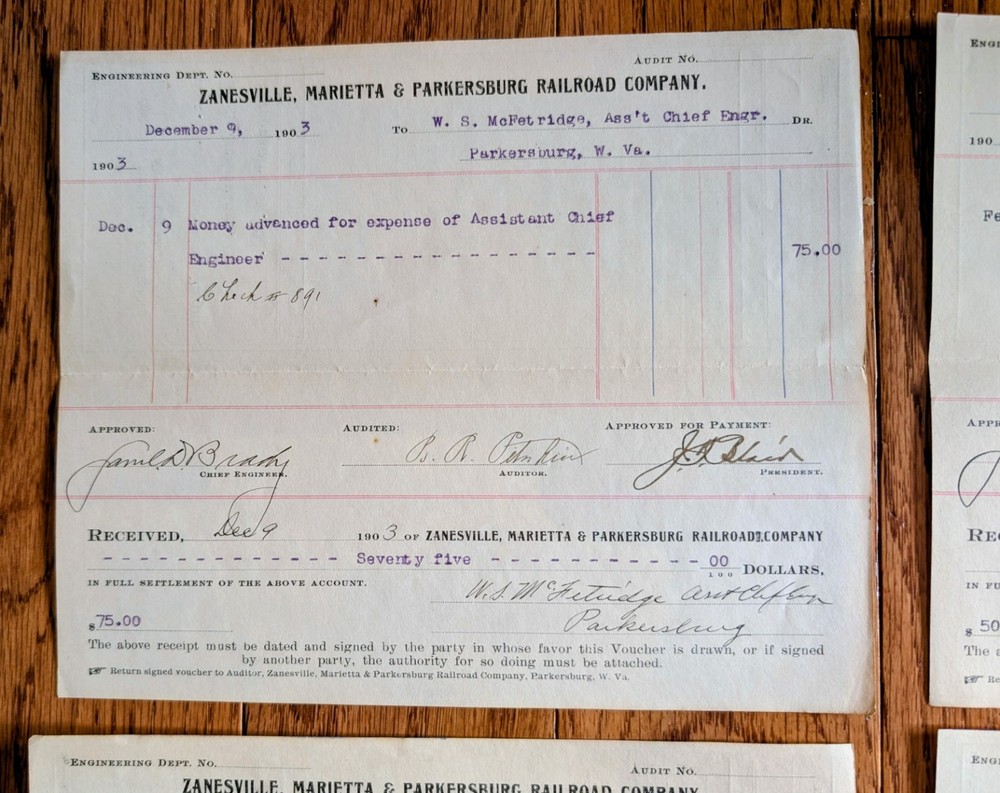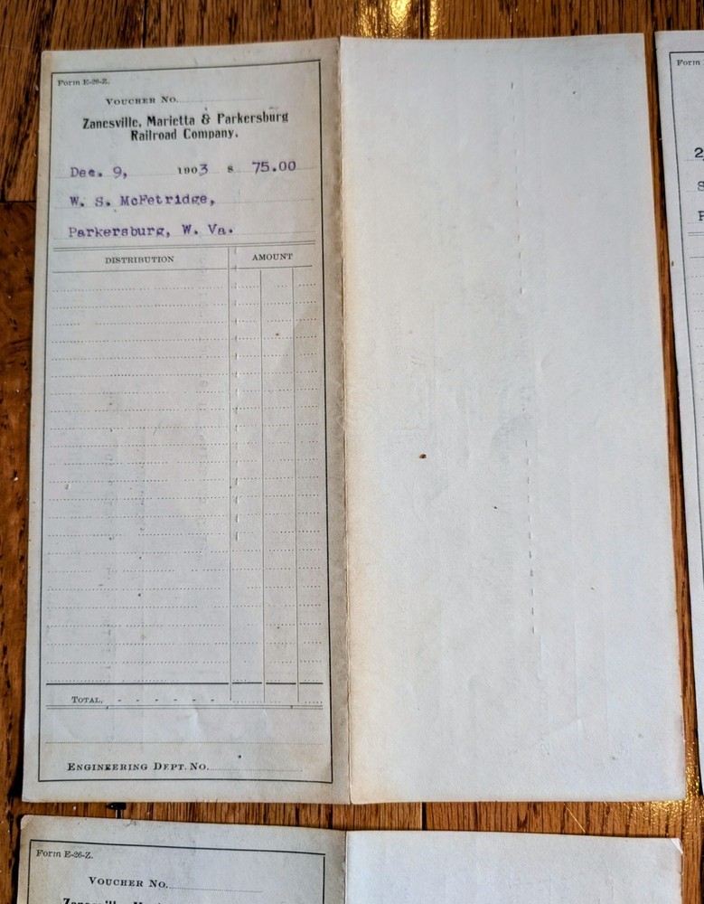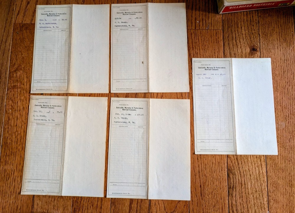 The product is a set of five Zanesville, Marietta & Parkersburg Railroad voucher sheets from the years 1903-04. These historical documents likely contain important information about the railroad operations during that time period, such as ticket sales, routes, and services offered. Collectors of railroadiana and train enthusiasts may find these voucher sheets to be valuable additions to their collection, providing a glimpse into the past of this specific railroad company. Shipping is 5.00