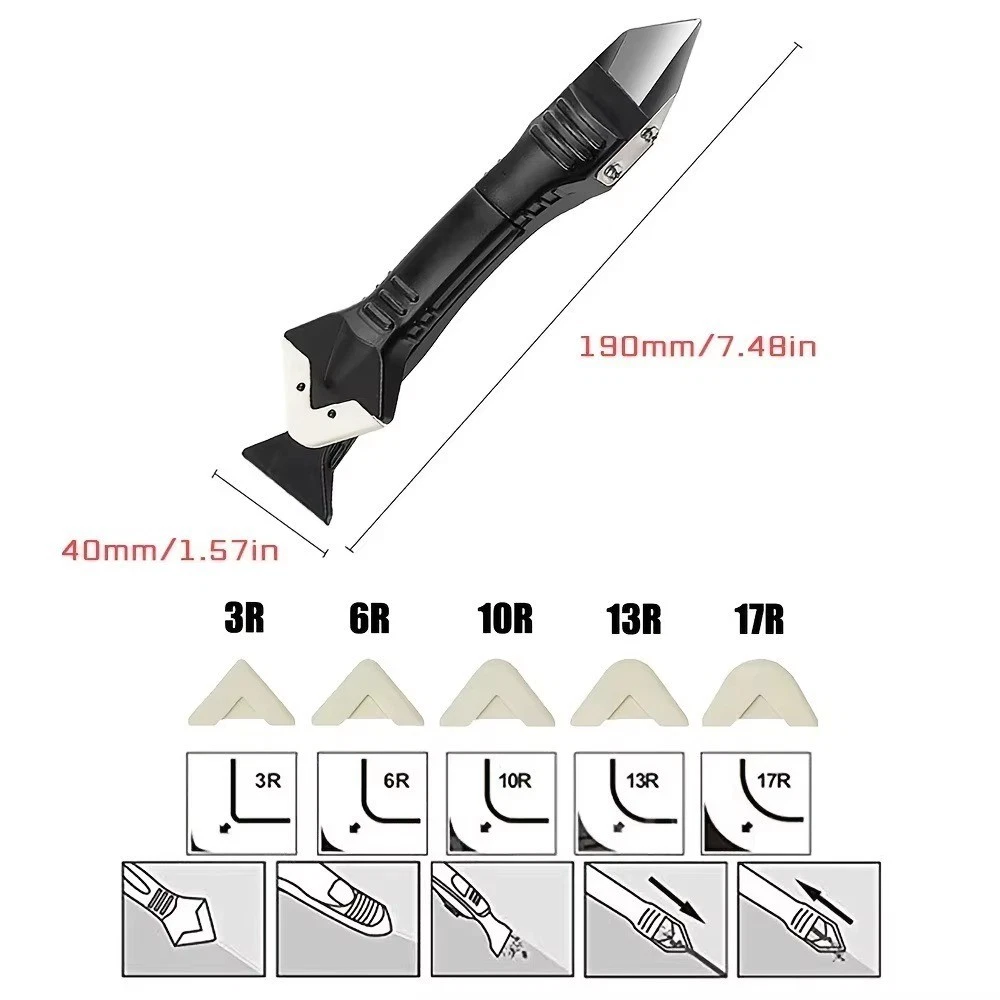 Description About5 In 1 Caulk Remover and Smoother It does not scratch the surface on which the silicon is being Now you can prevent any loose edges of silicone that trap moisture; It no need to dampen the surface,No need for masking tape; The spatula is finished with corners with different angles, allowing you to choose the appropriate tip for the job; Durable and no thorns,wearproof and solvent-resistance; The flat stainless steel won't scratch hard surfaces 5 IN 1 Caulk Tool; 5 in 1 Caulk Remover and Smoother; Use with the tool,saves half time to remove the dried caulk; NO Wsate of sealant,excess sealant could be saved on silicone pad; With 5 Sizes Radius Exchangeable Pads :3R,6R,10R,13R,17R for creating 5 shapes round angle; Ideal for corners,showers,windows.The smart dimension is applicable for interior and exterior caulking. Product Description : Condition: 5 In 1 Silicone Sealant Remover; Name: adhesive residue scraper; Material: Stainless Steel/Plasti