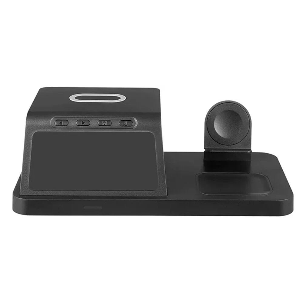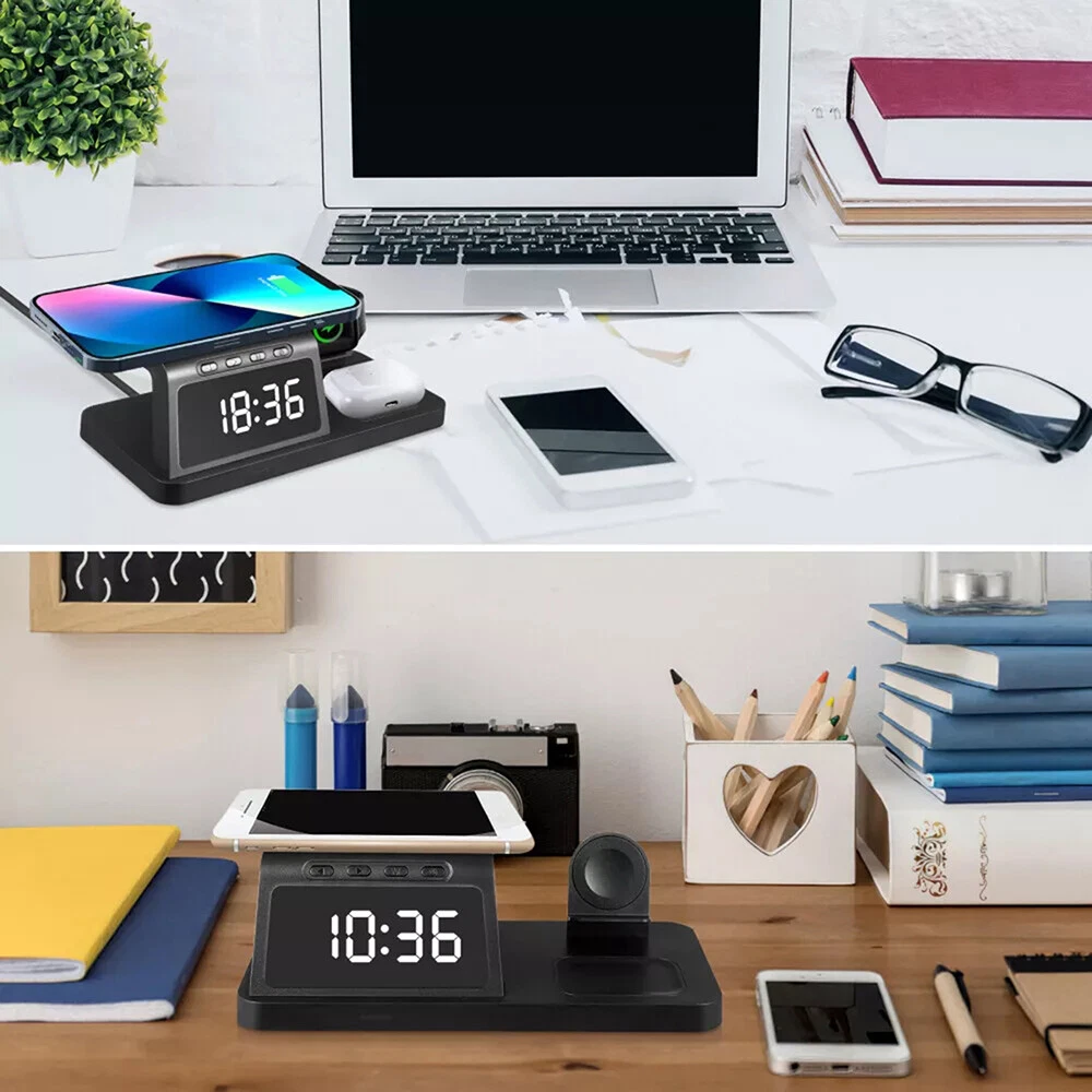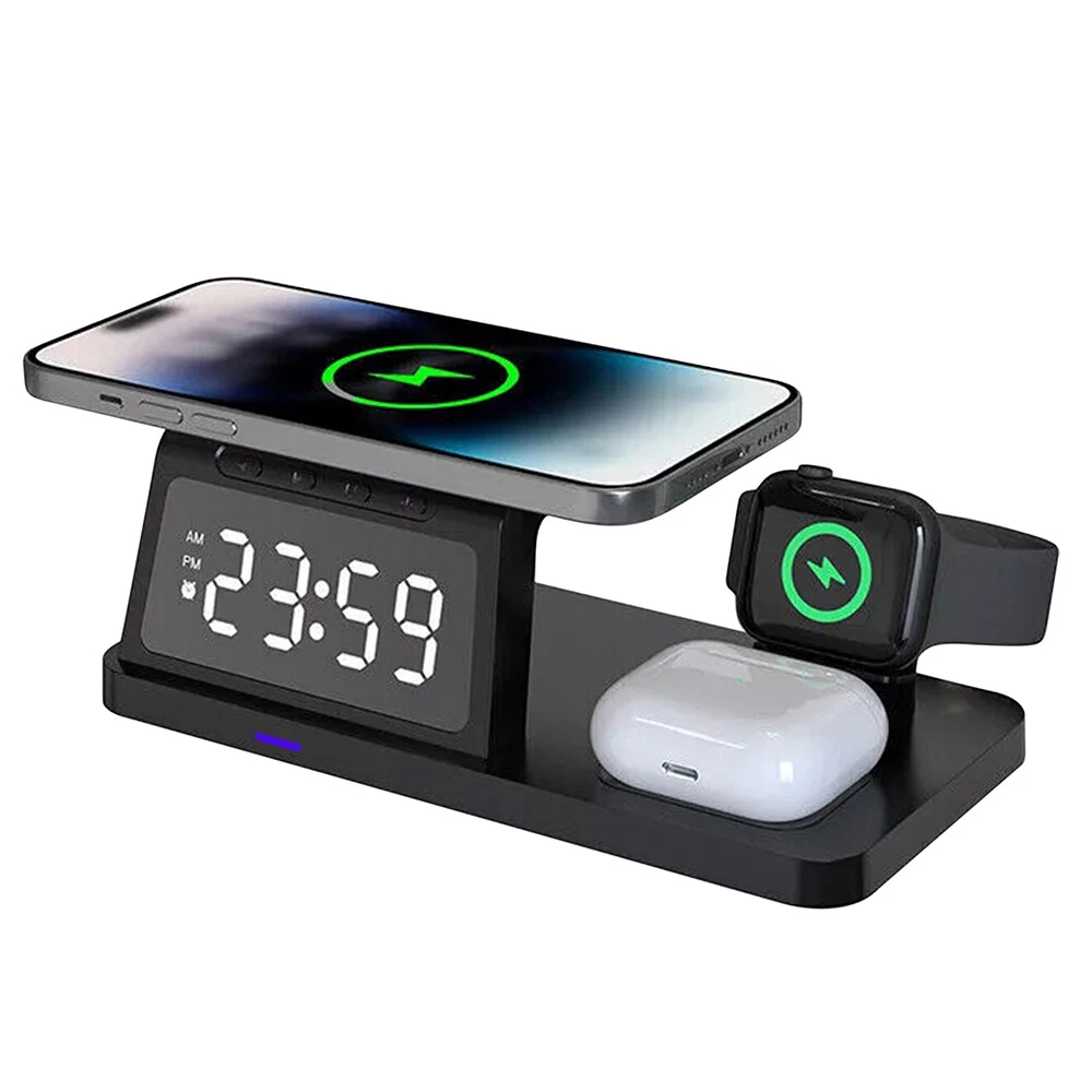 Features: [5-in-1]:The 5-in-1 wireless charger can wirelessly charge up to 3 devices, you can also connect 1 device for wired charging. It includes night light and alarm clock. LED Clock Display】:Equipped with time display and alarm clock, this charger is very useful to keep on your desk. [Widely Used]:The 5-in-1 charging cradle can be used in the bedroom, kitchen, office and anywhere you like. 5-in-1 Design】: The wireless charging station can charge your phone, Apple Watch, and headphones at the same time, leaving your desk and bedside table tidy and organized without messy cords. For better charging experience, please use QC 3.0 power adapter (QC 3.0 adapter not included). 【Safe Charging】:The cordless phone charger provides temperature control and voltage protection as well as short circuit prevention to ensure safe and stable charging. This wireless charger provides you with a safe experience. Anti-slip silicone pads on the base and bottom protect your device from scratches and slips while charging. 【Universal Compatibility】:Apple charging cradle for most Apple devices. Compatible with iWatch series 8/7/6/SE/5/4/3/2/1; Compatible with AriPods Pro/3/2/1; Compatible with iPhone series. (Not compatible with Samsung watches). Compatible with iPhone 8/X/11/12/13/14 series, Samsung S10/S20/S21/S22; Note8/10/20/21 series; other Samsung series that support wireless charging and all other cell phone brands that support wireless charging. Attention: 1.For a fast charging experience, please use a 9V-3A or 12V-2A power adapter (adapter not included). 2.The watch charger is only for Apple Watch, it can't charge Samsung Watch or other brand watches. Specifications: *Product name: 5-in-1 wireless charger *Mobile phone output: 5W/7.5W/10W/15W *Watch output: 2.5W (max) *Headphone output: 3W (max) *Charging distance: 1-8MM *Charging efficiency: ≥75% *Product Material: ABS *Product color: black Package List: 1*5-in-1 wireless charger 1*Type-C cable 1*User Manual Attention: 1.Not included not include the power adapter! 2.Item is limited to charger only, excludes headphones, watch! 3. Due to manual measurement, please allow a difference of 1 cm error! 4. may vary according to light color or monitor tint! On Dec 4, 2024 at 23:13:55 PST, seller added the following information: