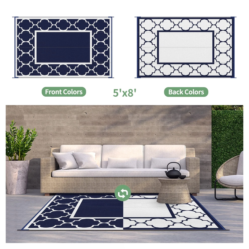 Upgraded Materials & Reversible Use: 's outdoor plastic straw rug, crafted from recyclable polypropylene, features eye-catching patterns and is fully reversible. Waterproof and wear-resistant, it's an ideal choice for camping, patios, and outdoor relaxation, thanks to the upgraded weaving process. Whether used on one side or the other, it seamlessly integrates with the outdoor environment, bringing joyful moments. Stylish Versatility: outdoor rugs boast a dreamy design that effortlessly complements any setting. The central space of the outdoor mat serves as a table spot for your patio or a practical surface during camping. Fused borders and elegant patterns make it the perfect indoor-outdoor rug. Mood-Boosting Colors: Choose stain-resistant dark tones or go modern with blue & white or black. The reversible mat, with outdoor carpet qualities, is easy to clean and coordinates seamlessly with various decors, serving as your perfect outdoor patio rug. Portable Outdoor Comfort: 's compact rectangular camping rug, available in various sizes (2.5'x8', 3'x5', 4'x6', 5'x5', 5'x8', 6'x9', 6' round, 8' round, 8'x10', 9'x12', 8'x16', 9'x18'), and ideal for all seasons, easily fits in your handbag. This waterproof rug, secured with stakes, transforms your outdoor space, ensuring a cozy spot for your camping adventures. Versatile Settings: Upgraded polypropylene ensures breathability and fast drying in this outdoor rug waterproof design. Perfect for the patio, deck, backyard, garden, porch, beach, Rv, picnic, or camping. Elevate your outdoor experience with !