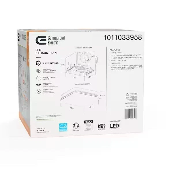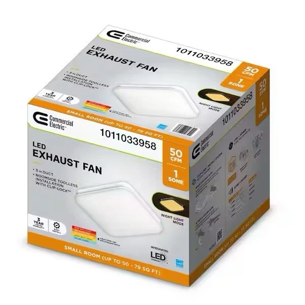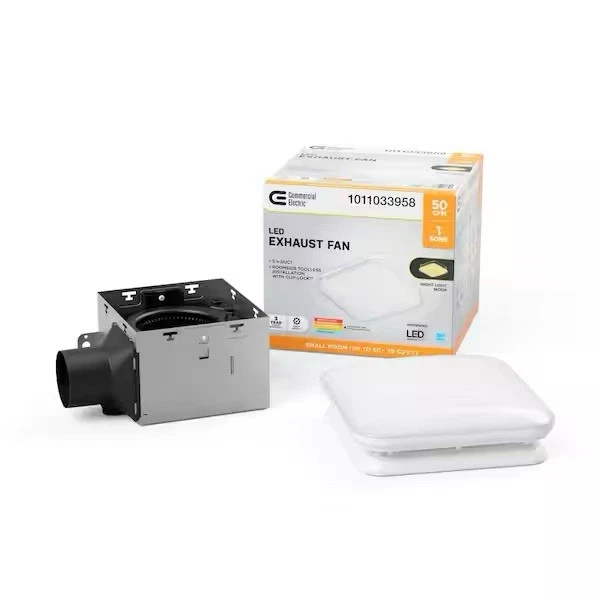 This Commercial Electric ultra quiet bathroom exhaust fan features a square design. This ventilation fan is quiet at 1.0 Sone, ENERGY STAR qualified 50 CFM fan, making it perfect for your small room areas. Ease of installation with the room side design for spaces with no attic access and quick template for drywall applications. Features a patented unique clip lock installation system attaching the bath fan securely to your ceiling dry wall. This bathroom exhaust fan is compatible with most dimmer switches and is equipped with a unique color temperature (CCT) changing technology. Now you can select your color temperature depending on your needs or preferences with the flip of a switch located on the back of the bath fan. Test different color temperatures before installation and never be dissatisfied with CCT again. The color temperature ranges from Warm White (2700K) to Daylight (5000K), with 3 options in between: Soft White (3000K), Neutral White (3500K) and Bright White (4000K) plus night light (2200K). 50 CFM, powerful ventilation to remove moisture in small spaces (up to 50 sq. ft.) 1.0 sones for quiet operating performance 10 in. square bath fan with 3 in. duct size and 7.5 in. housing High-performance LEDs produce 1,500 lumens with main light, 100 lumens night light controlled by wall switch 5-color temperatures available to select your preferred one: 2700K / 3000K / 3500K / 4000K / 5000K Built-in energy-efficient DC motor engineered to save more energy 3-year limited manufacturer warranty Input-voltage 120-Volt Ideal for managing odors and moisture removal in small rooms Damp location rated suitable for high humidity environments Click here for more information on Electronic Recycling Programs Return Policy Product Information Internet # 329101556 Model # BF1103 Store SKU # 1011033958
