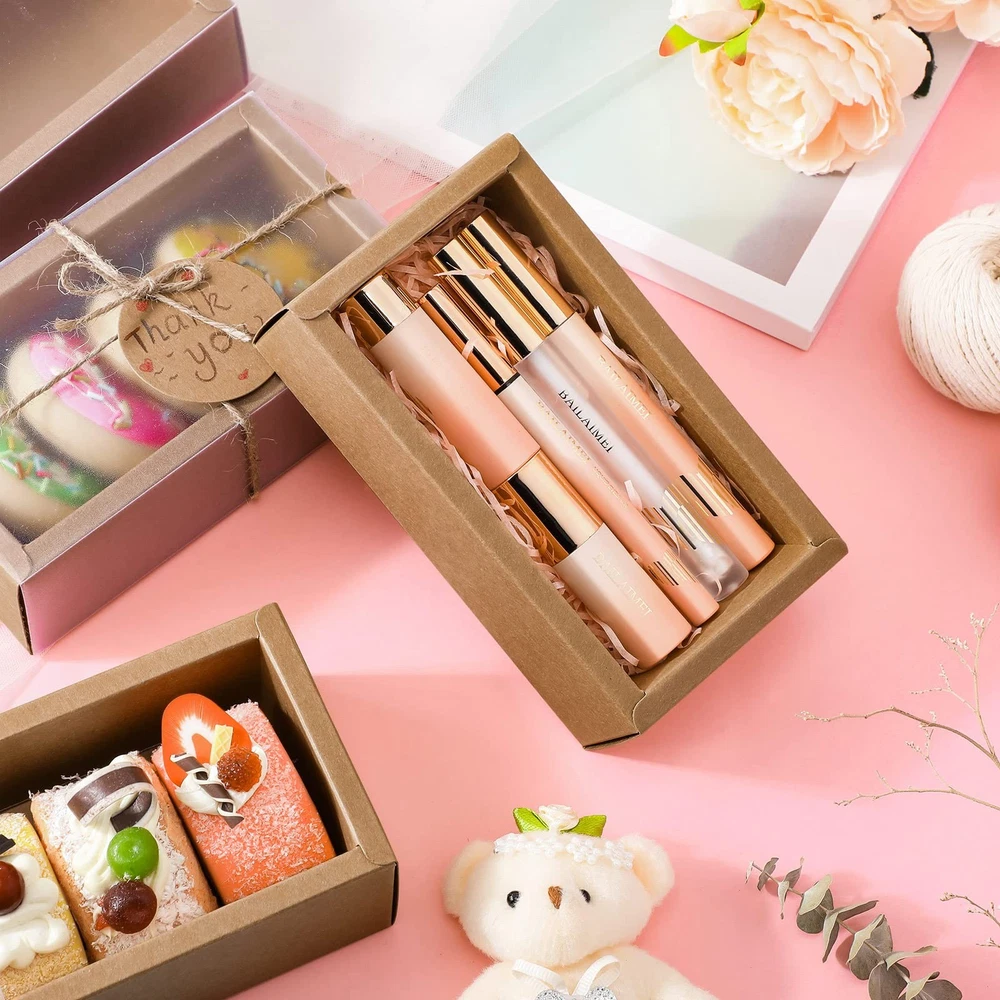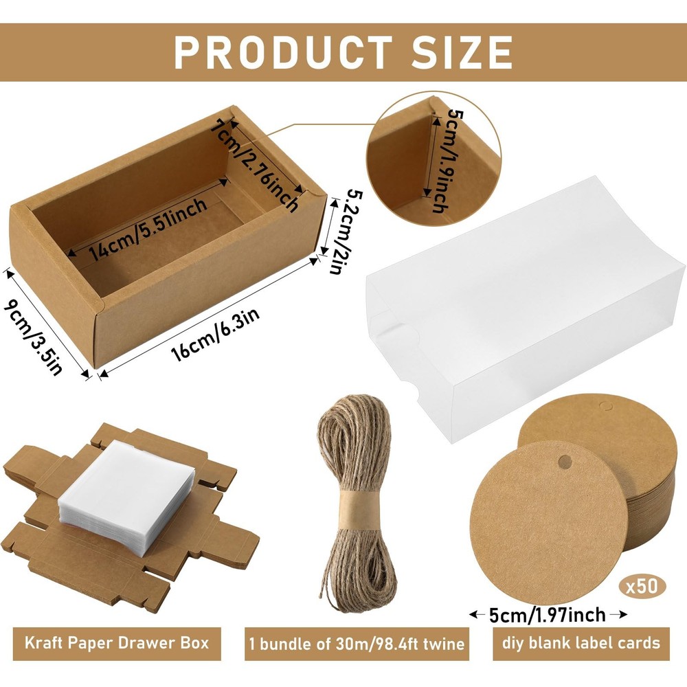 Features: PVC frosted windows design: The brown rectangular boxes for crafts feature matte windows design, having good texture, convenient to take off and not easy to scratched. You can easily view the contents of the box and display your gift. Share with others: You can write your concern and care on the round tags with holes, sending to your friend, classmates, teachers, neighbors and children during the holidays, who will be delighted to receive such delicate and thoughtful presents. Specifications: Material: kraft paper, PVC, jute Main color: kraft color Size: Rectangle drawer kraft boxes: about 16 x 9 x 5.2 cm/ 6.3 x 3.5 x 2 inches in outer size, approx. 14 x 7 x 5 cm/ 5.5 x 2.8 x 1.9 inches in inner size Jute string: about 30 meters/ 98.4 feet in length Package includes: 50 Sets rectangle drawer kraft boxes with clear PVC windows 50 x Blank round tags 1 Bundle of jute string Notes: Manual measurement, please allow slight errors on size. The color may exist a slight difference due to different screen displays. Winding risk may exist, please keep away from little kids. What Can You Get: the package comes with 50 sets of kraft boxes with window, 50 pieces of blank gift tags and 1 bundle of 30 meters/ 98.4 feet long jute string, practical combination to meet your using demands and sharing requirements Reliable and Long Lasting: the soap boxes for homemade soap are made of quality kraft paper, safe and lightweight, convenient for transportation and storage, sturdy and serviceable; The translucent matte window is made of quality PVC material, can serve you for a long time; Please see the video for installation steps Portable and Compact: the gift packaging boxes are about 16 x 9 x 5.2 cm/ 6.3 x 3.5 x 2 inches in outer size, the inner size measuring approx. 14 x 7 x 5 cm/ 5.5 x 2.8 x 1.9 inches; This size is suitable for you to store some small cakes, desserts, candies or other small gifts Easy to Assemble: the present boxes come in the form of flat, will not take up much of your space, can be easily assembled with creases, no need of glue or scissors; You can decorate the gift box by brown tags with twine, conveying your wishes Where to Apply: the gift packaging boxes are ideal for weddings, birthdays, parties, bridal showers, and festive celebrations, which can store and display jewelry, candy, gift, chocolate, cookies, cupcakes, crafts, and other small gifts packing