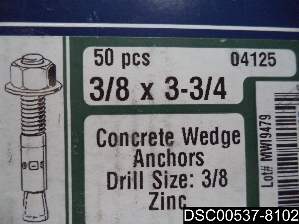 This item is:______Qty= 50: Midwest 04125 3/8" - 3-3/4" Concrete Wedge Anchors, Zinc ____________________________________________________________ This item is new, however, it may have scratches and marks from handling. See photos.__ Includes 50X what is shown in the picture. 1004 Warehouse Location:__Warehouse #1__Shelf____6268 Box 411_________________________ Sales tax will be added to items shipping to locations in Kansas. _____________________________________________________________________ _____________________________________________________________________ _____________________________________________________________________ By bidding and or purchasing this item(s) you (the buyer) agree to the following terms and conditions: 1. An item is defined as the following: The unit or units purchased in the ebay listing, (it could be a single unit, multiple units, a mixture of units, a variety of units, the incorrect unit or any combination of units not mentioned). It also includes the packaging, or lack thereof, the shipping label, and any contents place in the package by error. 2. The Seller is defined as Sellor and/or Consignor. 3. The buyer is defined as the entity that purchased the item from Sellor and/or Consignor. 4. If the buyer does not agree to these terms and conditions then do not purchase from us. 5. All items are sold AS IS No warranty or liability is expressed or implied. 6. The buyer agrees that: All items are shipped without insurance. It is the responsibility of the buyer to let us know if they want insurance on the item. Insurance cost is $2.00 for every $50 insured, in $50 increments. The buyer agrees that if no insurance is purchased and the item is not received or received damaged that no claim shall be brought against the seller. 7. We only ship to PayPal confirmed street addresses, no exceptions. No PO Boxes, APO, FPO or similar addresses. 8. The buyer agrees that the sale is considered complete once the carrier has picked up the item from the seller. 9. The buyer agrees that if there is a dispute that arises that the dispute will be settled in the State of Kansas under the laws of Kansas. 10. The buyer agrees that the item fits the buyers purpose prior to bidding. 11. The buyer agrees to indemnify and hold harmless the seller from any and all claims arising out of any conditions or defects for the item or items that they purchased 12. We only ship to the continental United States. The shipping price quoted is for the continental United States Only. All other locations will be charged extra. Out of county buyers agree to pay any additional charges that we ask them to pay including but not limited to import duties, shipping costs, packaging costs, time costs, and other costs. If the item is shipped via ebay global shipping program these terms and conditions still apply. 13. Claims made against the carrier for non-delivery, lost in transit or any other reason shall be made solely by the buyer without aid from the Seller. 14. In the event that any clauses or phrases contained here within are ruled out by a judge, the law, a lawyer, jurors, and or any other entity all others remain in effect. 15. If any claim is brought against the Seller the buyer agrees to pay for any and all costs including legal fees, travel, time, accommodations, and other costs. Late payment will result in the seller charging interest at the maximum legal rate. 16. In any event or circumstance the maximum liability to the Seller is the purchase price plus cost of shipping plus sales tax if applicable. This amount is not subject to inflation, interest, inconvenience fee or any other price adjustment. 17. The buyer agrees there will be no refunds for any reason outside of the Ebay return policy. 18. The buyer understands that our items are wholesale, overstock, unclaimed, foreclosure purchase or salvage goods. Most boxes have been opened for inspection and photos. If items are listed as new they may not come with original packaging. 19. The buyer agrees that they are trained, licensed, qualified, and understand how to properly use, dispose of and handle the product in accordance with law and regulations. 20. The buyer agrees that if any part of these terms and conditions is determined to be void that it does not void or alleviate the enforcement of the remainder of this contract. 21. Sellor and/or Consignor is not an authorized distributor, reseller or representative of the products featured on this website. All product names, trademarks, brands and logos used on this site are the property of their respective owners. The depiction, description or sale of products featuring these names, trademarks, brands and logos is for identification purposes only and is not intended to indicate any affiliation with or authorization by any rights holder.