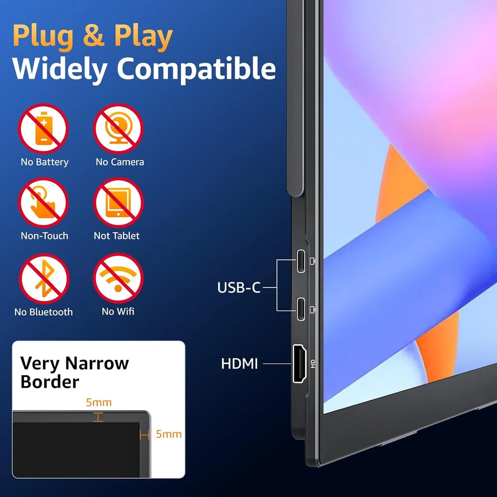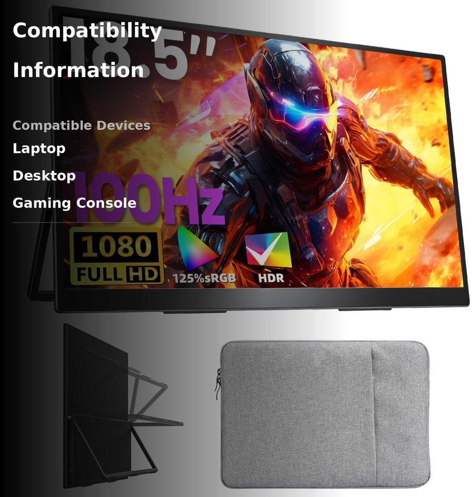 About this item 18.5 Inch Portable Monitor 100 Hz: Upperizon portable monitor adopts a 18.5 inch 1080p FHD IPS screen, featuring 125% sRGB (88% NTSC) and 8-bit color depth with 16.7 M colors display. Along with such a high-quality screen, this laptop extended monitor with the upgraded 100 Hz refresh rate has a faster response time and smooth graphics, allowing you to get a head start on your gaming while providing a more comfortable and smooth experience. A sleeve case included with the monitor, so portable Frameless, Ultra-Slim and Portable: Adopting the 3-Sided Frameless and lightweight design, this portable travel monitor is 0.59 inch thick and weighs just 2.7 lb, enough to easily fit into your carry-on backpack and you can carry it without burden. Whether you're in the office, at a coffee shop or at a friend's house, the portable computer monitor for laptop makes it easy to take it out of your bag and enjoy your second screen anytime, anywhere Portable Monitor for Laptop: The portable display has two USB-C ports and one HDMI port, so you can easily connect it to any major device you have, like Macbook, Surface, laptop, PC, Xbox, PS4/5 and more. Just ONE Single USB-C to USB-C cable to Plug & Play without any hassle. (NOTE: your device must have Thunderbolt 3/4/5 or Full-featured USB-C port). If you meet the issue of screen flickering, normally caused by insufficient power supply, then please use the original power adapter Eye Care, Flicker-Free and Built-In Speakers: With the Blue Light filter, Anti-Glare Coating and Flicker-Free function, the portable gaming monitor is able to protect your eyes and improve your viewing experience. Built-in speakers offer an enhanced entertainment experience when viewing videos and playing games Portable Laptop Monitor with VESA and Kickstand: The laptop screen extender monitor is VESA compatible, so you can easily attach it to a monitor arm or stand on the desk or wall. You can also use this external monitor for laptop vertically or horizontally, depending on your different needs. With the built-in kickstand, this portable second monitor gives you the flexibility and convenience to boost your productivity Product description Previous page Next page Previous page Next page Previous page Next page VESA Compatible Standout Kickstand Portrait Mode Dual Speakers Sleeve Case Included Previous page