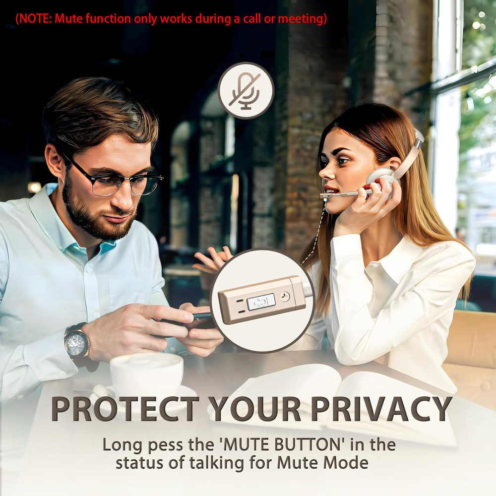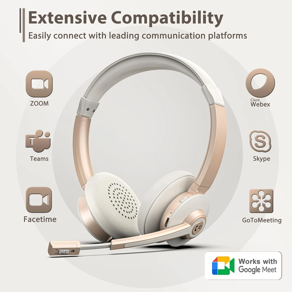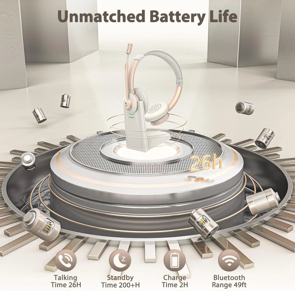 【Dual Connection & Qualcomm Chipset】Vonztek hands free office headset uses Qualcomm Bluetooth V5.0 Chip. Boost your efficiency with the ease of connecting two devices at once. Effortlessly transition between computer meetings and incoming phone calls. With an impressive coverage of up to 33 feet, the bluetooth range grants you the flexibility to move around during calls and video conferences. 【AI Noise Cancellation & Mute Mode】Our wireless headset with mic utilizes advanced ENC technology to effectively cancel up to 99% of ambient noise. Your voice will be heard loud and clear in all your calls, no matter how noisy your surroundings It is the perfect choice for remote workers. With the mute button, you can mute your voice freely at any time on a call, protecting your privacy (Mute only works during a call or meeting) 【USB Dongle & Stable Connectivity 】Accompanied by a Bluetooth dongle catering to device without built-in Bluetooth capability. Compatible with popular platforms like Webex, Zoom, MS Teams, etc. Due to the power of the advanced QCC3040 Bluetooth chip, our wireless computer headset assure unwavering connections with low latency. Perfectly suited for real-time audio experiences such as music playback and video conferences. 【Adjustable Headset & Comfortable to Wear】The padded headband of the wireless headset with microphone for pc is adjustable and stretchable to fit your head perfectly, suitable for both children and adults. Soft protein memory foam ear cushions are made with premium breathable material, ROHS certified material prevents ear heat and sweat. The 270° rotatable microphone can be used on the right or left side. The adjustable headband can be adjusted freely to ensure the best fit and ideal size. 【Long Battery Life with Charging Dock】Wireless headset with mic for work provide up to 26 hours of continuous talk and 160hours of standby time on a single charge. In addition, this laptop wireless headset comes with a plug-and-play charging dock, which you can use for wireless charging or a TYPE-C charging cable. It's perfect for both office shifts and long road trips.