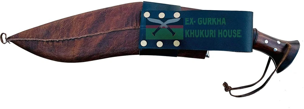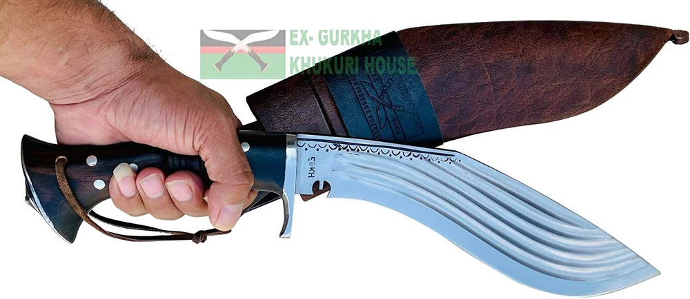 WELCOME TO EX-GURKHA KHUKURI HOUSE Ex-Gurkha Khukuri House is the finest and largest Khukuri /kukri maker/Manufacturer/Retailer in Nepal. Please contact us for wholesale kukri pricing. Dealing in The Genuine Gurkha Kukri directly from the Home Land Of The Gurkhas! CLEARANCE SALE 50% OFF 12” 5 fullers Blade Full Tang Khukuri, Farmers Working Knife :- About 12” 5 fullers Blade Full Tang Khukuri, Farmers Working Knife : - This is a 12" panawal full tang ganjawal 5 fuller Kukri is one of the latest product of EGKH . The "fuller" minimize the unnecessary weight of the blade and demonstrate of pure skill and expertise that makes kukri not only beautiful home decor but also the best working tools by equally distributing the impact/pressure felt by the edge when slammed against an object, timber, firewood, cleaning bushes, and chopping bones, etc. The notch (kaura or kaudi) in the blade near the hilt of most khukuri serves as a conduit for the blood on the blade to drip out as well as a device for catching and neutralizing any enemy blade. The handle is made from a mixture of rosewood. It has a full flat tang blade which means that the metal of the blade fully goes through the handle to the end for maximum strength and horn and Water Buffalo bones are glued to the handle part and further riveted with white metal to strengthen the whole fixture. The blade is made from highly graded carbon steel. A metal hand guard is attached just above the handle at the bottom of the blade of the kukri which is known as Kabjawal for the safety of the user. The sheath is an artistic ganjawal design made from refined mountain yak leather. This is a handcrafted kukri therefore please note that each one might have slight variations in measurement. Blade Size and Type: 12-inch (30.48) unpolished blade, Handle Size and Type: 5.5 inches (13.97 cm) Rosewood full Tang. Overall: 17.5 inches (44.45 cm) thickness: 11 mm Material Used: Highly Graded Carbon Steel for the blade mountain yak leather in ganjawal design for the sheath bone and horn for the Handle, and Pinewood for the Scabbard (inside). Where this Kukri is Made? The origin of the Kukri is in Nepal. Dharan is a small Gurkha town that is located in eastern Nepal. Dharan is a very famous and important place for Gurkha recruiting. We have our own factory in Dharan, there are over 200 blacksmiths (metal smiths, Kamis). And all the Kukri they made by hand. This is a handcrafted kukri therefore please note that each one might have slight variations in measurement * Material Used: Highly Graded Carbon Steel 5160, water Buffalo Leather for Scabbard(outside) and rosewood for the Handle, Pinewood for the Scabbard (inside), Brass, and "Laha" ( Nepali Traditional Glue). * Place Of Origin: EGKH Factory in Dharan (East Nepal) * Steel Hardness : spine=22-25 RC, belly=45-46 RC, edge=58-60 RC * Karda & Chakmak: These are small knives that come with Kukri. Karda is a small knife used for skinning animal hairs. And Chakmak is used of sharpening the Kukri blade in its blunt. When you bid or buy this In order you will also get these two unique knives. * Wooden Stand: The wooden display stand shown is made of Rosewood and very smooth finishing. If you wish to get a wooden display stand, it cost you an additional $ 10.00 and will ship in a single shipment with Kukri with NO additional. * Please note: Please contact us before your payment so that you can make one single payment for a kukri & wooden display stand. * For Foldable wooden Display Stand $10 additional charge. Please Note: We listed The Kukri Stock clearance 50% OFF Sale price so we will not accept returns or exchanges for this product, The kukri is brand new very good condition, Scabbard, and two small Utility Knives are included in the Sale price. Problems........??? please, before leaving negative feedback, contact us and allows us to try to correct the problem. If you have any queries please don't hesitate to contact us . Strictly for Over 18?s Only We may request a copy of your ID to verify your age before we ship the item EGKH since 1999 in Nepal Genuine Gurkha Kukri Knives From the Homeland Of Gurkha In Nepal. Buy with Confident, the Quality & Authenticity are 100% Guaranteed THANK YOU VERY MUCH FOR VISITING