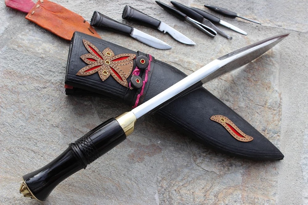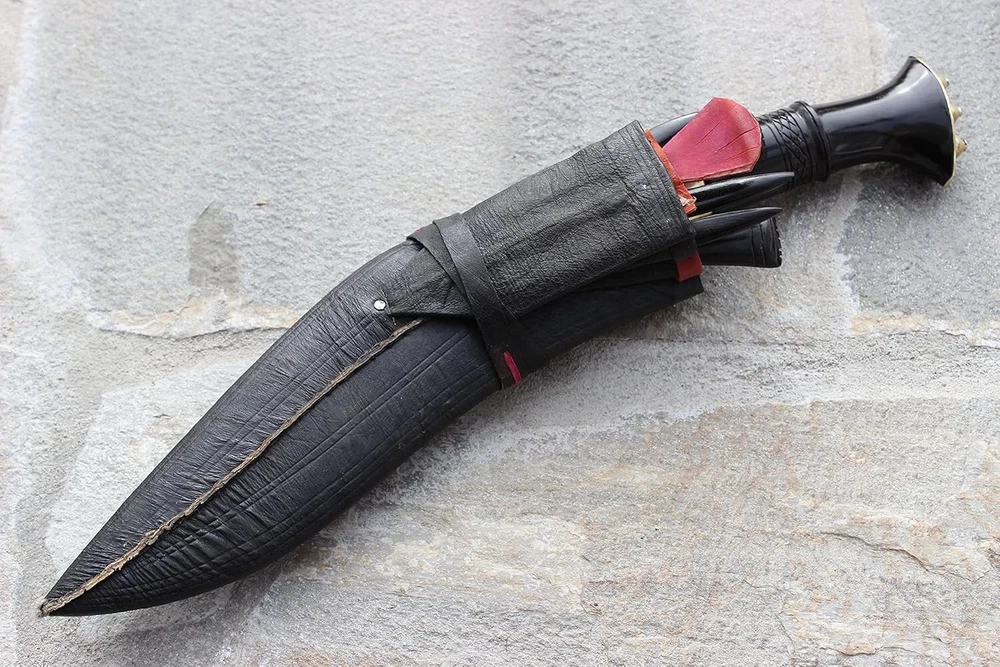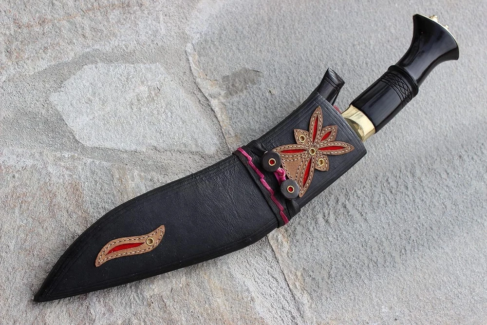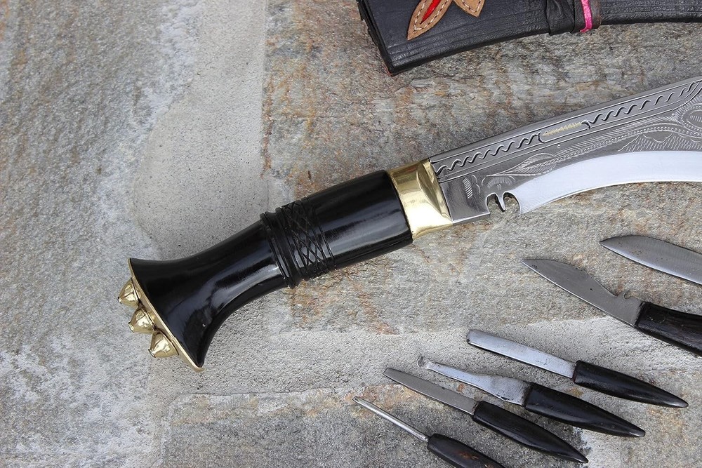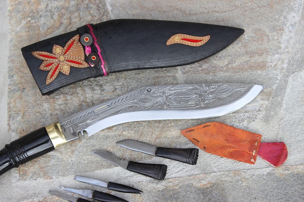 WELCOME TO EX-GURKHA KHUKURI HOUSE Ex-Gurkha Khukuri House is the finest and largest Khukuri /kukri maker/Manufacturer/Retailer in Nepal. Please contact us for wholesale kukri pricing. Dealing in The Genuine Gurkha Kukri directly from the Home Land Of The Gurkhas! CLEARANCE SALE 50% OF 11" Gangawala Traditional Engraved Kukri :- About this item EGKH Nepal company is owned and run by Ex Veterans who supply hand-forged high-quality kukris blades all around the world 11" Blade with 5" " horn handle, Overall length 16 Inches, Thickness about 10 mm at Upper Spine Handcrafted in the EGKH factory outlet in Nepal by famous & very skilled blacksmiths using very high-quality materials in a very traditional manner. 100% Quality Warranty, each blade comes with EGKH marked on the blade and our quality warranty certificate. Hand Forged High Graded carbon steel blade, 5160 Razor Sharp blade, Easy to sharp, Balance water tempered for daily work Blade Steel Hardness : Spine = 22-25 RC, belly = 45-46 RC, edge = 54-55 RC * Origin: Hand Forged at EGKH factory Outlet in Kathmandu, Nepal. History of Ganjuwala Khukuri With the history and origin of the kukri dating back to the 18th century, Gajuwal was and still is one of the famous and favored kukri knives within the villagers and farmer’s community. The knife proved to be more useful, like a utility tool, because of its exclusive construction/feature when villagers had to make long journeys into woods away from home. Thus, the kukri was excessively used and selected for the very reason. The original “Ganjuwala” (what it was called then) used in history has been long gone during time and civilization therefore a replicated (authentic and usable) version of it, the “Ganjuwal Swiss” has been introduced by EGKH. Nepal-Ganjuwal-kukrI Villagers selling Ganjuwal khukuri, ca 1963 Bhojpur SaveThe kukri blade has also been slightly modified to meet the demand and market of the modern era (blade shortened and polished, decorative pattern introduced). The Ganjuwal still holds its legacy as a perfect utility tool and also a precious possession of a farmer in the rural villages of Nepal. The blade of the Ganjuwal is a standard-sized kukri knife but with three keepers in the pommel to reinforce the handle fixture. The scabbard of the Ganjuwal Swiss is where all the time, effort, and money is invested. The making or preparation of this special kind of buffalo leather is a painstaking job that needs hard work and patience. It goes through several stages and requires numerous materials and supplies to complete the process, which, thus may not be possible to mention them all. Therefore briefly speaking, the buffalo hide is submersed in water mixed with salt and lime for almost a month and regularly rubbed by feet to soften the leather. Adding various natural herbs from the roots of plants and barks of selected trees is also one of the steps in the process done to prolong the life span of the leather and to avoid decaying. Then the prepared leather is again continuously rubbed, twisted, and folded for hours with “Tori ko Pina” (paste of mustard plant achieved after grinding) while making the scabbard to get the natural embossed pattern within the leather. The excessive rubbing of the leather results in tiny beads like mold all over the surface, which makes the scabbard distinctive, attractive, durable, and decay-free. Then traditional patterns and linings are overlaid in the scabbard to beautify its look. This simple yet attractive adornment of the Ganjuwal has been its trademark that distinguishes and recognizes the kukri from the rest. Accompanying tools Gajuwal’s number of accompanying tools along with the basics (Karda and Chakmak) also makes the kukri so different and special. Karda and Chakmak are made with special care and attention. A screwdriver, ear cleaner, tweezers, and needle complete the utility set of the Ganjuwal. A small leather pouch is also secured at the back of the scabbard’s throat to store small but important objects like flint powder, traditional medicine dust, etc. An extra empty hole or bag is also fitted, just in case an extra tool is needed. Included multi-utility tools 2 x small knives, 4 x small working tools, 1 x storing pouch, and 1 x extra bag NOTE: Here we would like to caution that the multi-tools mentioned above are mere replicas of the original ones and do not function well as the main purpose is to exhibit the tools from the past. In today’s context much better and cheaper modern replacers are already avail in the market if it has to be used. Materials / Features: leather scabbard, rosewood handle Where this Kukri is Made? The origin of the Kukri is in Nepal. Dharan is a small Gurkha town that is located in eastern Nepal. Dharan is a very famous and important place for Gurkha recruiting. We have our factory in Dharan, there are over 200 blacksmiths (metal smiths, Kamis). And all the Kukri they made by hand. This is a handcrafted kukri therefore please note that each one might have slight variations in measurement * Steel Hardness : spine=22-25 RC, belly=45-46 RC, edge=58-60 RC * Wooden Stand: The wooden display stand shown is made of Rosewood and very smooth finish. If you wish to get a wooden display stand, it costs you an additional $ 15.00 and will ship in a single shipment with Kukri with NO additional. * Please note: Please get in touch with us before your payment so that you can make one single payment for a kukri & wooden display stand. * For a Foldable wooden Display Stand $15 additional charge. Please Note: We listed The Kukri Stock clearance 50% OFF Sale price so we will not accept returns or exchanges for this product, The kukri is brand new excellent condition, The Scabbard, and two small Utility Knives are included in the Sale price. Problems........??? please contact us before leaving negative feedback and allow us to try to correct the problem. If you have any queries please don't hesitate to contact us . 