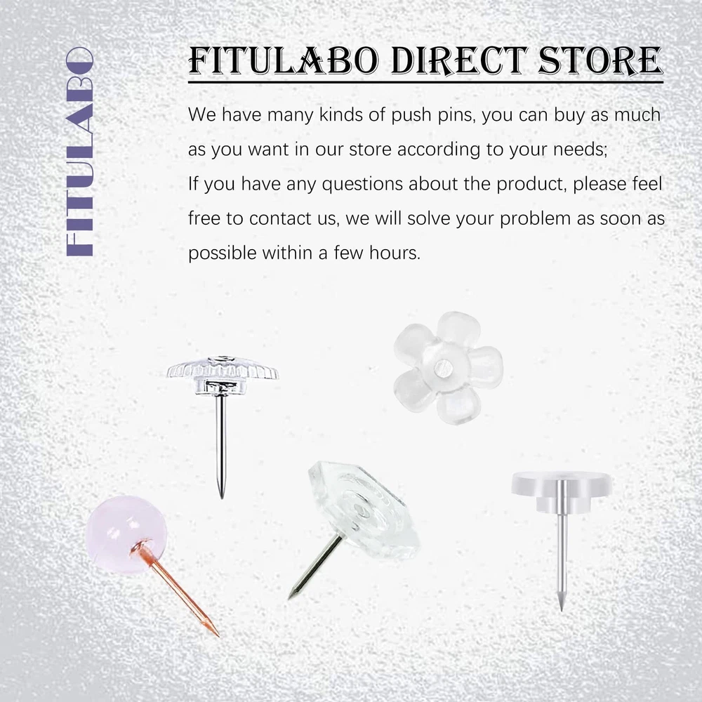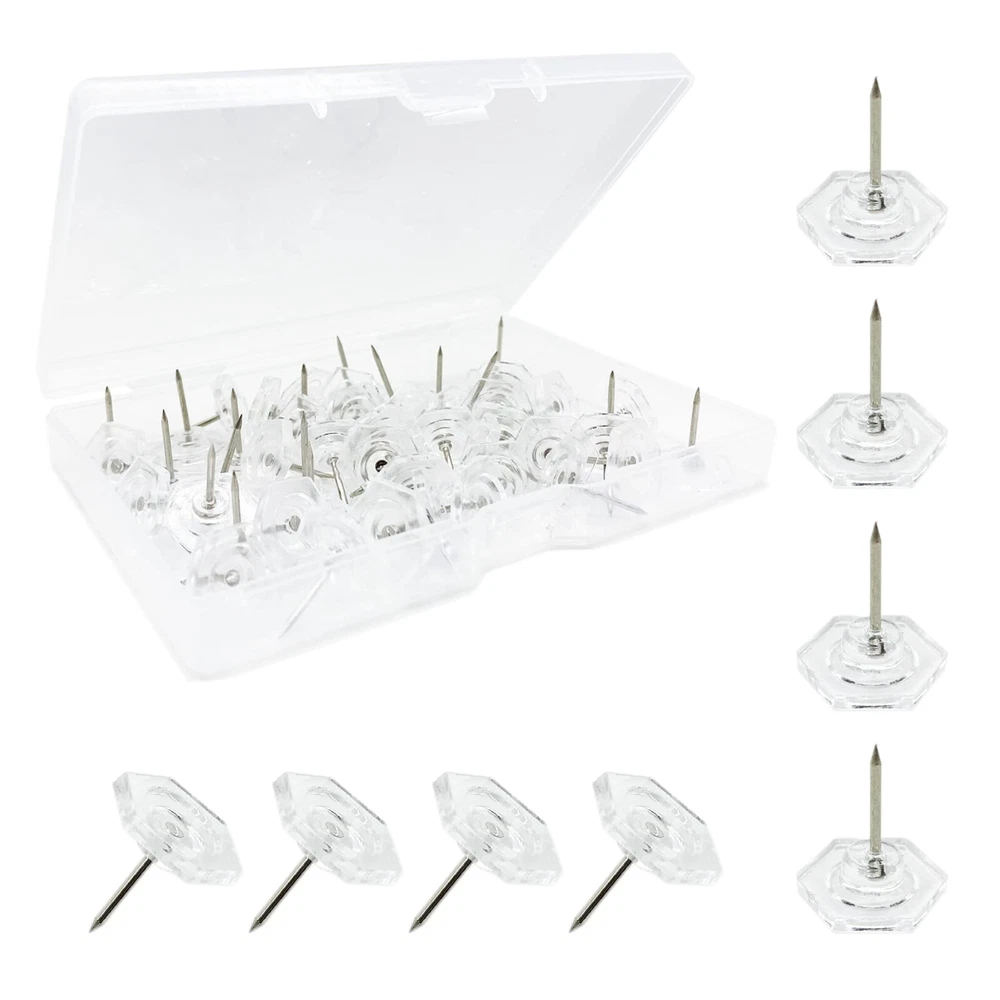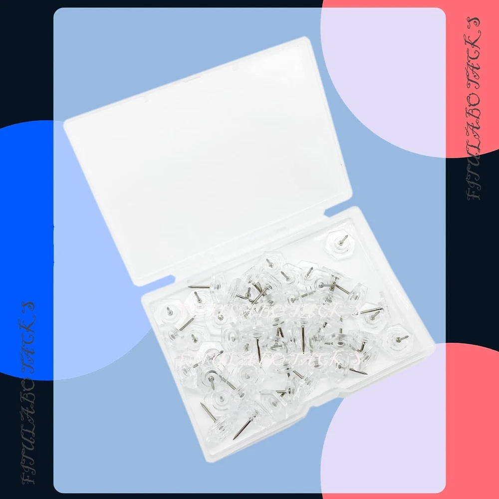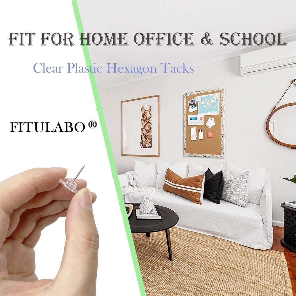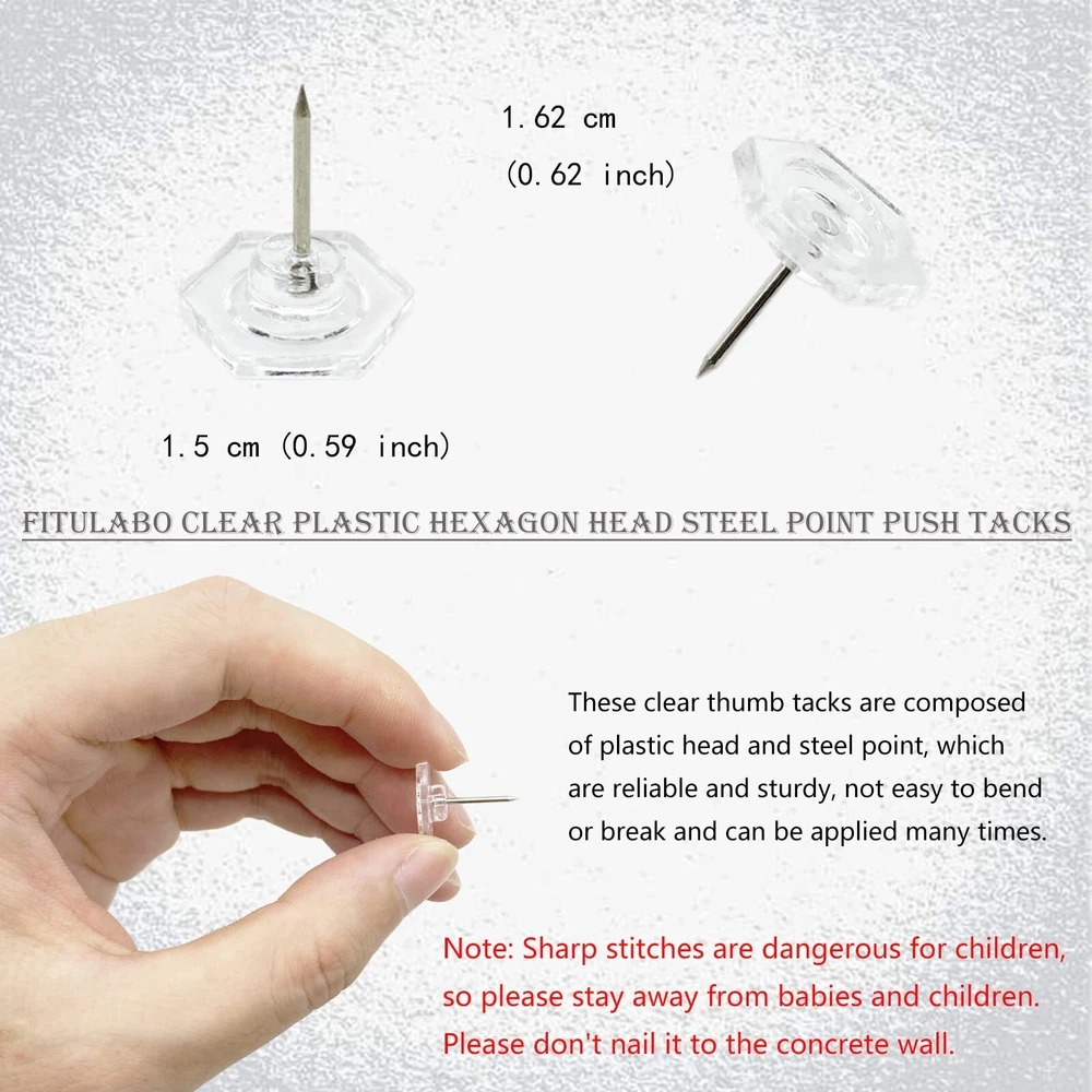 50 PCS Plastic Push Pins, Plastic Head Thumb Tacks for Wall, Steel Point Bulletin Board Tacks for Maps, Calendar, Posters, Photos Product Details Material: Plastic Brand: FITULABO Number of Pieces: 50 UPC Package Dimensions: 4.13 x 2.8 x 0.75 inches Item Weight: 1.13 ounces Manufacturer: WEHOMER Country of Origin: China Item model number: OS00361PP50 Date First Available: June 21, 2022 Practical tools: The wall thumb tacks can be reused for many times and do not need to be replaced often; these clear push pins are suitable for paper, notes, photos, pictures, posters, maps and other lightweight items on cork boards. Quality material: These clear thumb tacks are composed of plastic head and steel point, which are reliable and sturdy, not easy to bend or break and can be applied many times. Unique design: The standard pushpin has a clear plastic hexagon head. The simple design makes the wall pins look like an ornament, and the shape is beautiful and unique. Easy to Store and Carry: The push pins package in reusable clear tub to keep your desktop or your desk drawer organized, convenient for you to carry them to anywhere you want. Note: Sharp stitches are dangerous for children, so please stay away from babies and children. Please don't nail it to the concrete wall.